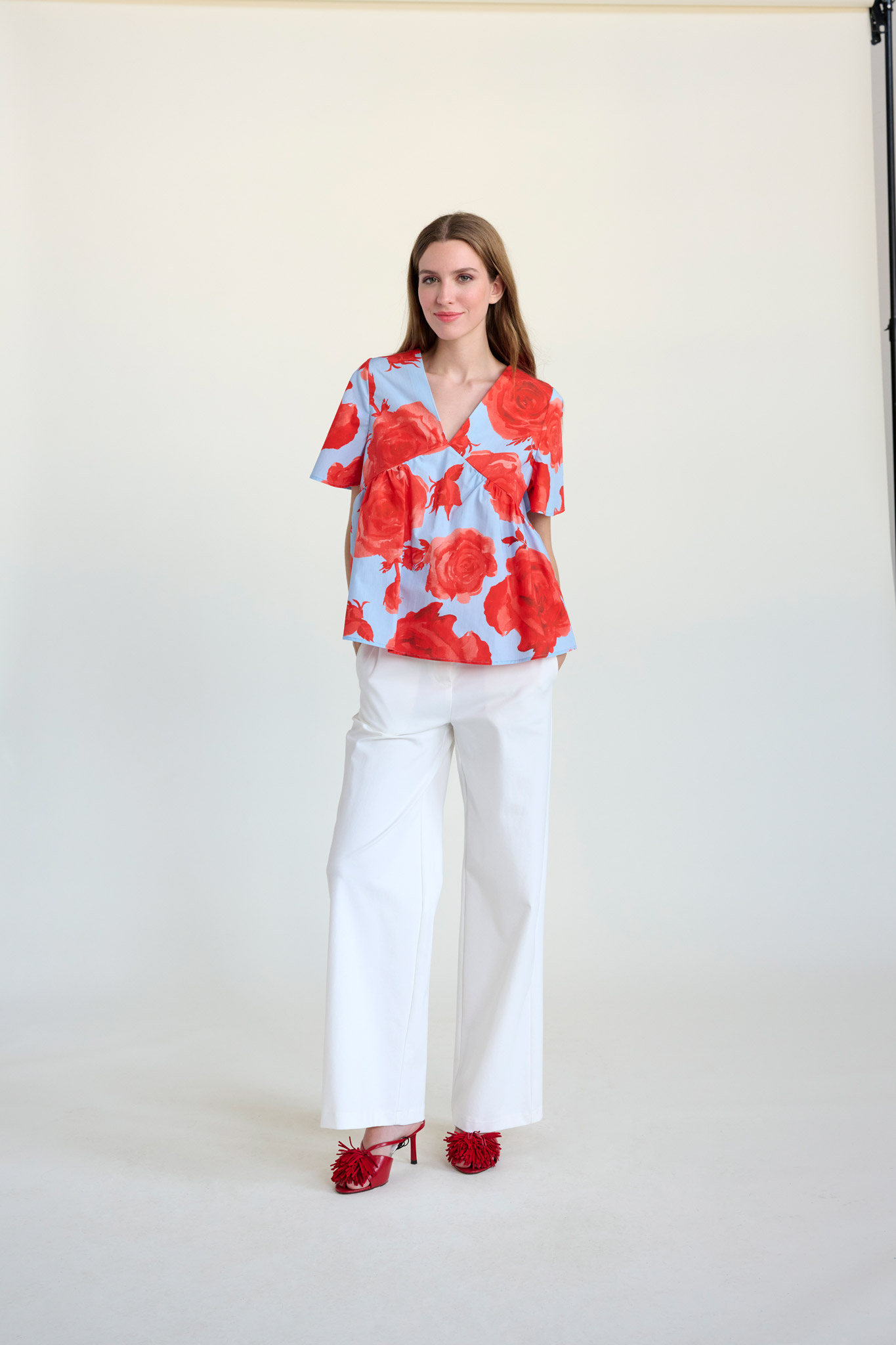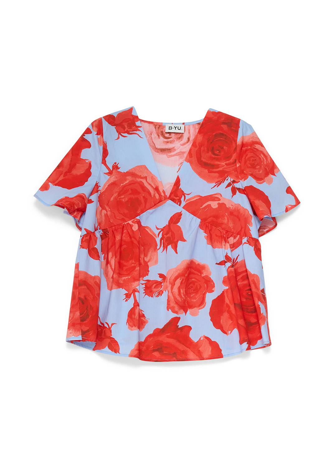 La blusa è l'espressione perfetta del romanticismo moderno. Caratterizzata dall'iconica stampa a rose macro che abbiamo già apprezzato nei pantaloni coordinati, questa camicia leggera è un pezzo versatile che porta una ventata di colore e freschezza nel guardaroba primaverile ed estivo. Le rose rosse sovradimensionate creano un contrasto cromatico vibrante con il fondo azzurro pastello, rendendo il capo un vero e proprio pezzo d'arte da indossare. Indossala in coordinato con il pantalone palazzo barrel della stessa linea BY010246 per un effetto "tuta intera" di grande impatto, oppure abbinala a queste altre proposte per un look più casual ma sempre ricercato: BY010258, denim.
