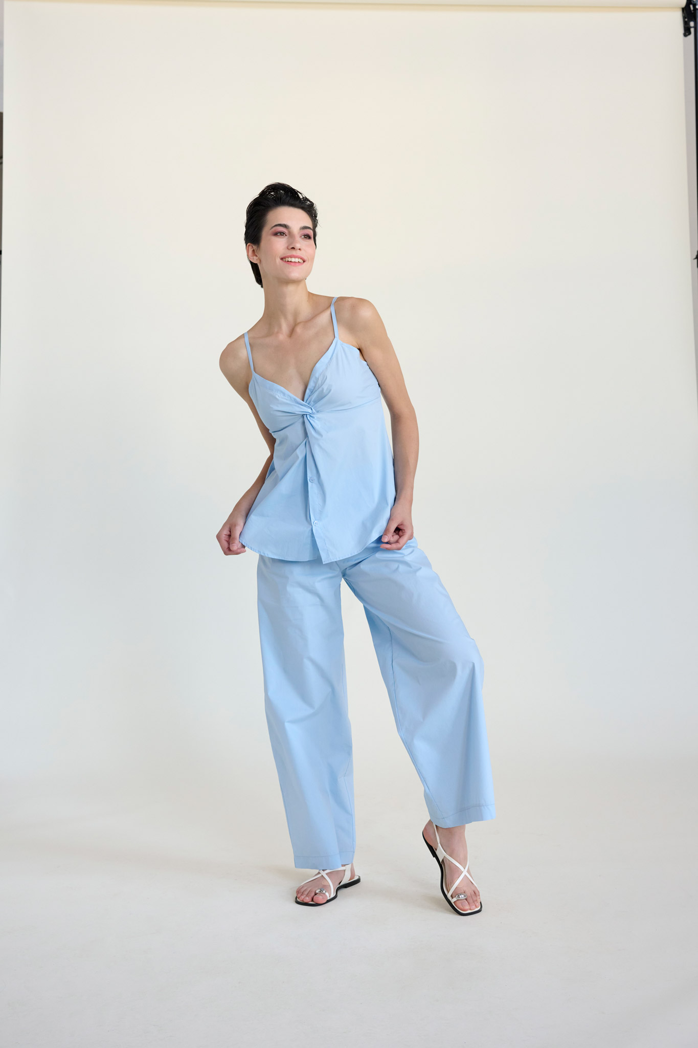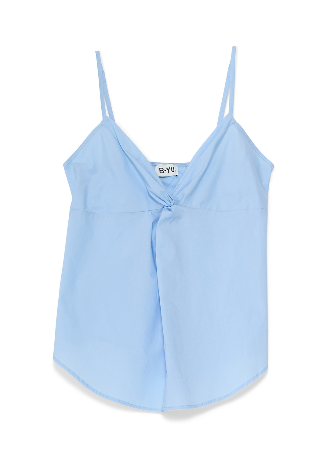Il top a bretelline di BYU è un capo versatile che unisce la semplicità di una canotta estiva a un dettaglio di design ricercato. Realizzato in una luminosa tonalità di azzurro, questo top è l'ideale per chi cerca un look fresco ma curato nei minimi particolari.  Il punto focale è il raffinato è il nodo centrale  sotto lo scollo a V, che crea un delicato movimento del tessuto e aggiunge tridimensionalità al capo.  Le spalline sottili e il taglio fluido garantiscono una vestibilità leggera, perfetta per affrontare con stile le giornate più calde.