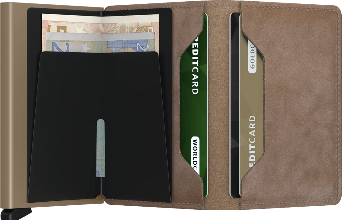 Slimwallet caratterizzato dall'apertura senza bottoncino così da essere più sottile comodo soprattutto per chi ha la necessità di indossarlo in tasca. In pelle linea Vintage dall'effetto leggermente invecchiato. Contiene: