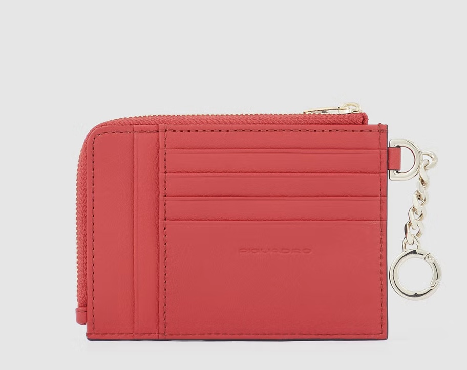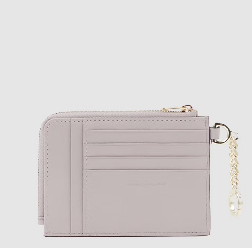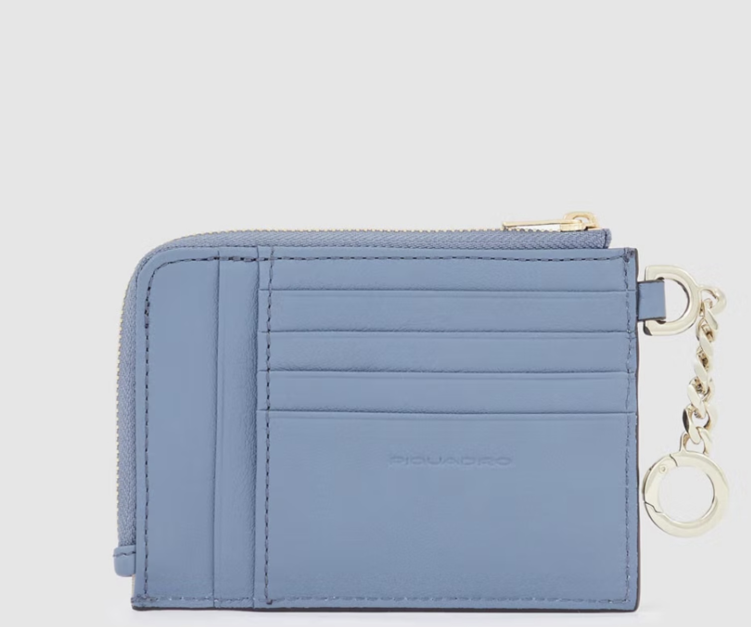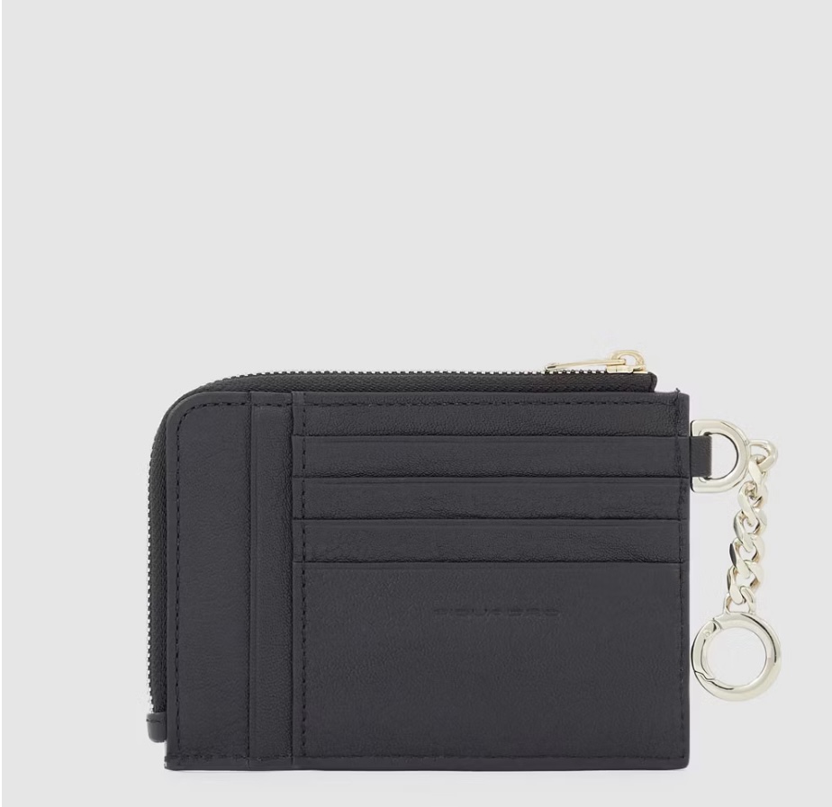 Portacarte in pelle con zip e protezione antifrode RFID. Slot per le carte di credito sia sul fronte che sul retro. Sul lato catenina con anello portachiavi. Mini zip per contenere le monete o qualche banconota piegata.