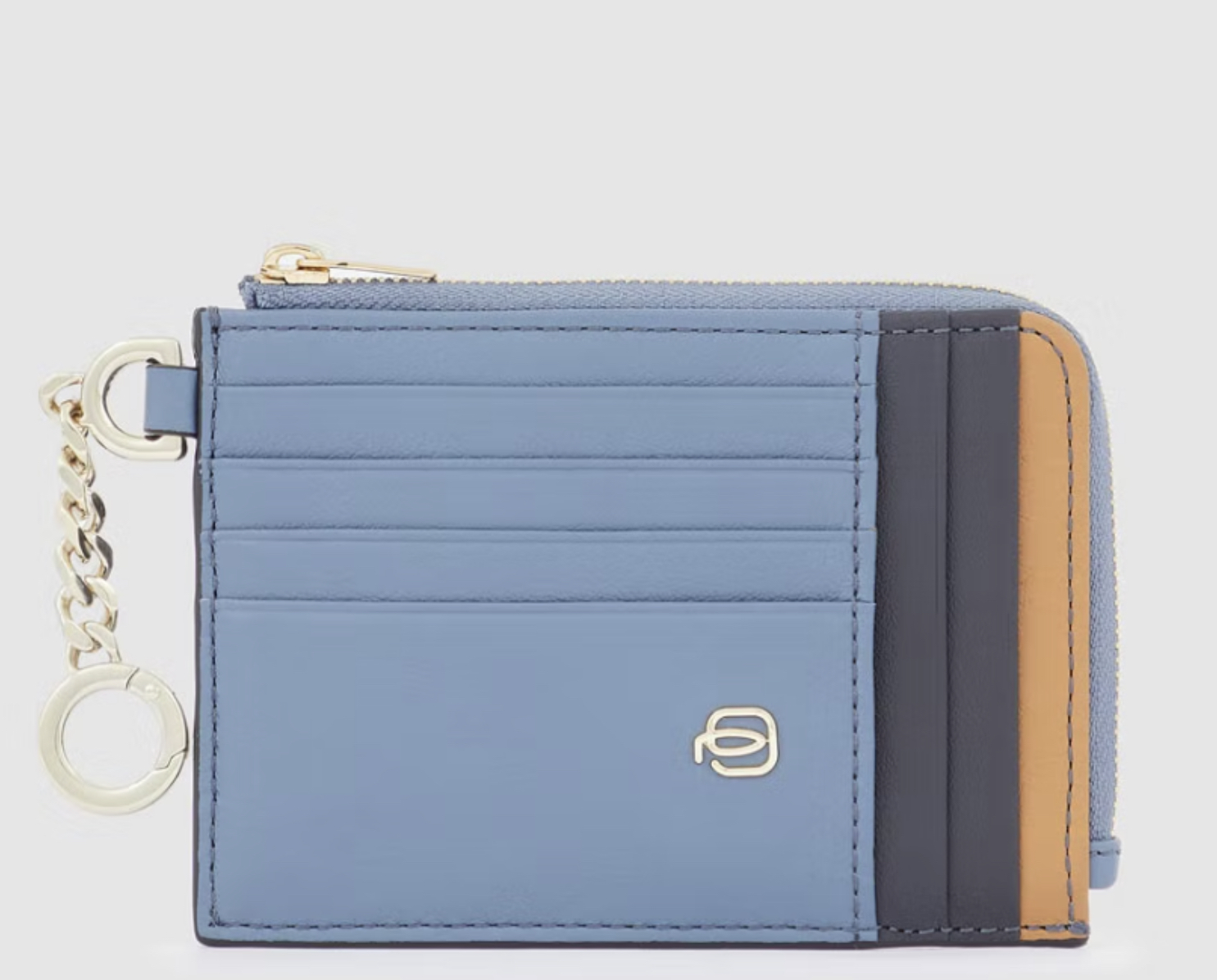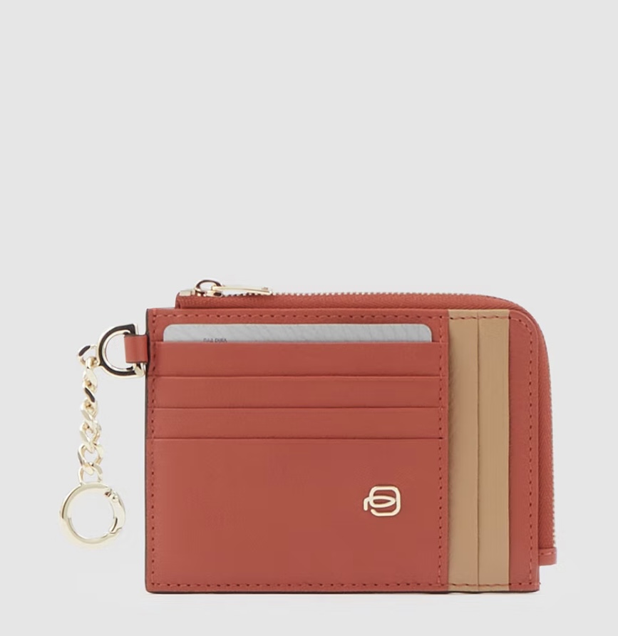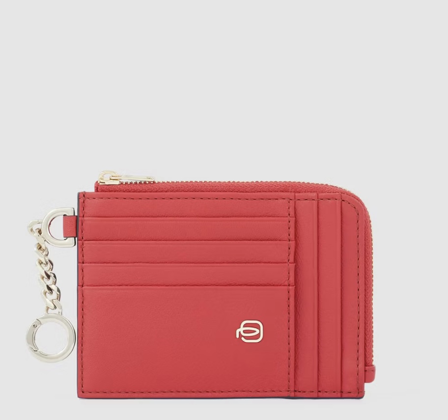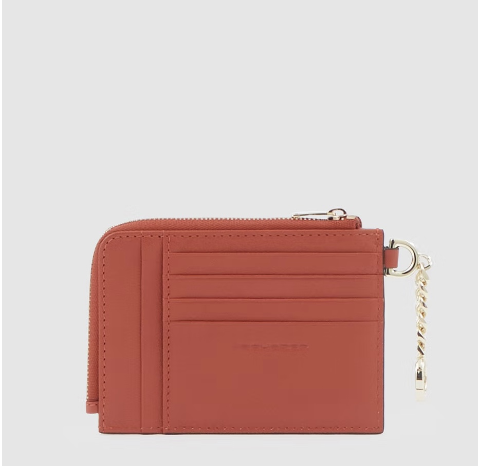 Portacarte in pelle con zip e protezione antifrode RFID. Slot per le carte di credito sia sul fronte che sul retro. Sul lato catenina con anello portachiavi. Mini zip per contenere le monete o qualche banconota piegata.