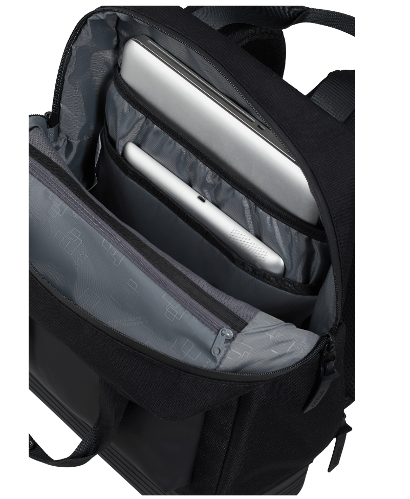Zaino in tessuto antipioggia e realizzato con 15 bottiglie riciclate post consumo, è perfetto per l'università, il lavoro ed il tempo libero (entra perfettamente nelle dimensioni standard di bagaglio a mano). Schienale imbottito ed ergonomico, spallacci regolabili, chiuso da cerniere. Internamente suddiviso con scomparto per pc da 15" e tablet.