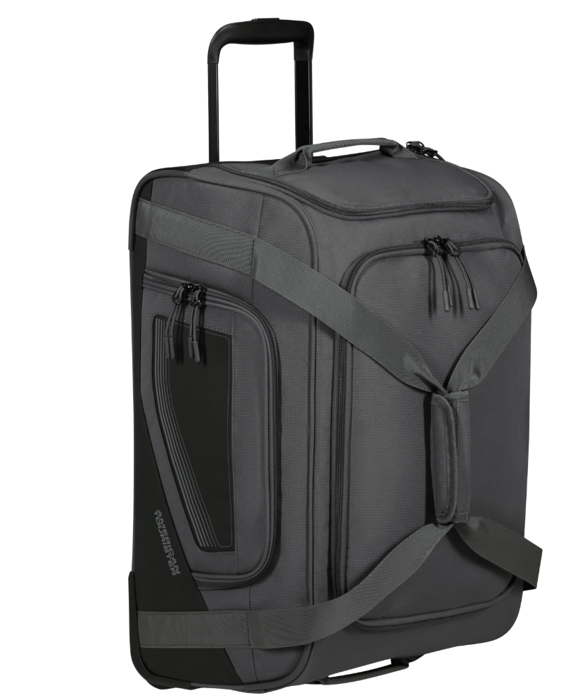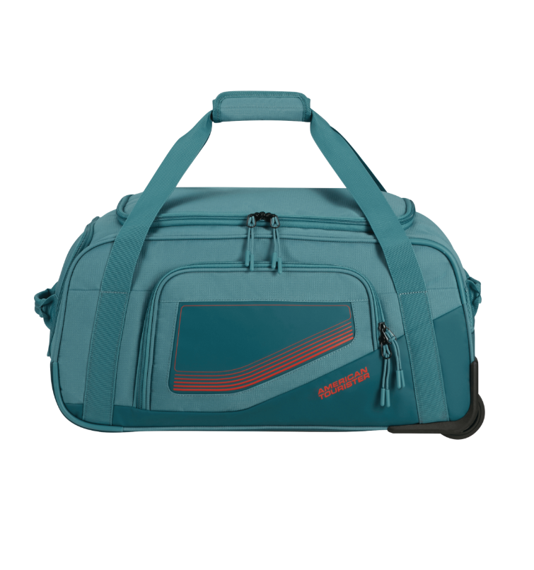 Borsone in tessuto con ruote, perfetto per il tempo libero e i viaggi. Tre aperture con cerniere, con bretella nel vano centrale. Leggerissimo anche da portare a braccio. Due ruote e sistema di traino in alluminio ultra light.