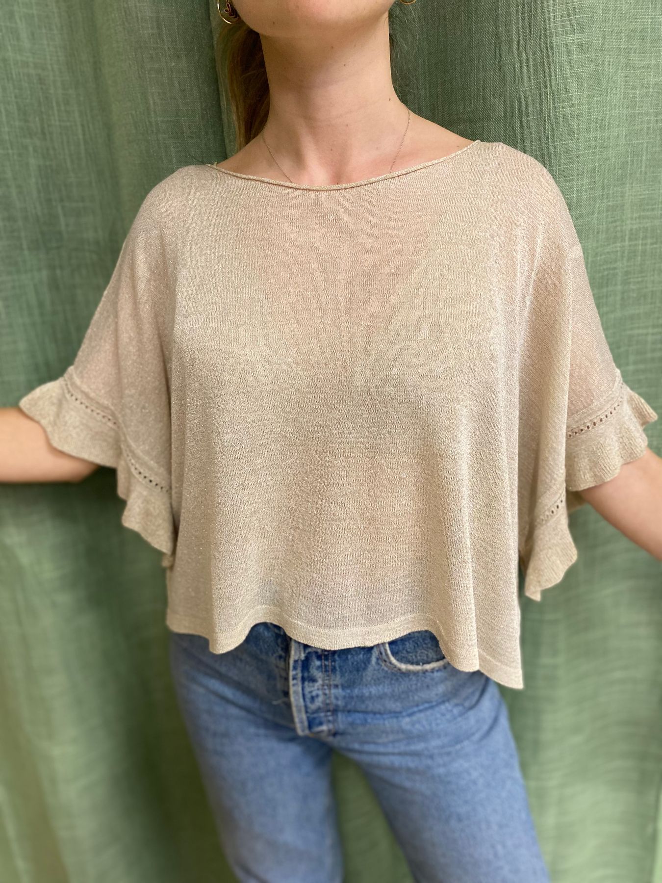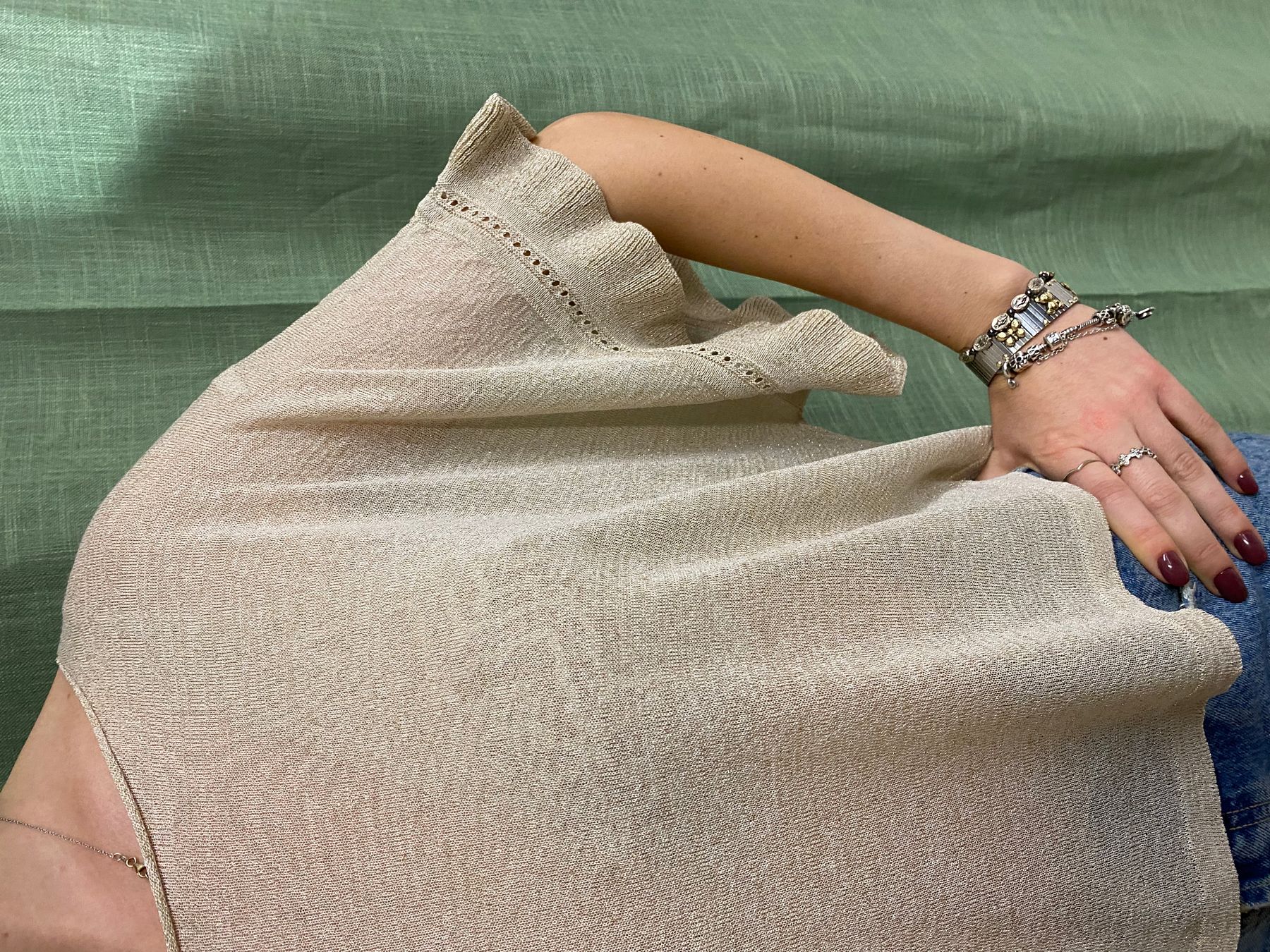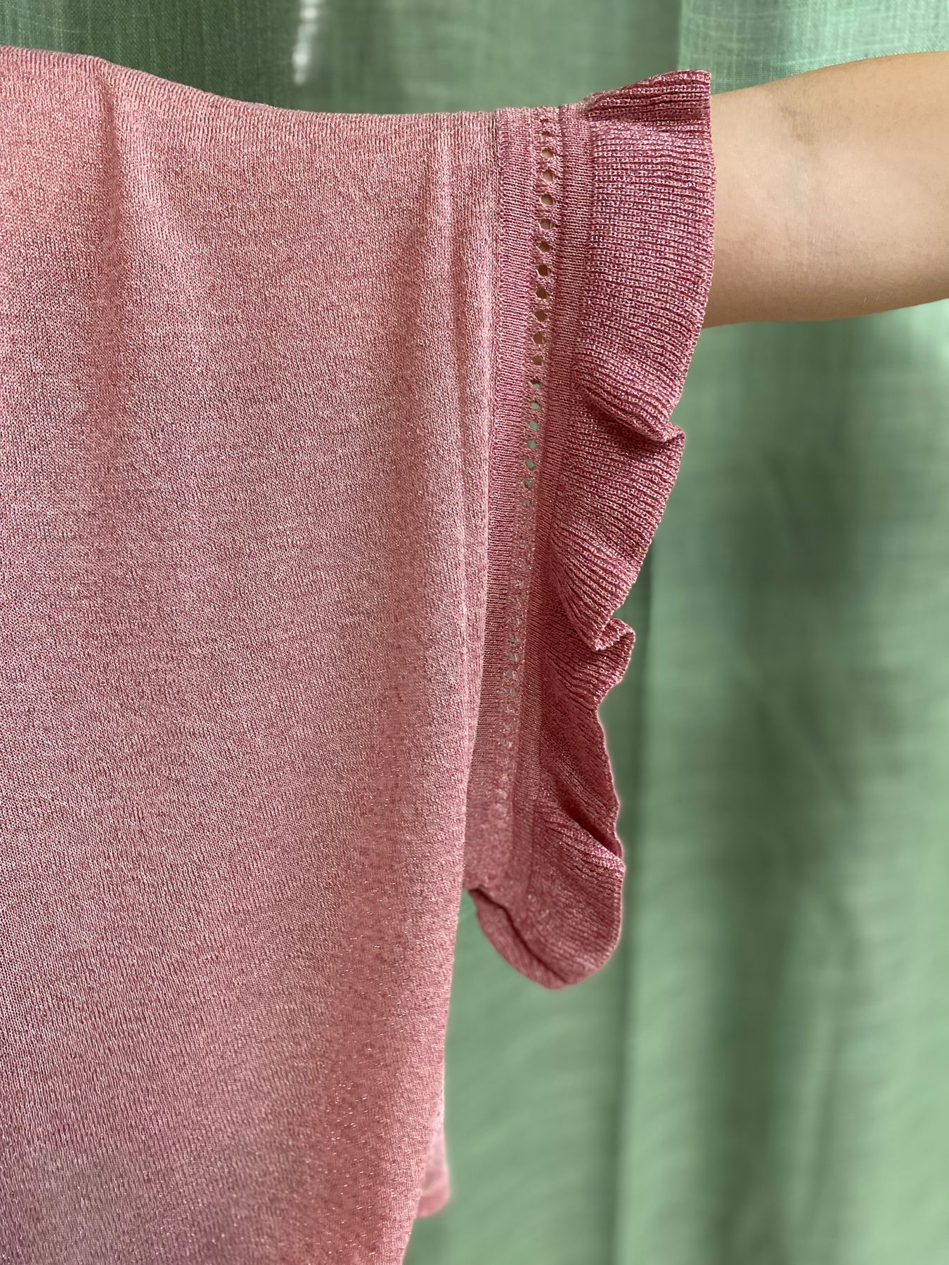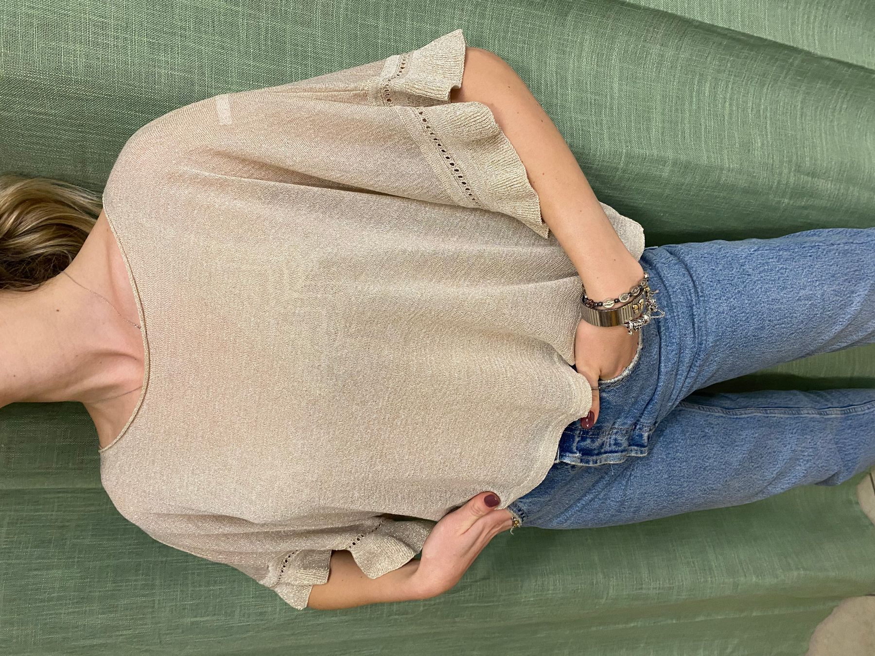 Maglia lurex con manica 3/4 con rouge finale, leggermente trasparente. Bella da indossare anche sopra un vestito scollato.