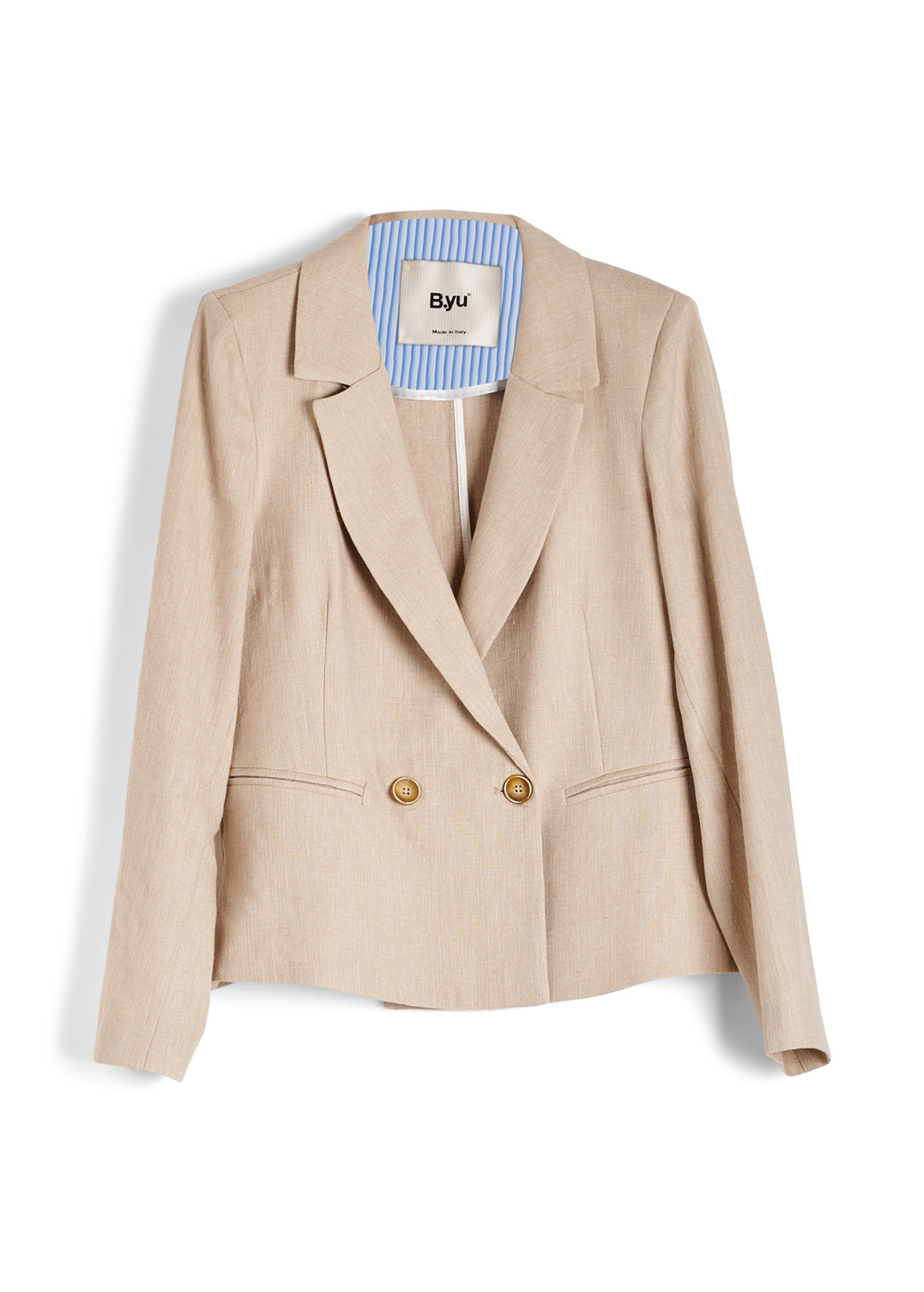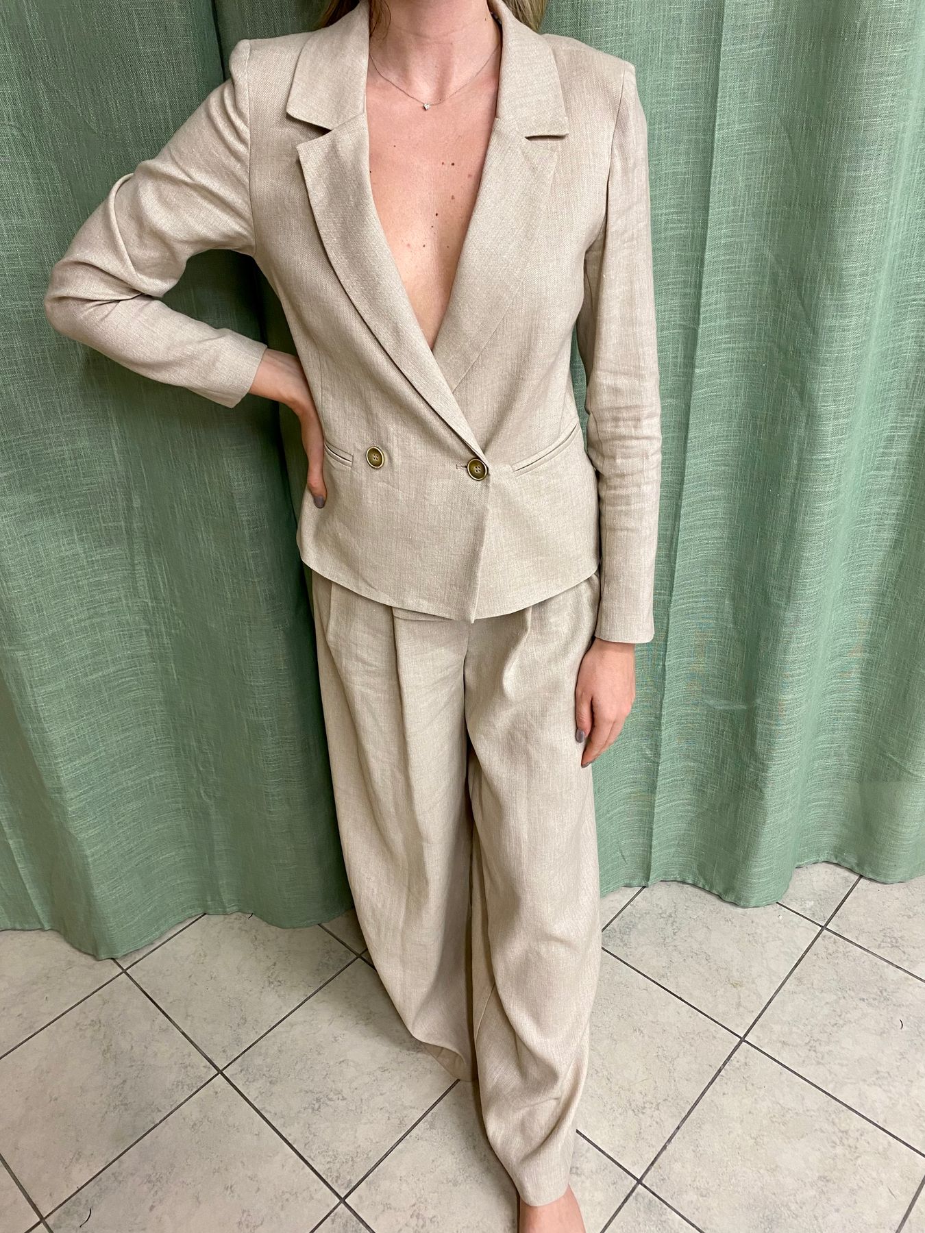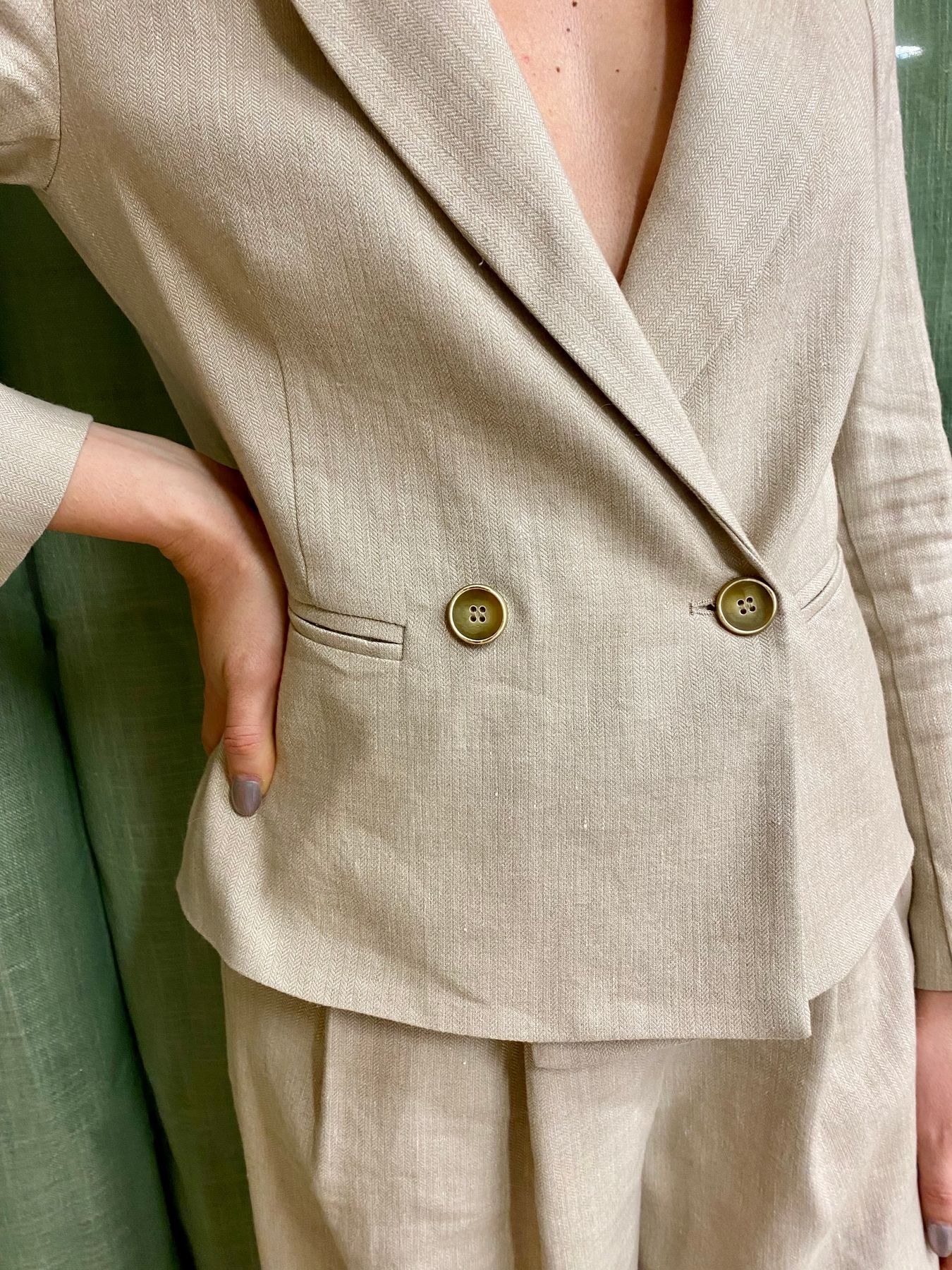 Giacca tailleur doppio petto, modello crop in lino dal leggerissimo effetto spigato.