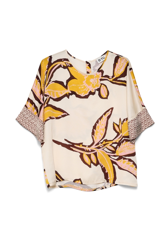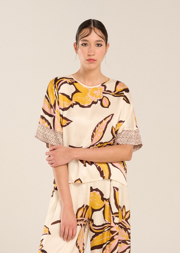 Blusa in viscosa con fantasia a contrasto di colore. Scollo classico a girocollo e mezza manica leggermente più lunga del normale che arriva quasi ad altezza gomito. Perfetta da indossare assieme al pantalone palazzo coordinato, oppure da abbinare ad un denim o pantalone bianco.