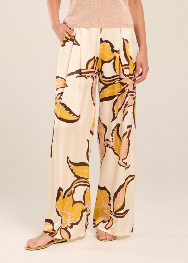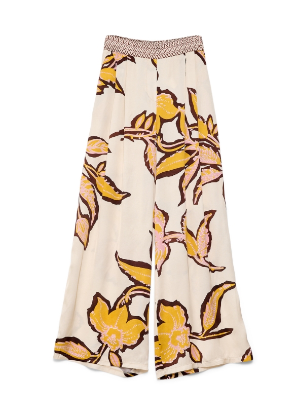 Pantalone in viscosa con fantasia a contrasto di colore. Elastico in vita. Comodo e leggero, perfetto da indossare con la blusa coordinata oppure con una tshirt così da renderlo più sportivo.