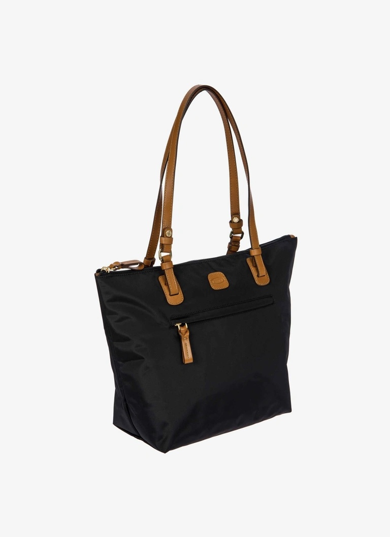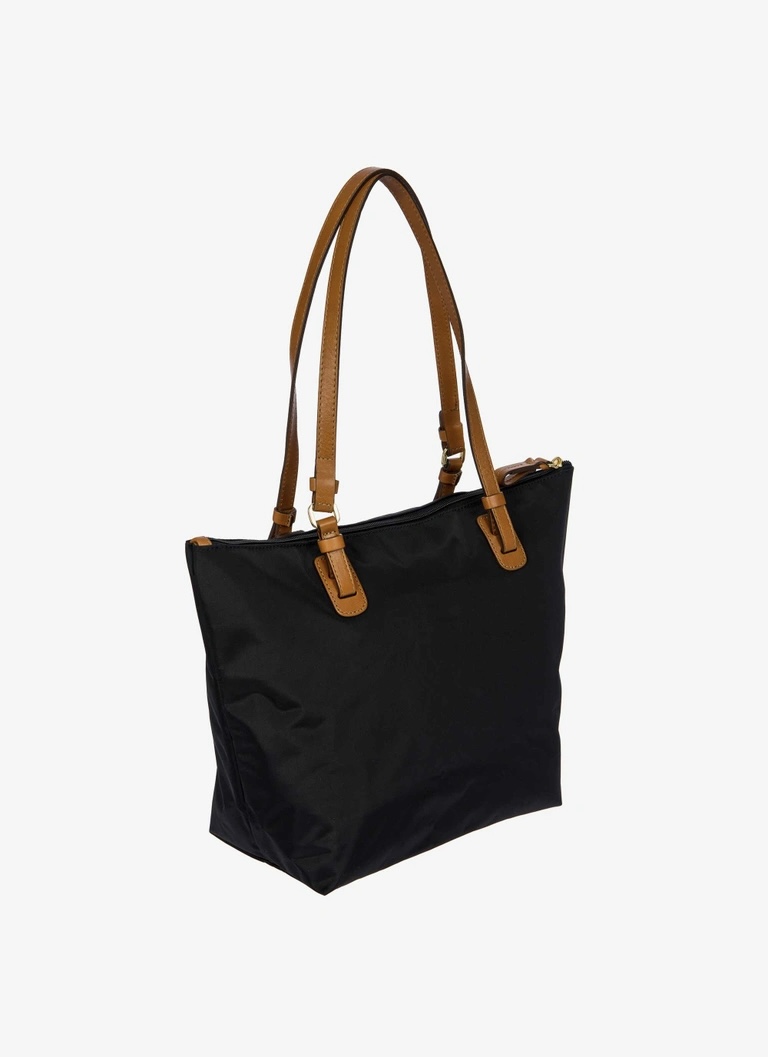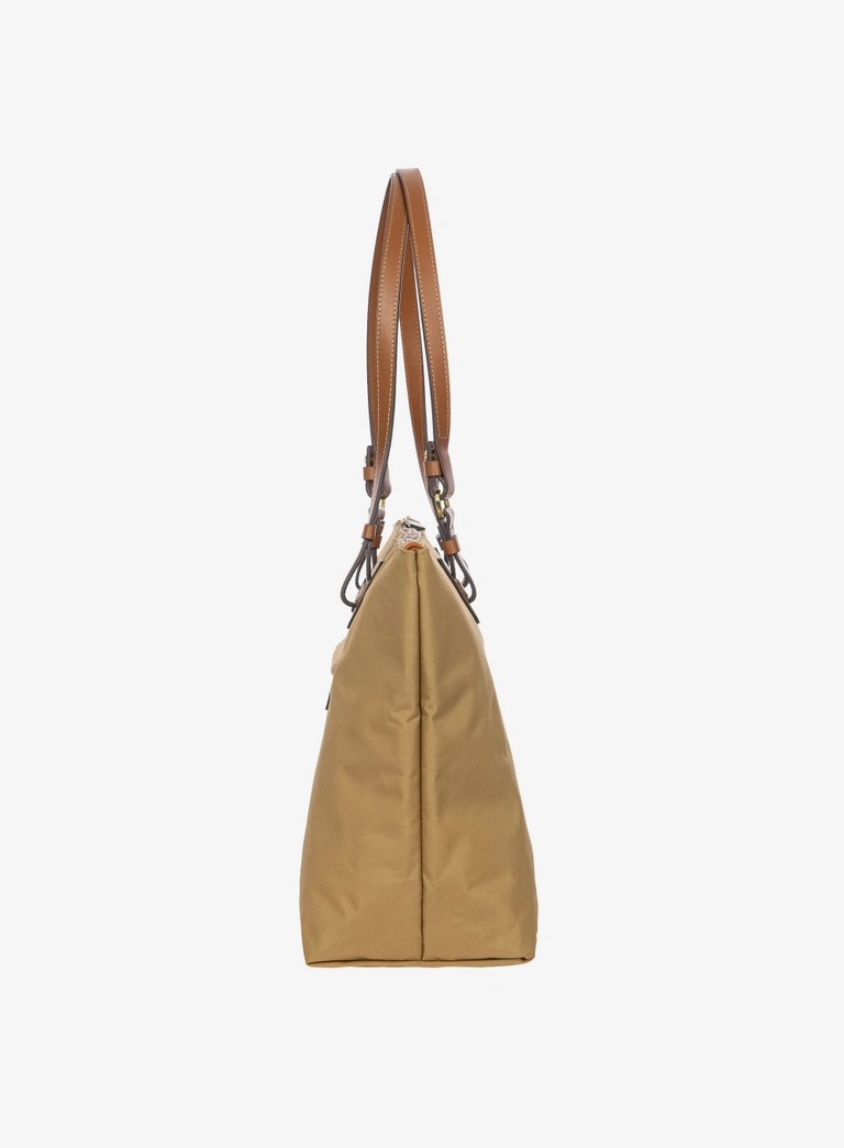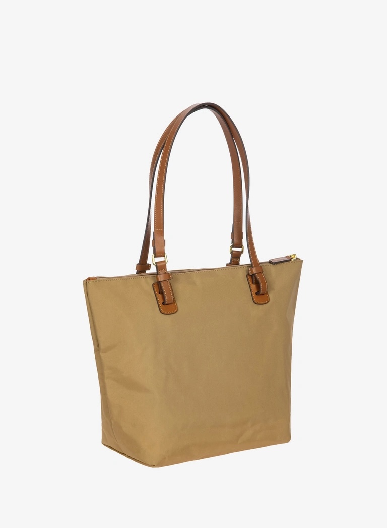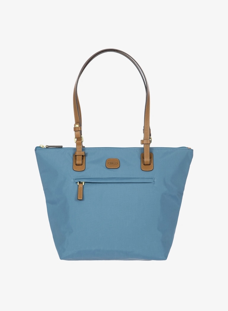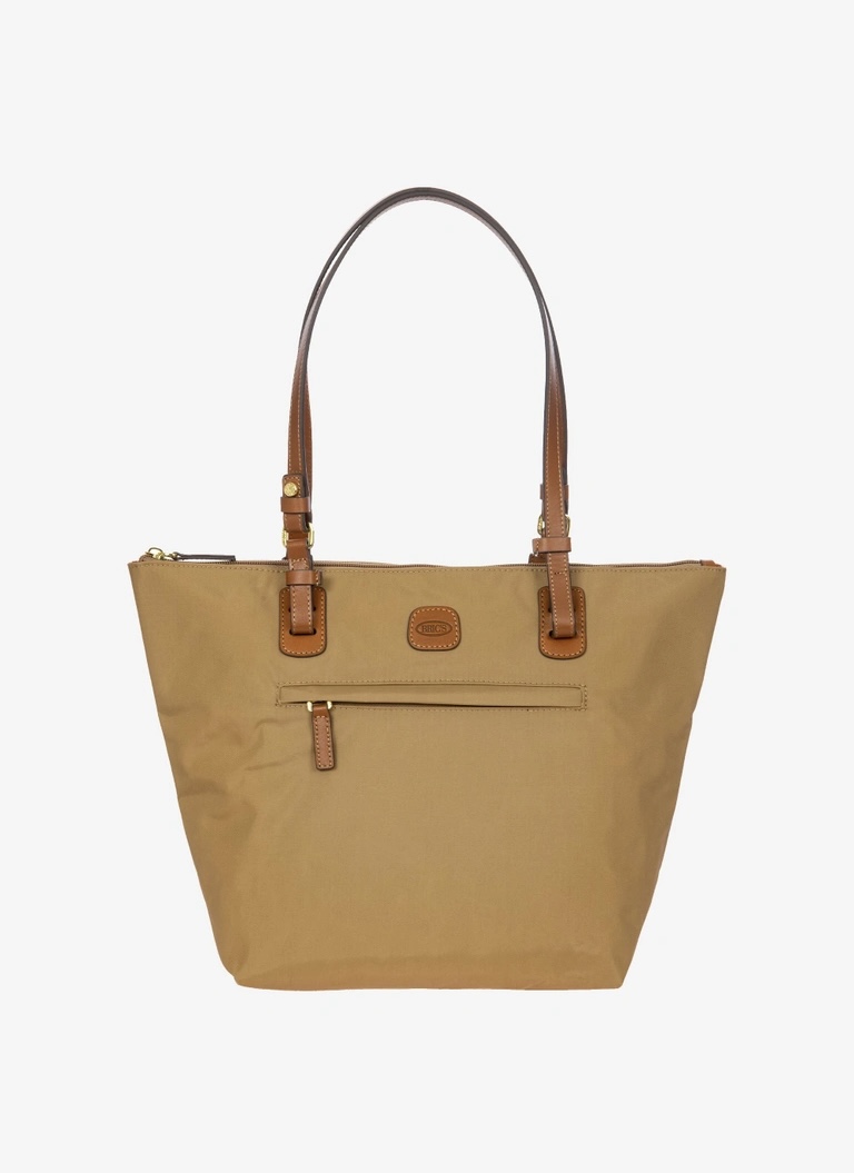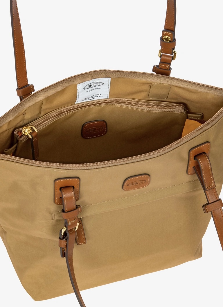 Shopping in tessuto nylon super leggero, chiusa con zip superiore e zip sul davanti comoda per gli oggetti a portata di mano. Tracolle in cuoio regolabili; internamente la tasca si stacca grazie ai bottoni e diventa o una minibag dotata di tracolla oppure la custodia per ripiegare la borsa su se stessa.
