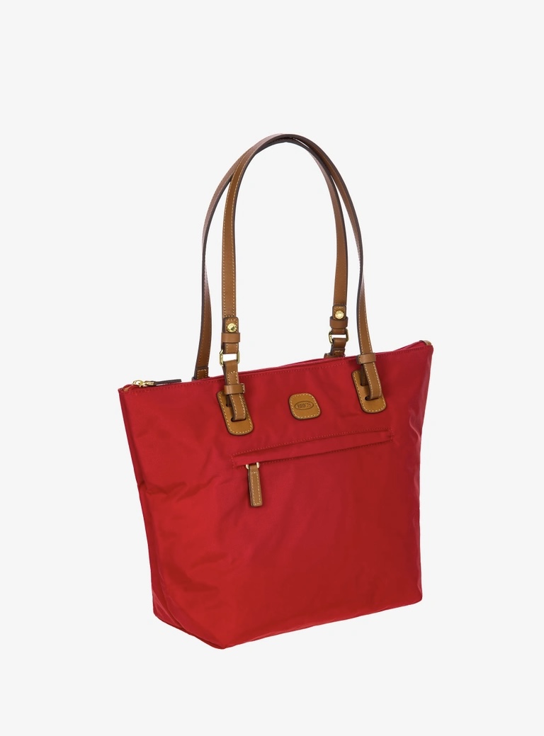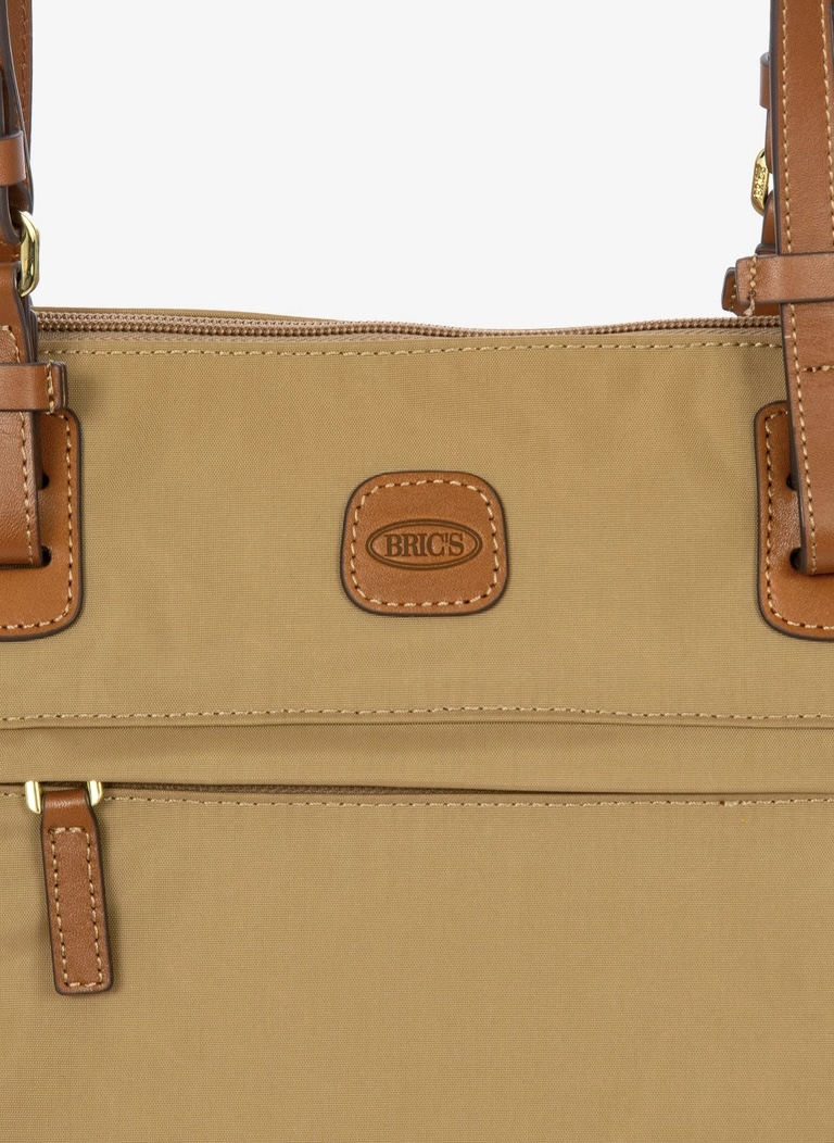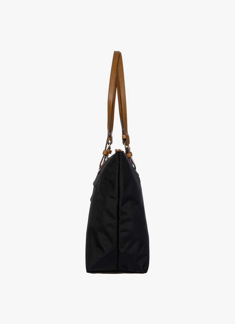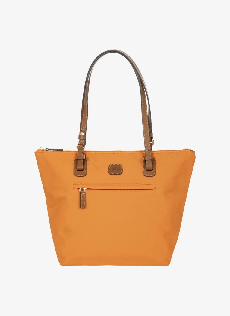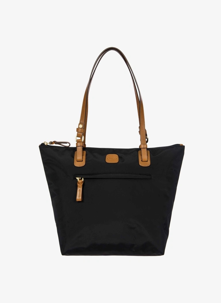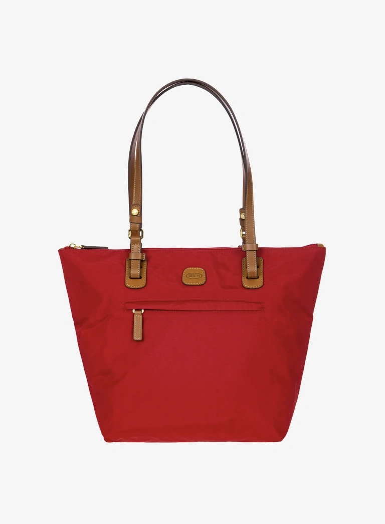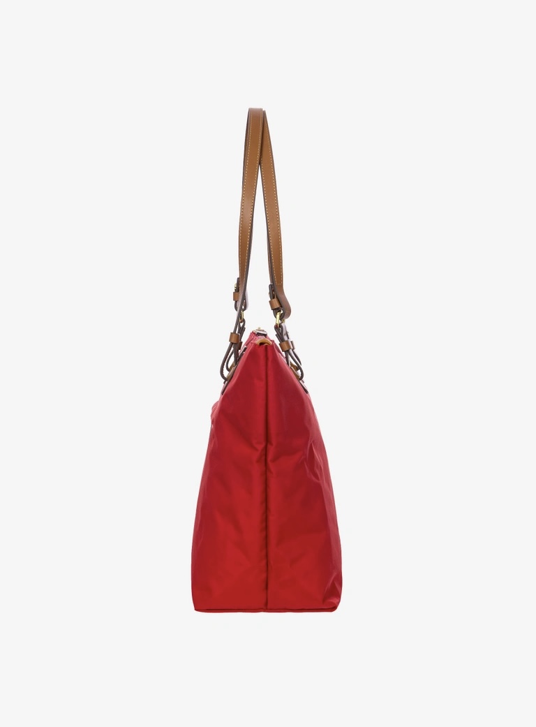 Shopping in tessuto nylon super leggero, chiusa con zip superiore e zip sul davanti comoda per gli oggetti a portata di mano. Tracolle in cuoio regolabili; internamente la tasca si stacca grazie ai bottoni e diventa o una minibag dotata di tracolla oppure la custodia per ripiegare la borsa su se stessa.
