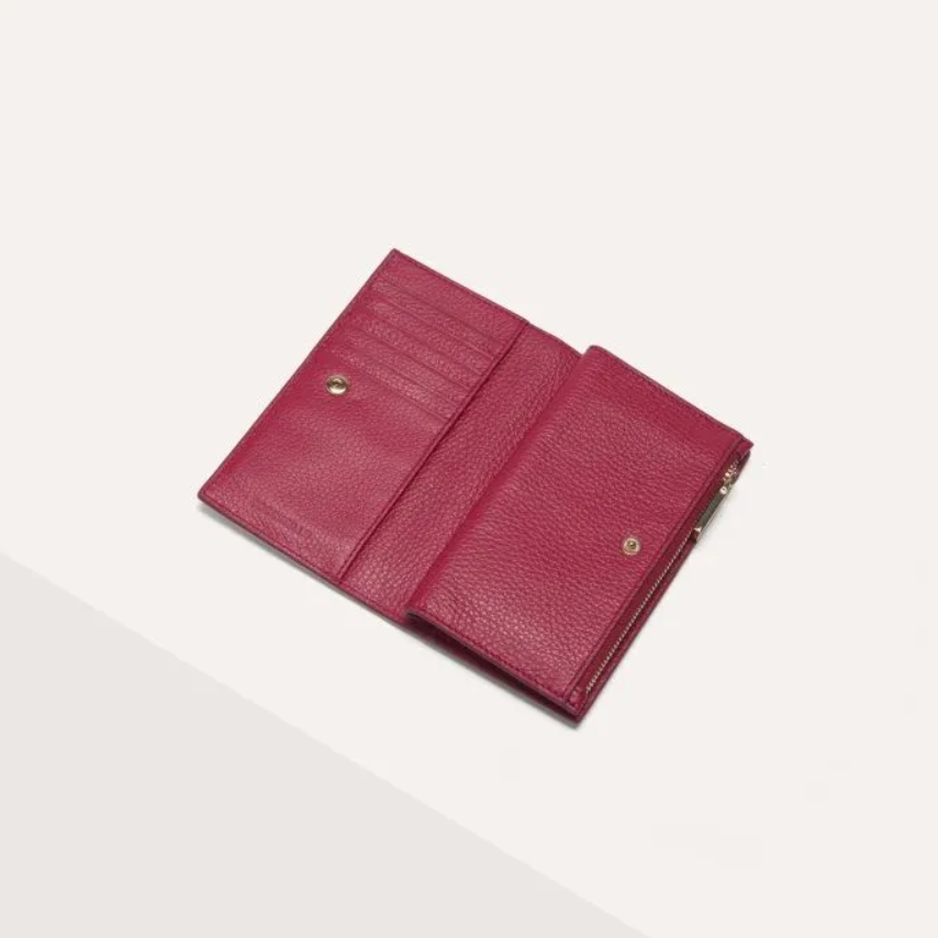 Portafoglio in pelle di dimensioni medie, perfetto anche per le minibag essendo piccolo e compatto. Chiuso da doppio bottone con al centro la cerniera per le monete.