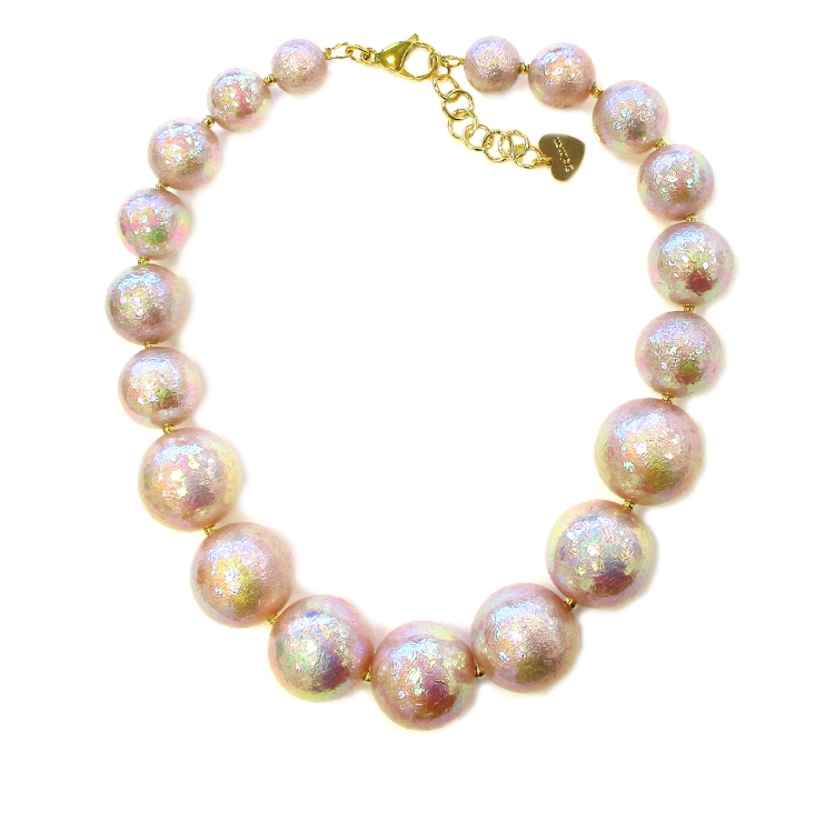 Girocollo chiuso con moschettone con perle in gradazione di grandezza così da creare movimento. La perla è un passepartout ma questa è resa super glamour grazie al colore particolare leggermente "specchiatto" sui toni del rosa/lilla che ricorda la coda delle sirene. NICHEL FREE, Made in Italy.