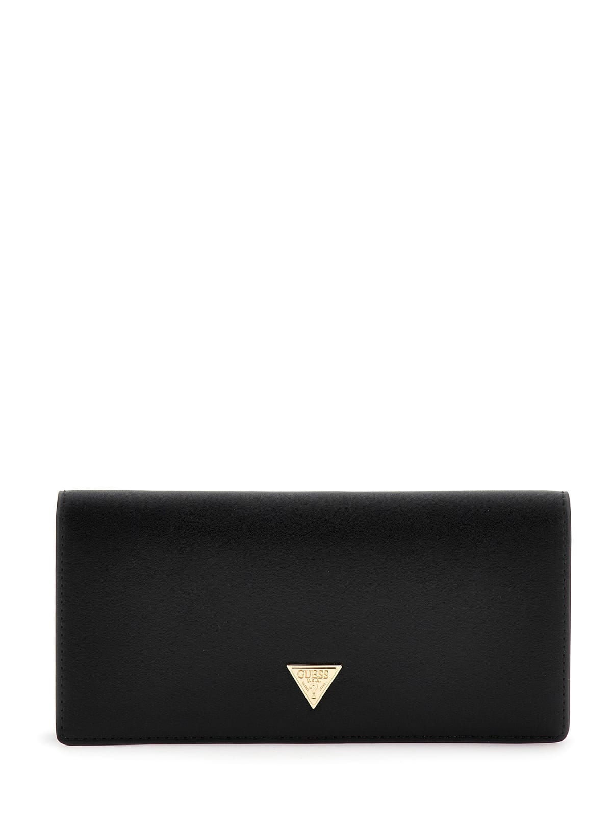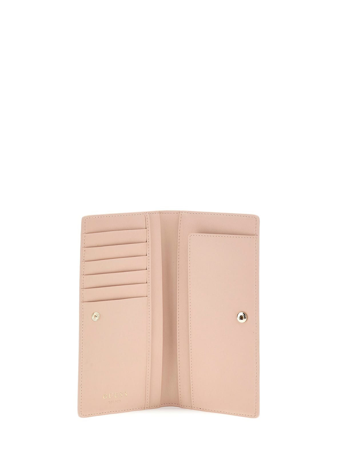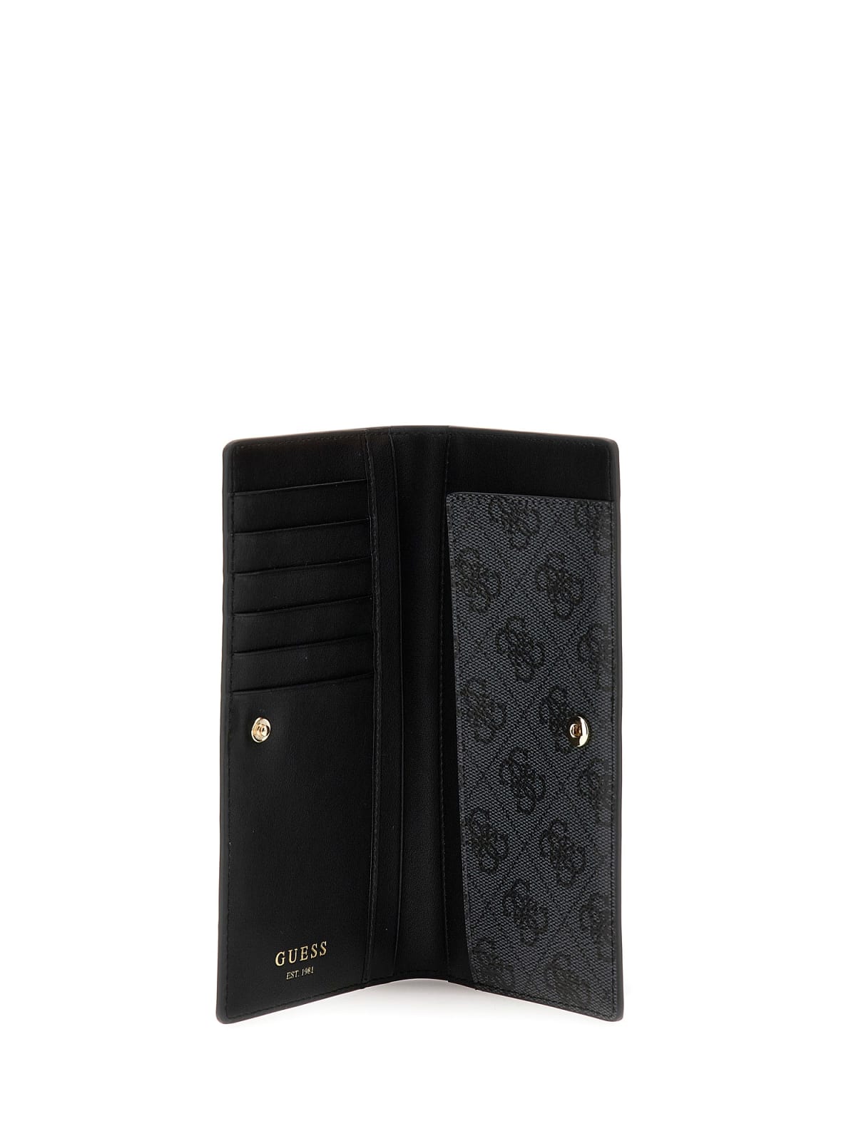 Guess propone nella storia e classica Linea Noelle il porta documenti formato portafoglio, chiuso da bottone con sei slot per le carte di credito su un lato e sull'altro due soffietti per le carte o le banconote.