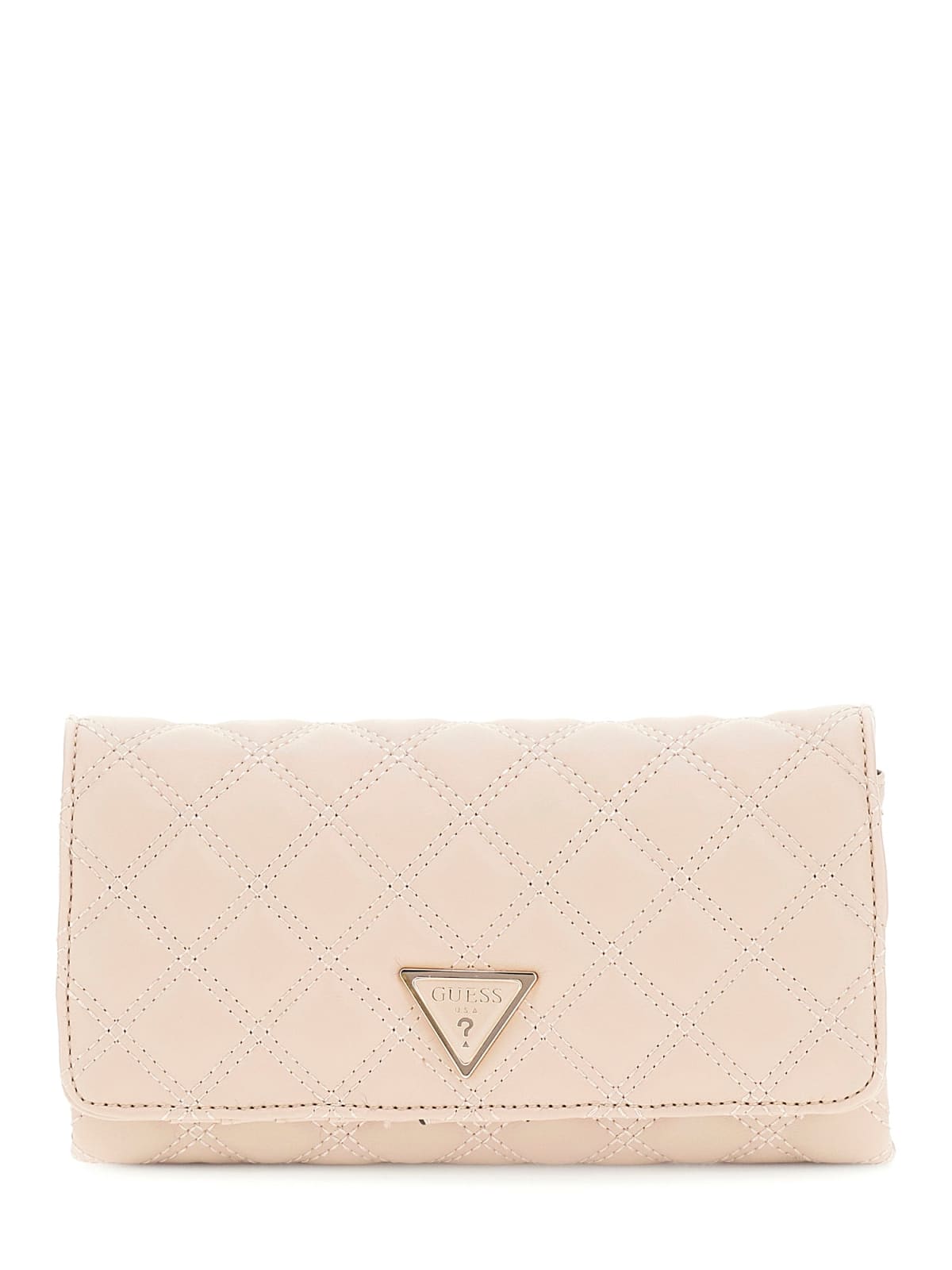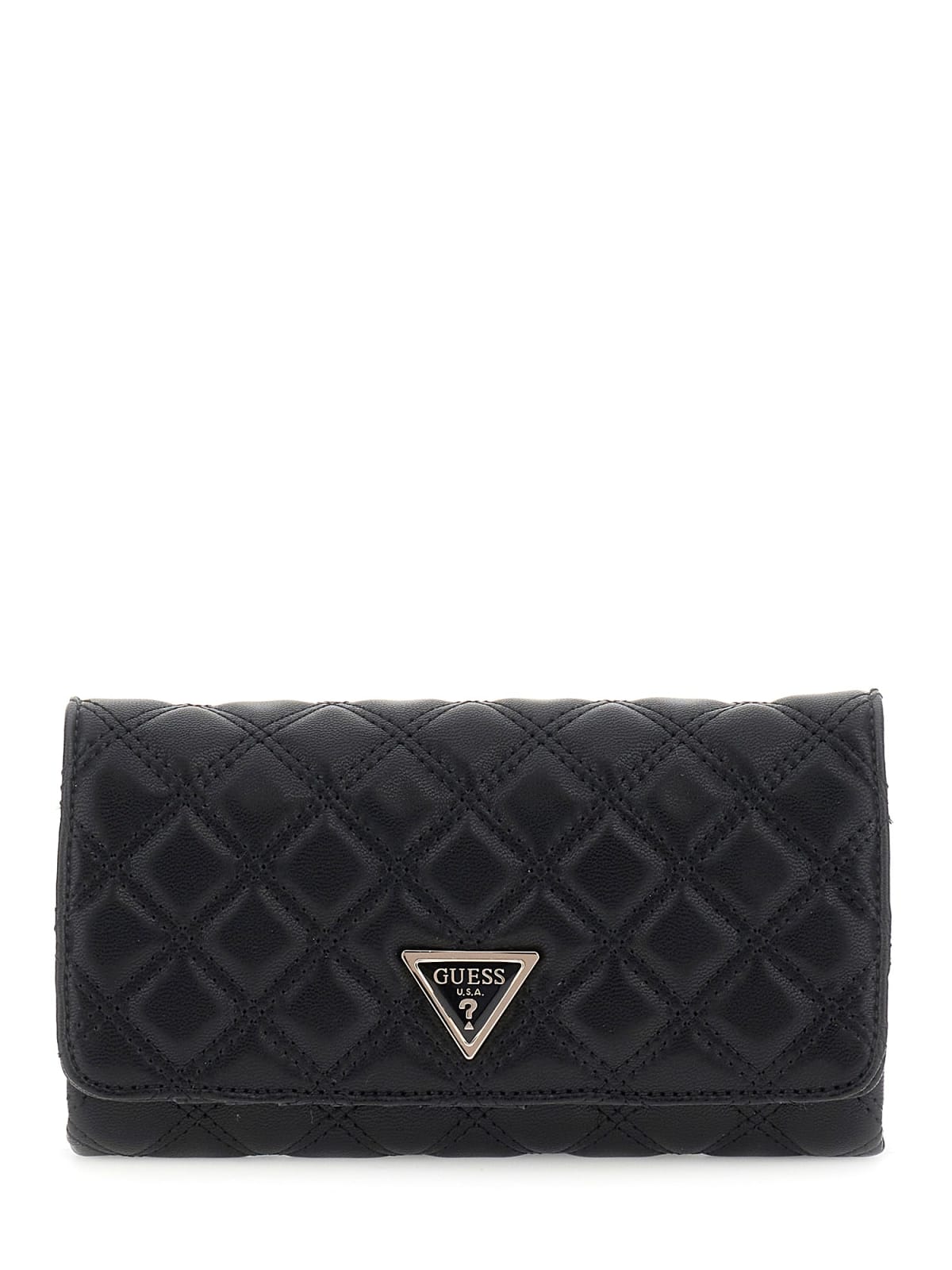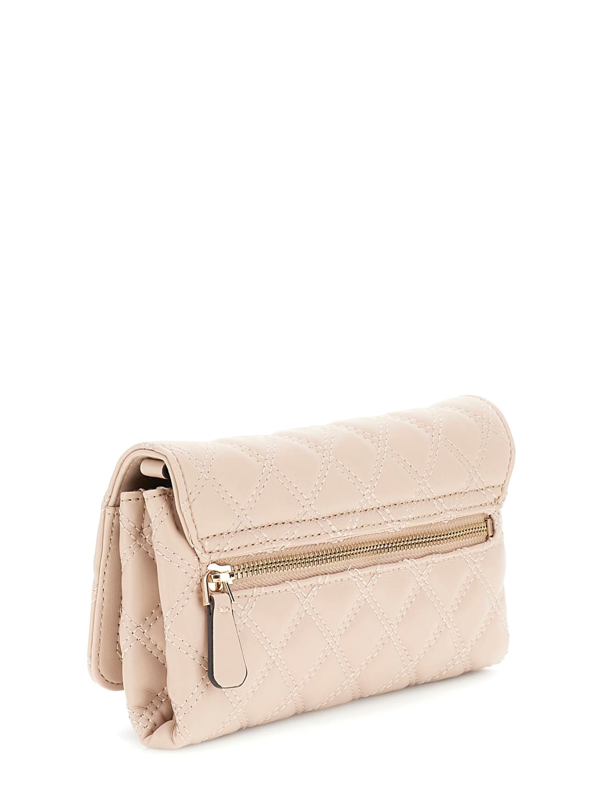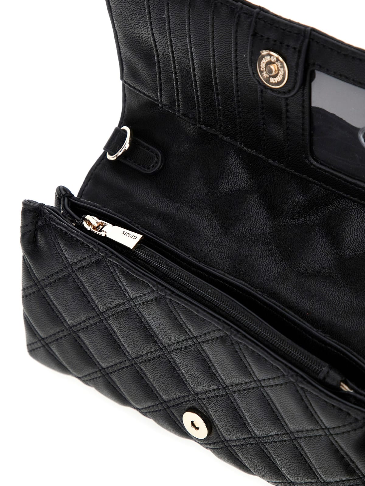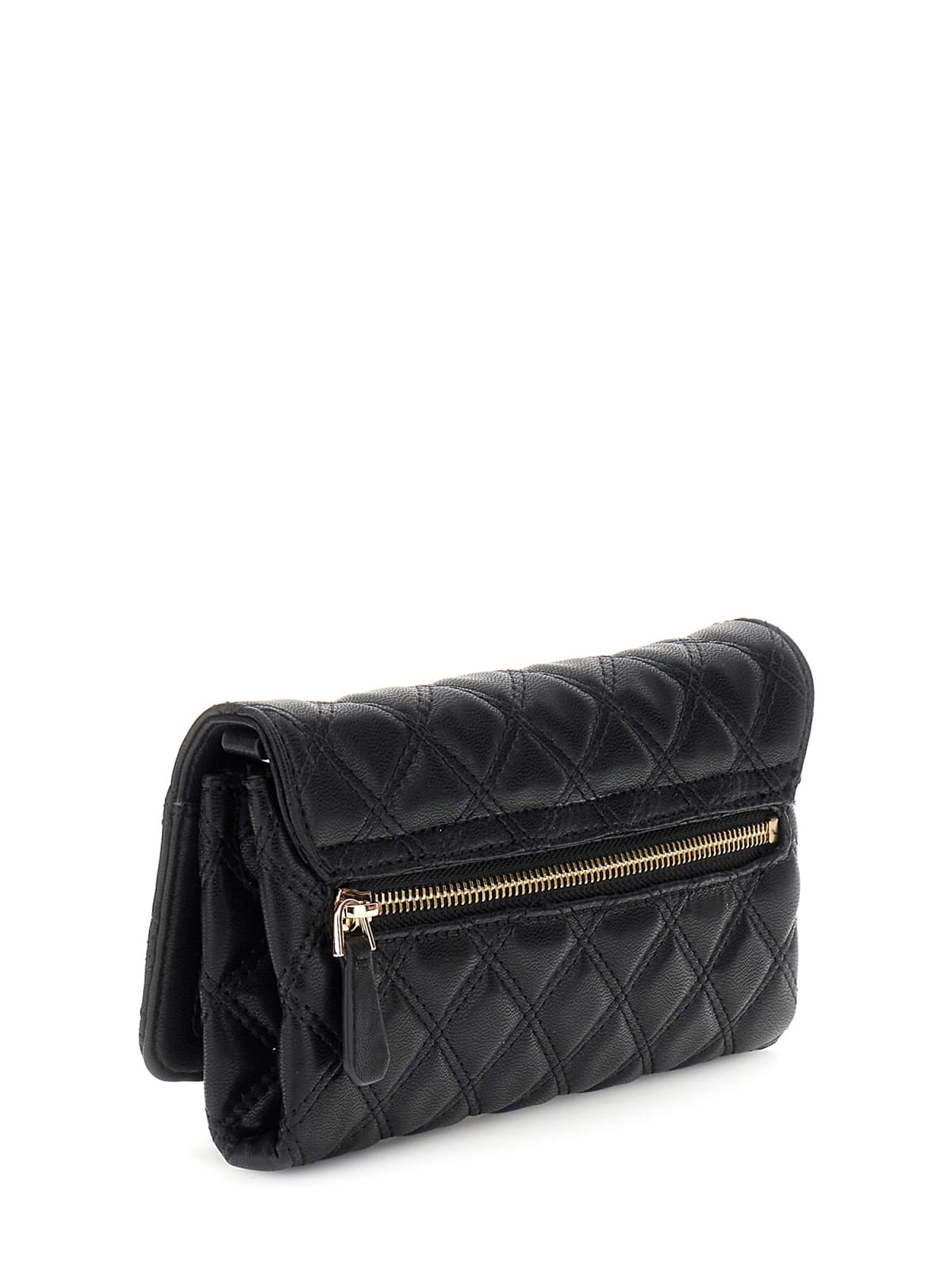 Minibag/portafoglio in ecopelle trapuntato e chiuso con bottone centrale. Organizzato internamente come un classico portafoglio ma con la possibilità di agganciare la catenina così da indossarlo come crossbag.