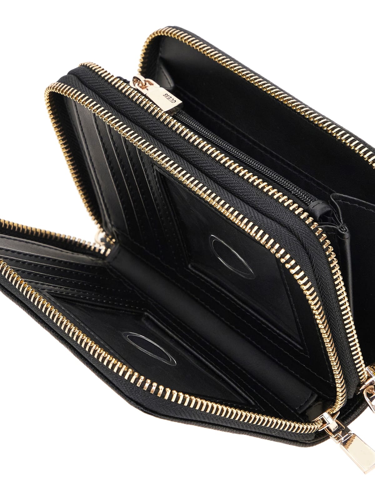 Portafoglio in ecopelle con doppia zip around. In una cerniera troviamo la tasca per le banconote e le slot per le carte di credito; dall'altra zip due scomparti per le monete o banconote piegate e una cerniera per le monete. Manico con moschettone removibile.