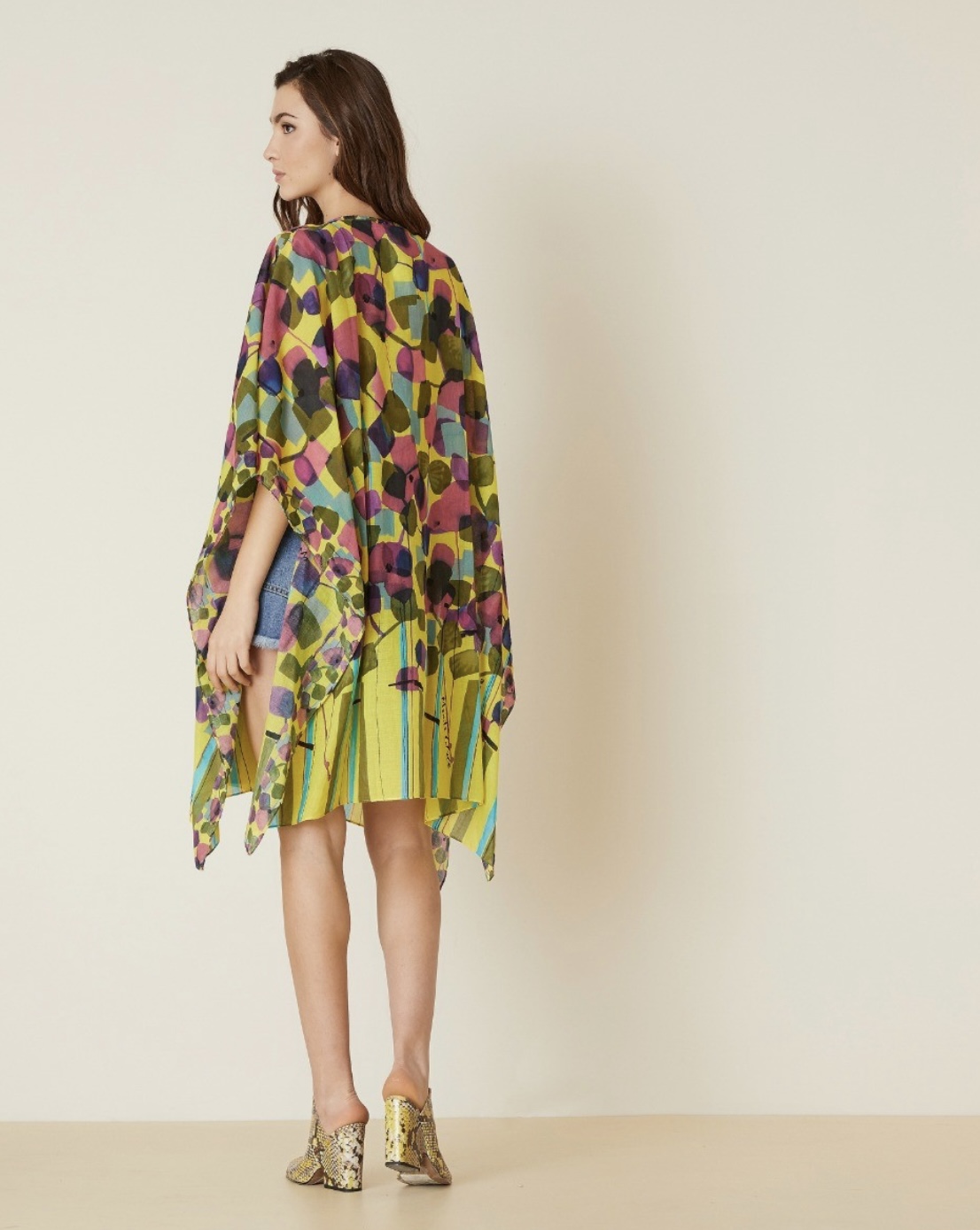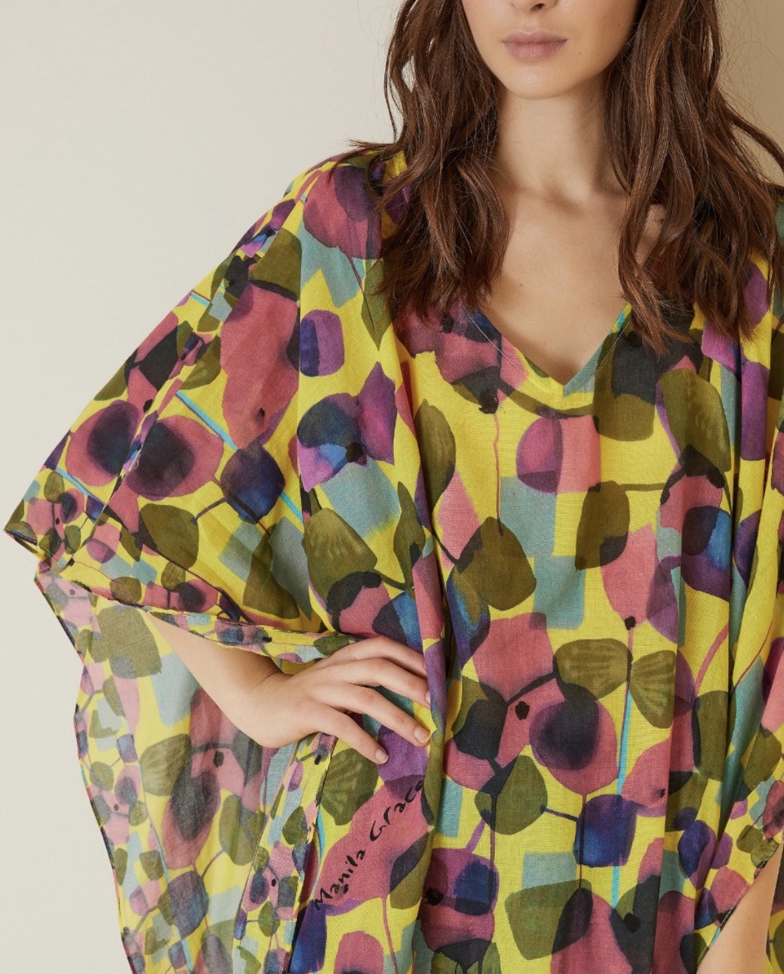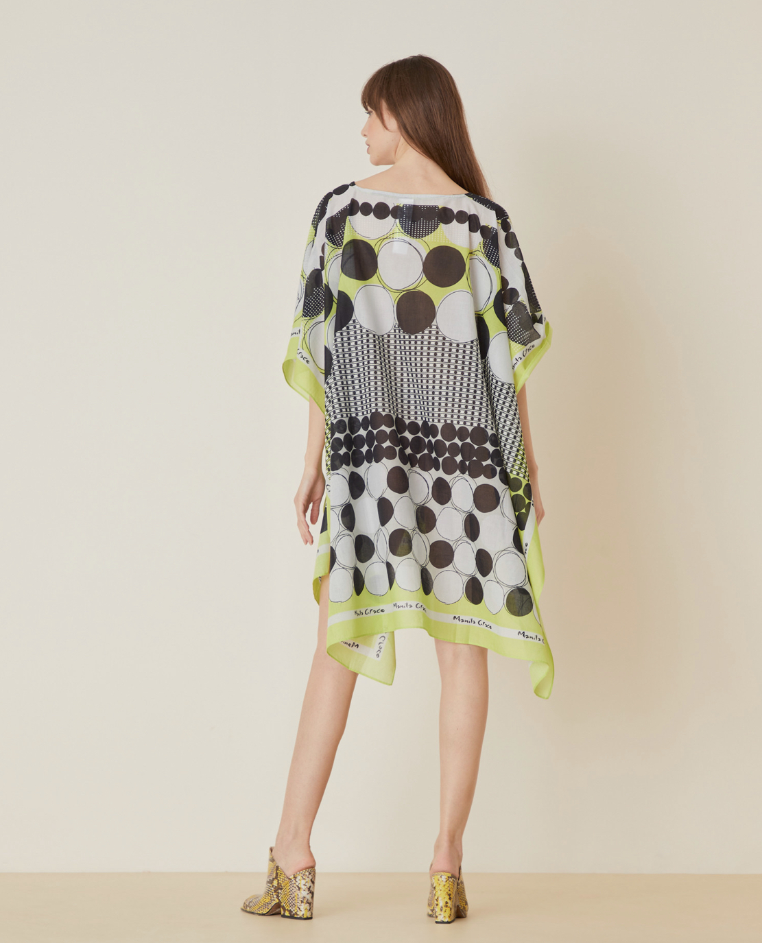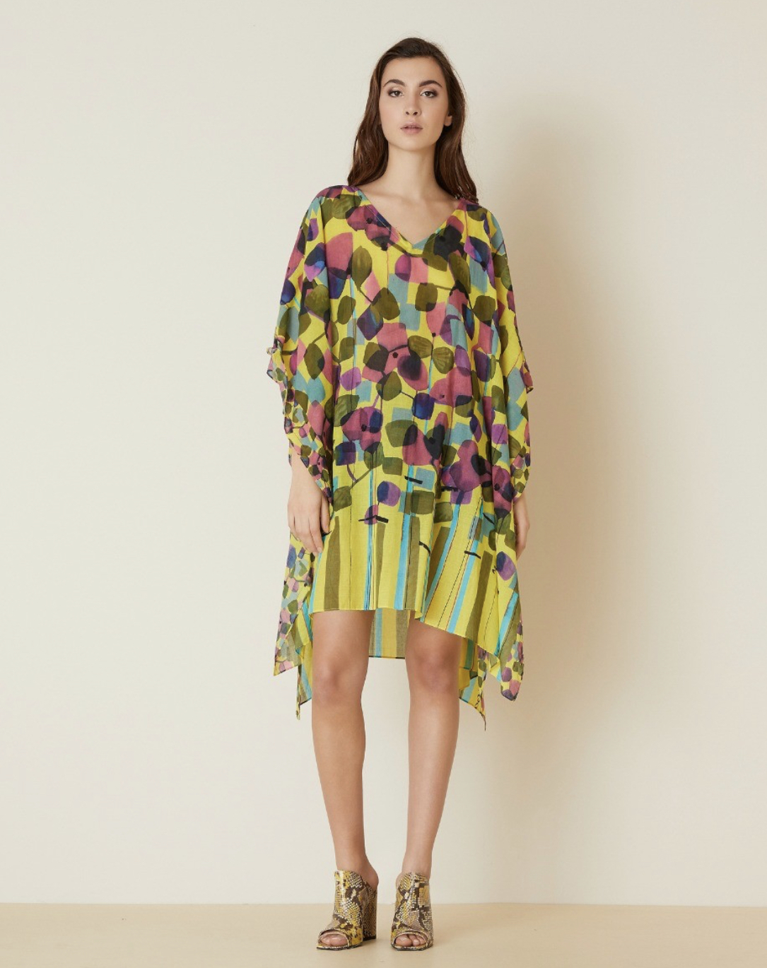 Perfetto per le giornate estive, questo leggero kaftano stampato è caratterizzato da colori e pois in morbido cotone. Grazie alle dimensioni generose (100x190) si adatta a tutti i tipi di silhouettes. La modella è alta 178 cm.