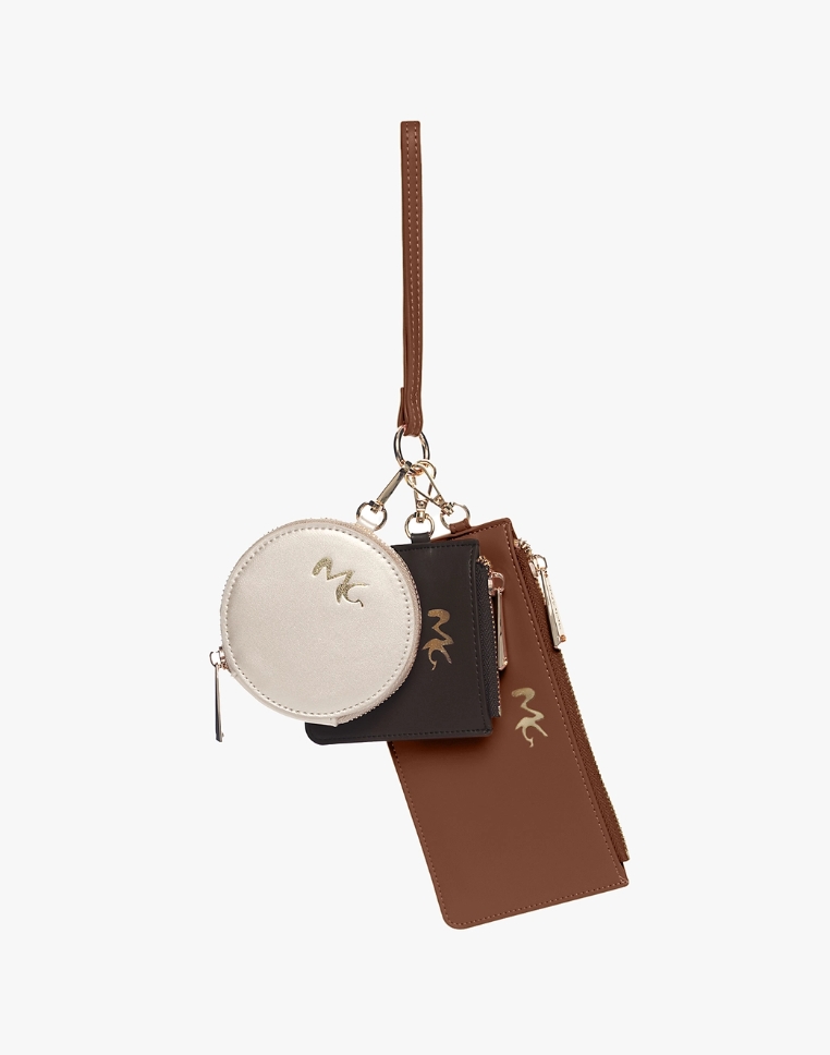 Tris portafoglio in ecopelle chiusi tutti da cerniera. Sono tutti staccabili tra di loro ed utilizzabili indipendentemente. Comodi sia come portamonete che come beauty.