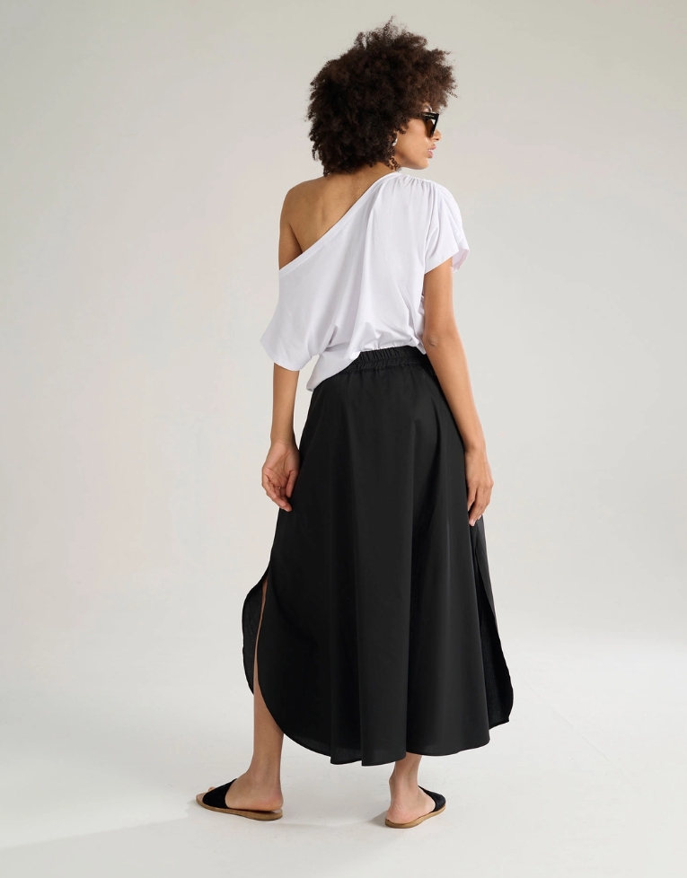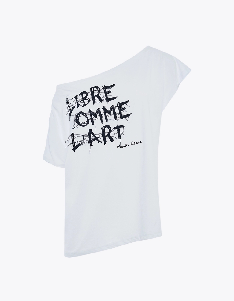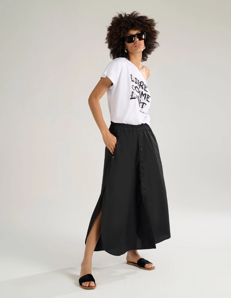 T-shirt mezza manica dallo scollo asimmetrico così da poter essere indossata con la spallina scesa così per dare non solo un tocco particolare all'outfit ma in generale un gusto fresco e giovanile. Ricamo sul lato dall'animo rock, si sposa bene con un total look casual da abbinare per esempio con sneaker e denim oppure con una gonna lunga.