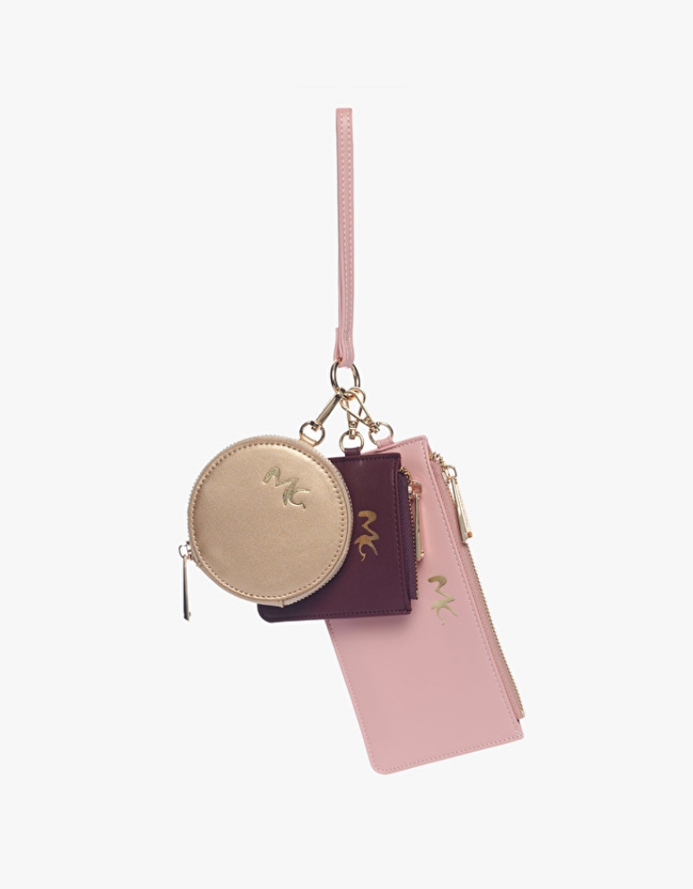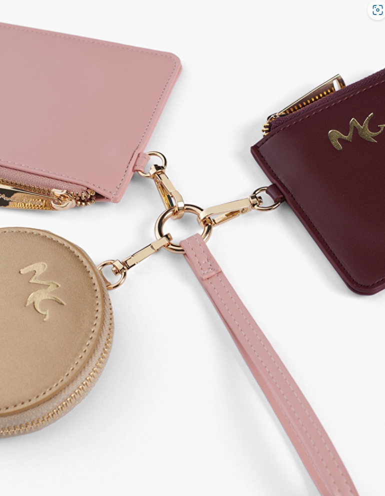 Tris necessarie o portafogli in ecopelle di varie grandezze ognuno chiuso da cerniera superiore. Si possono indossare insieme grazie al manichetto oppure separatamente. Carini anche da agganciare alla borsa. Piccoli e compatti sono utili anche da viaggio o da riporre all'interno della borsa palestra.