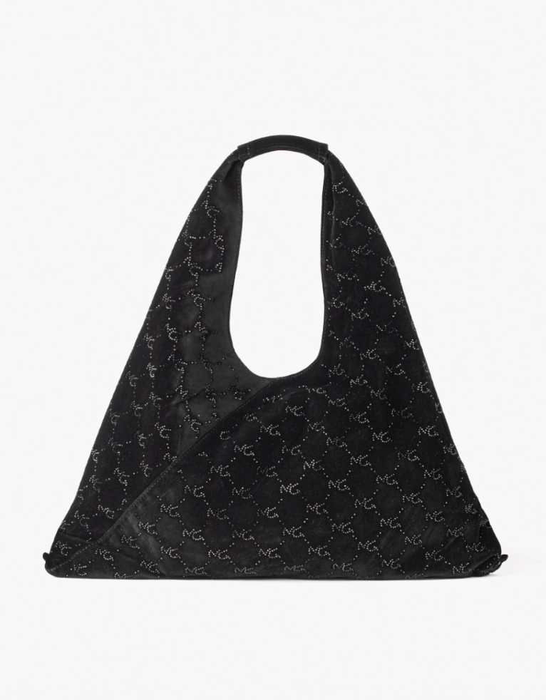 Borsa in velluto, modello sacca in velluto con multi logo all over cristallizzato. Perfetta per essere particolare e glamour anche con un total look casual. Da indossare a spalla.