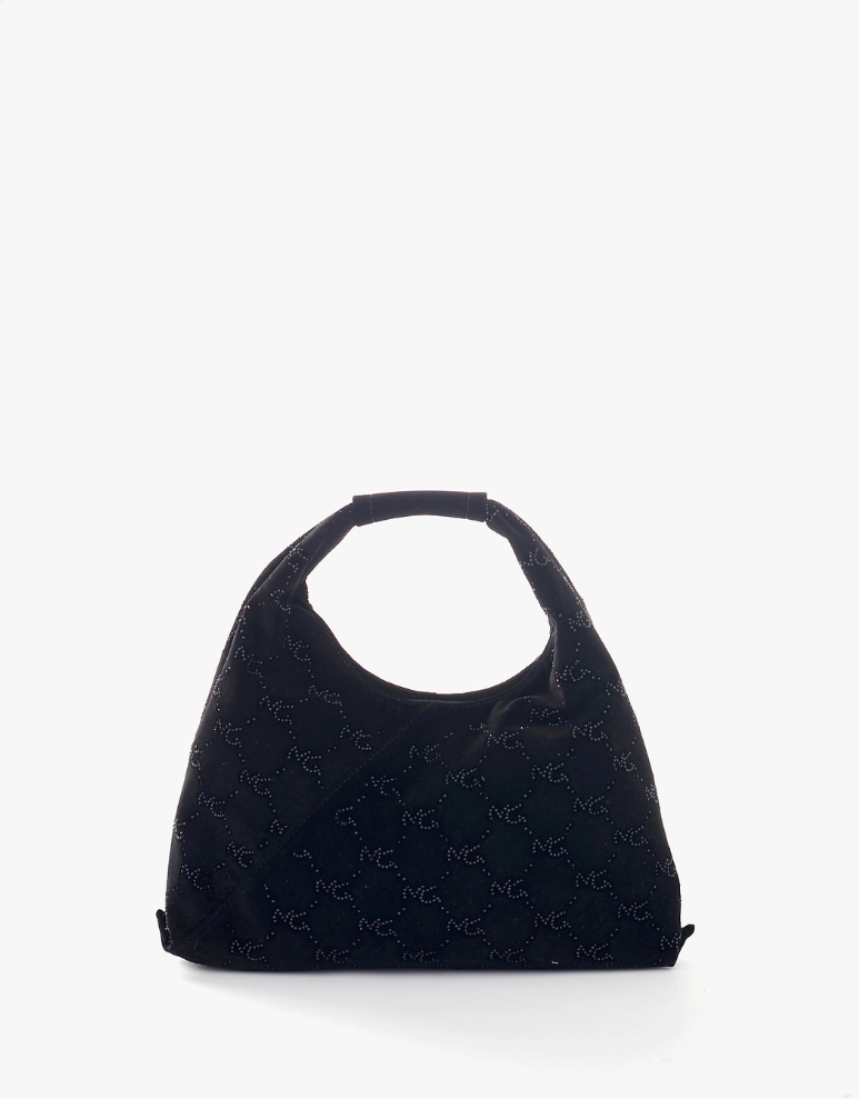 Borsa in velluto, modello mini sacca in velluto con multi logo all over cristallizzato. Perfetta per essere particolare e glamour anche con un total look casual. Da indossare a mano.