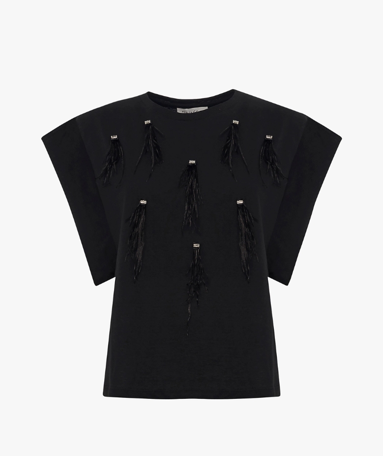 T-shirt in jersey di cotone dal taglio dritto e manica ampia. Particolare sono i dettagli sul davanti: cabochon con piume super trendy con un denim o pantalone taglio chino.