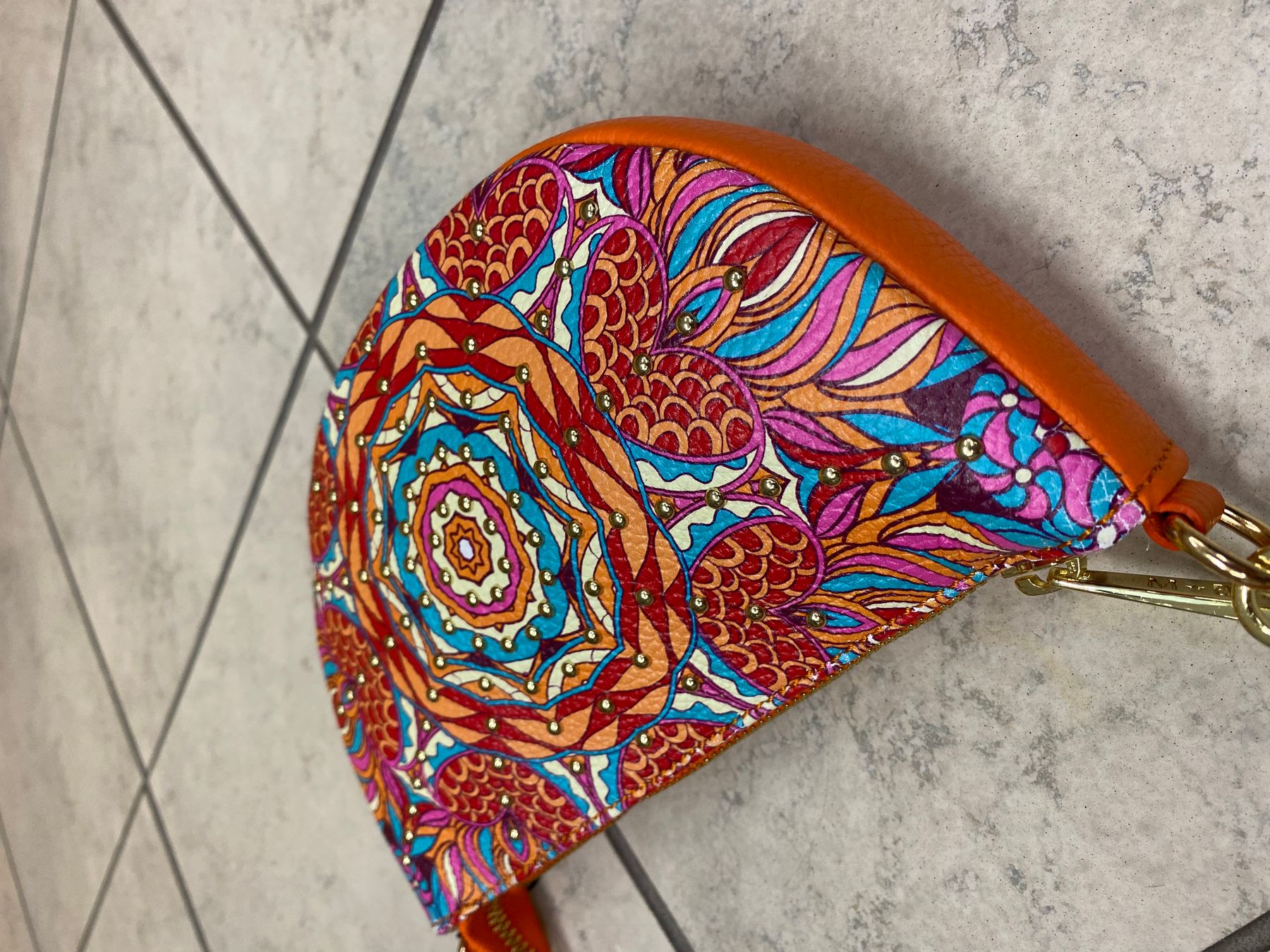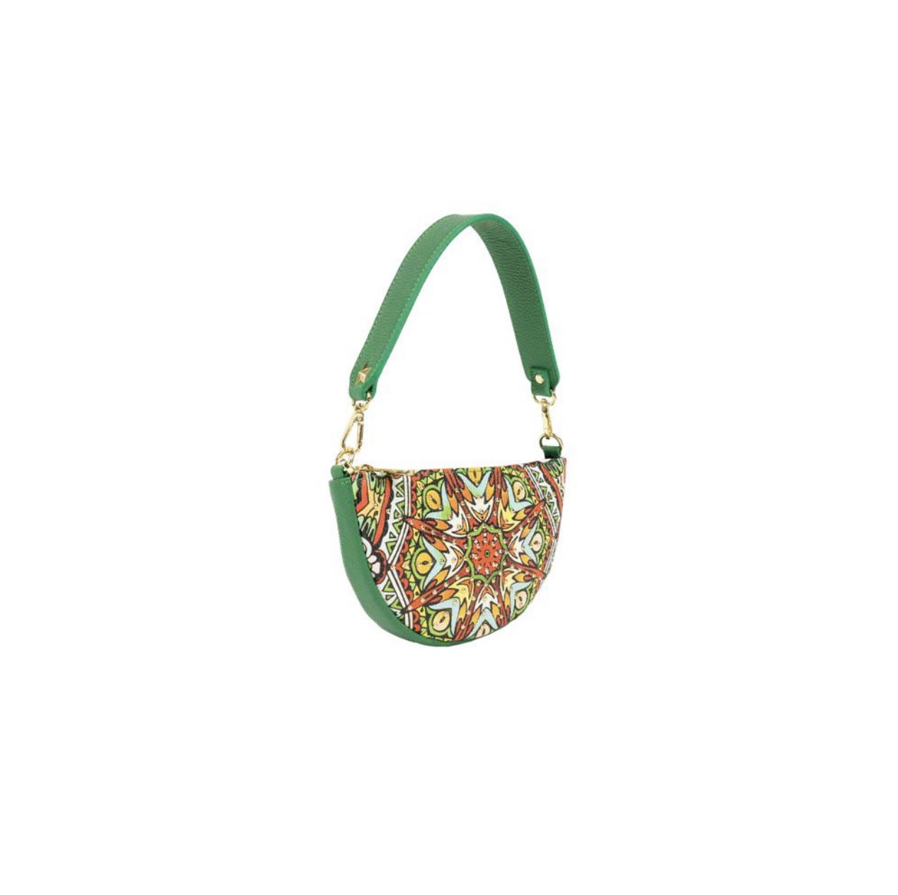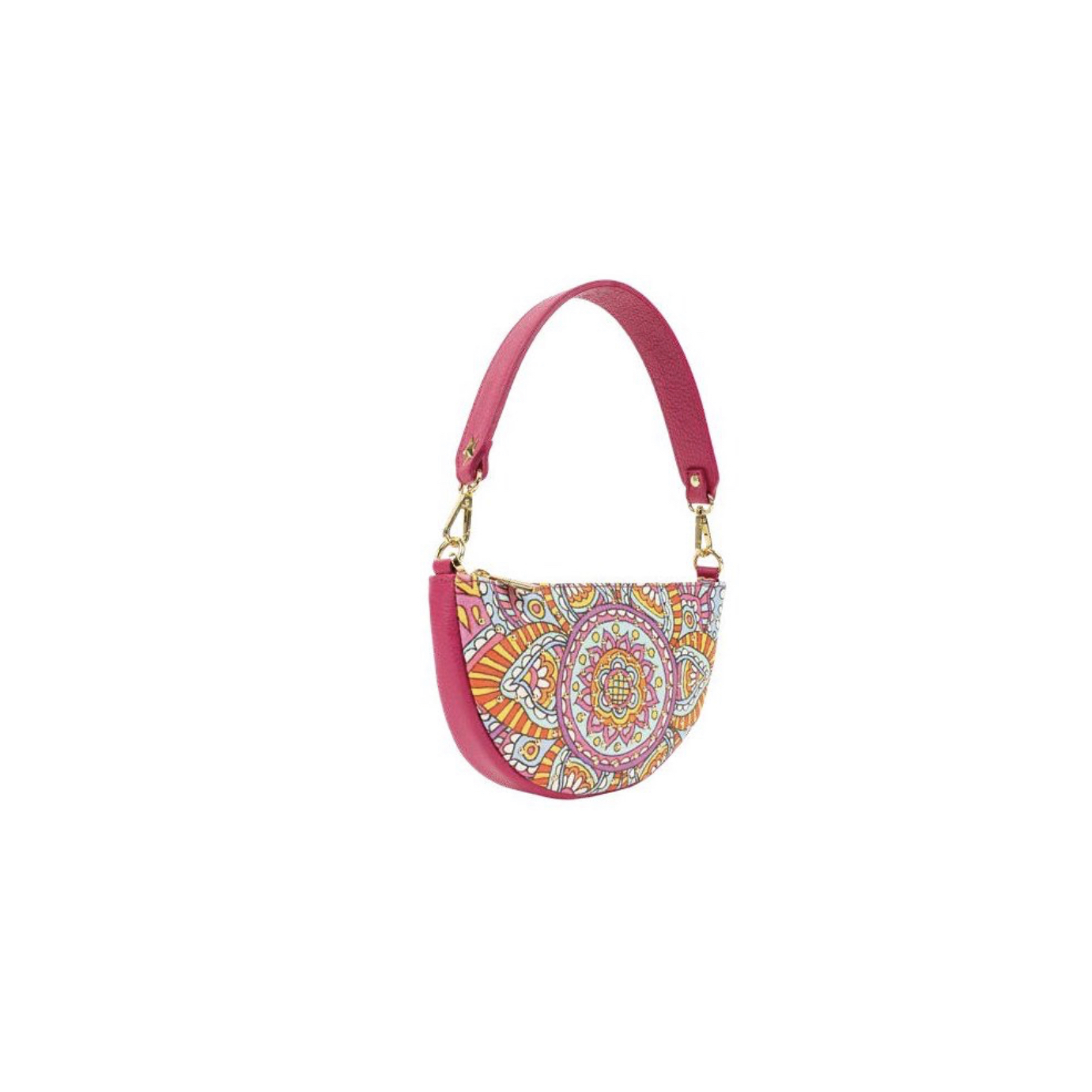Mini bag in pelle con motivo geometrico dipinto sul davanti. Chiusa con cerniera superiore, è dotata di due tracolla: una corta in pelle e l'altra lunga a catenina così da renderla unica e perfetta sia per un look più elgante che per uno più ricercato.