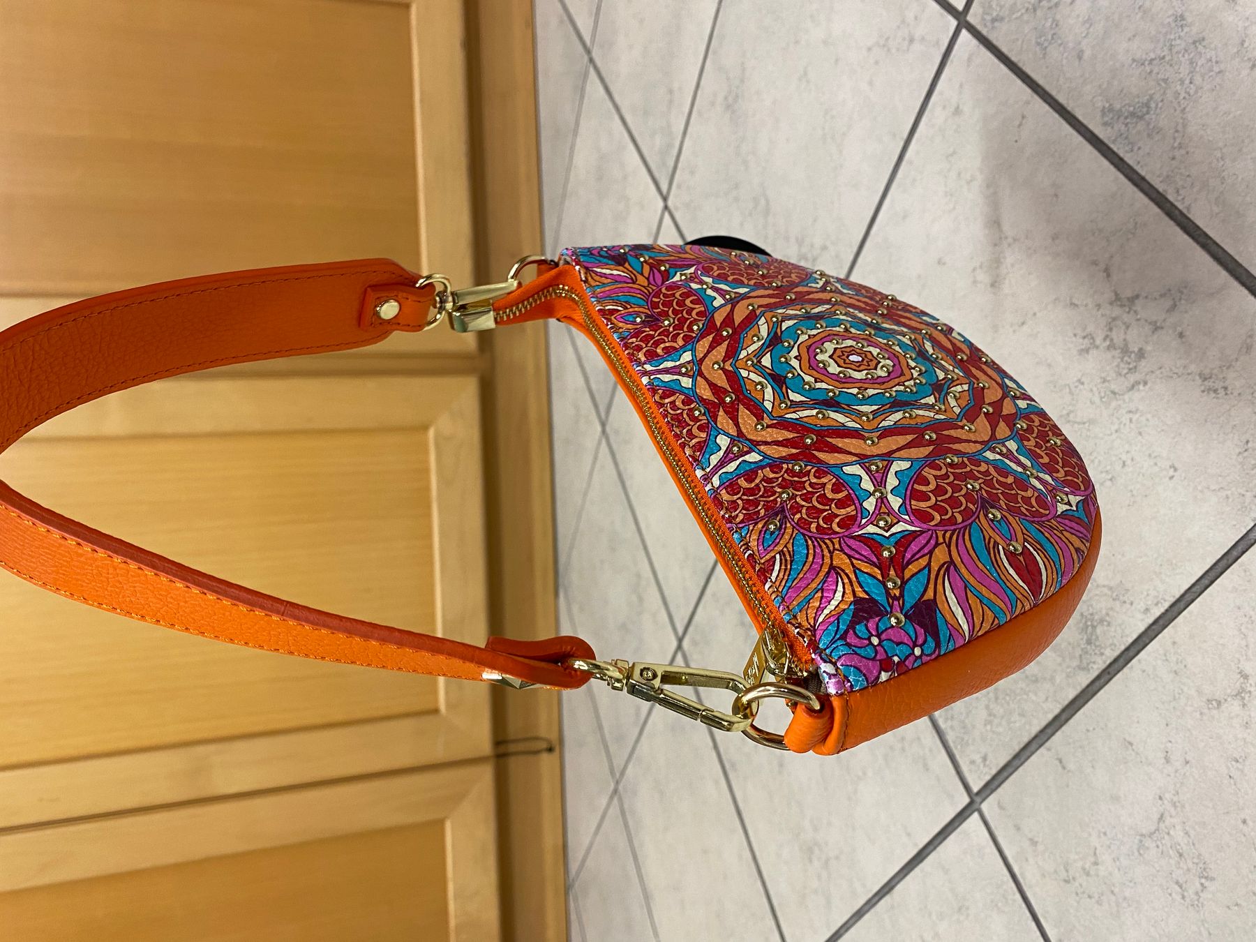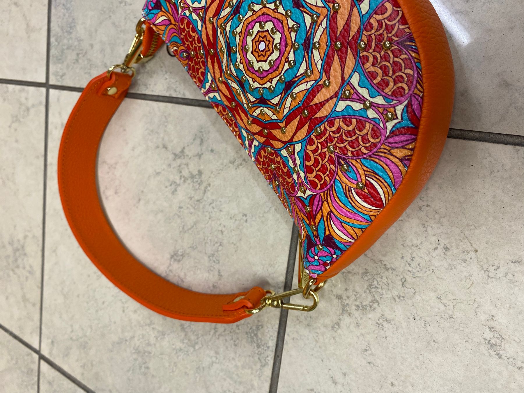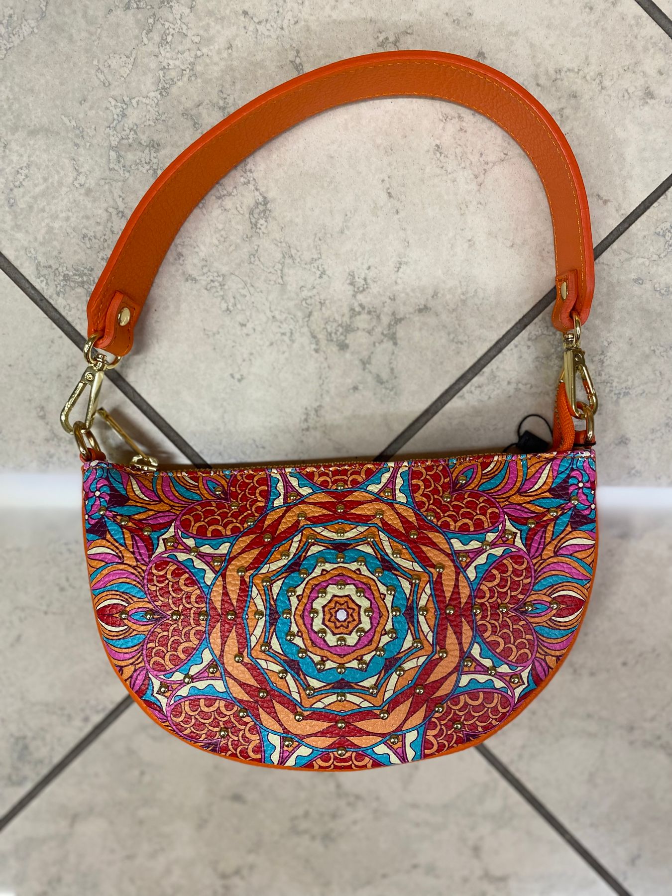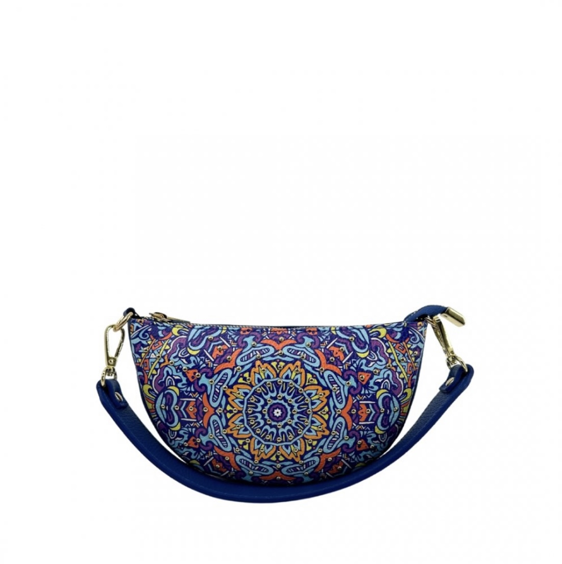 Mini bag in pelle con motivo geometrico dipinto sul davanti. Chiusa con cerniera superiore, è dotata di due tracolla: una corta in pelle e l'altra lunga a catenina così da renderla unica e perfetta sia per un look più elgante che per uno più ricercato.