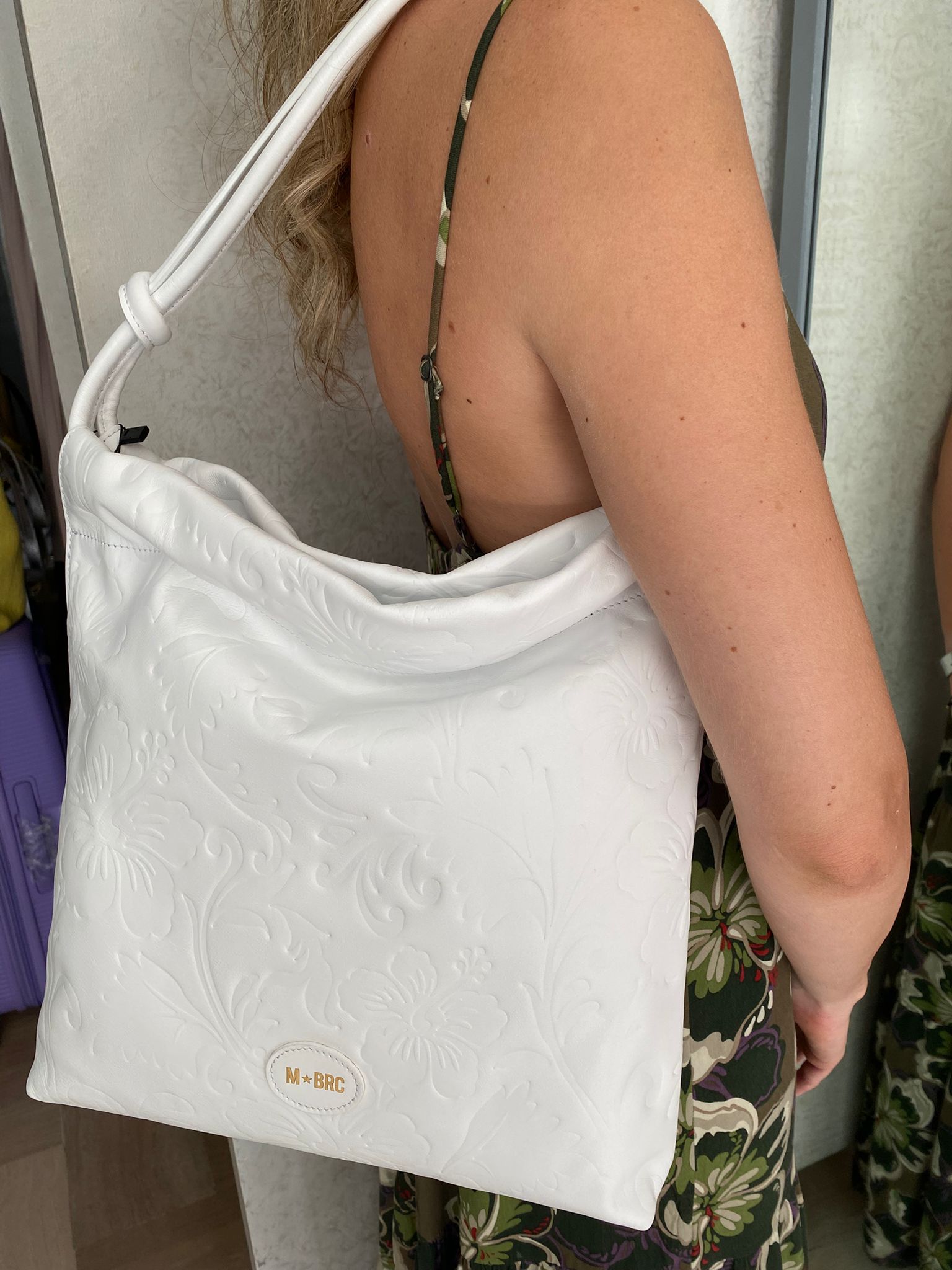 Borsa in pelle con motivo floreale a fuoco tono su tono, modello verticale a spalla con comodo manico e chiusa da coulisse. Leggerissima, pratica e comoda per la quotidianità.