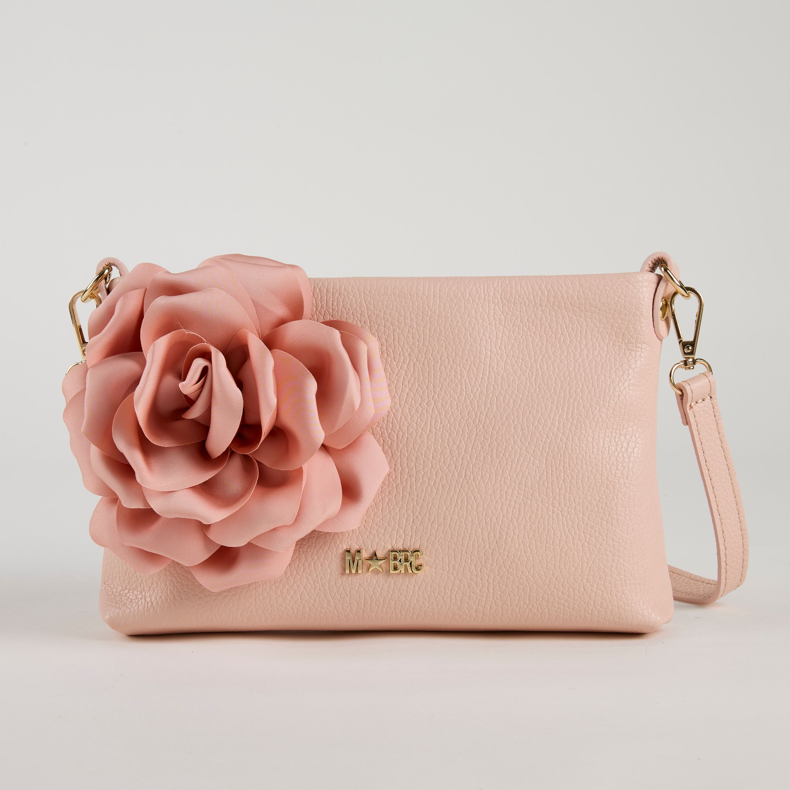 Pochette in pelle, minibag chiusa da cerniera superiore e tracolla in pelle removibile. Particolare il motivo del fiore in stoffa applicato sul lato che la rendere adatta ad ogni look: dal più casual al più particolare.