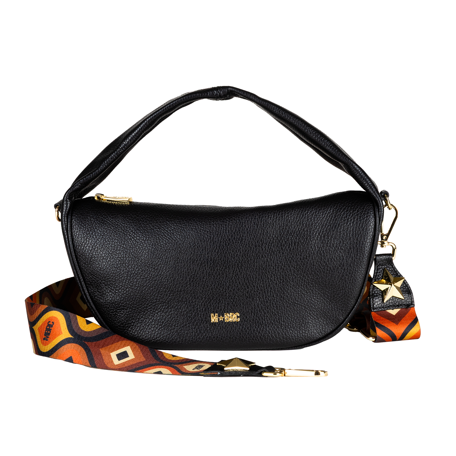 Borsa in pelle modello hobo, super giovanile e versatile. Chiusa da cerniera superiore, si può indossare con il manico in pelle (leggermente puffy che la rendono giovanile e trandy), o con la tracolla multicolor in tessuto regolabile o con quella, sempre regolabile, in pelle e tinta unita.