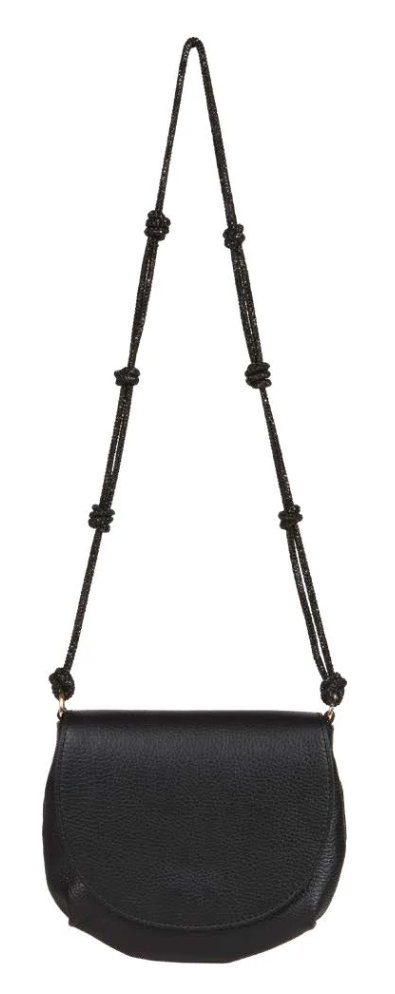 Borsa in pelle, modello tracollina chiusa con patta. Particolare la tracolla lurex con motivo dei nodi. Perfetta anche per un look elegante. Molto glamour.