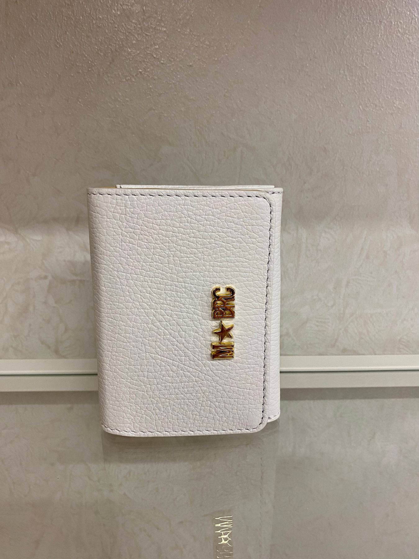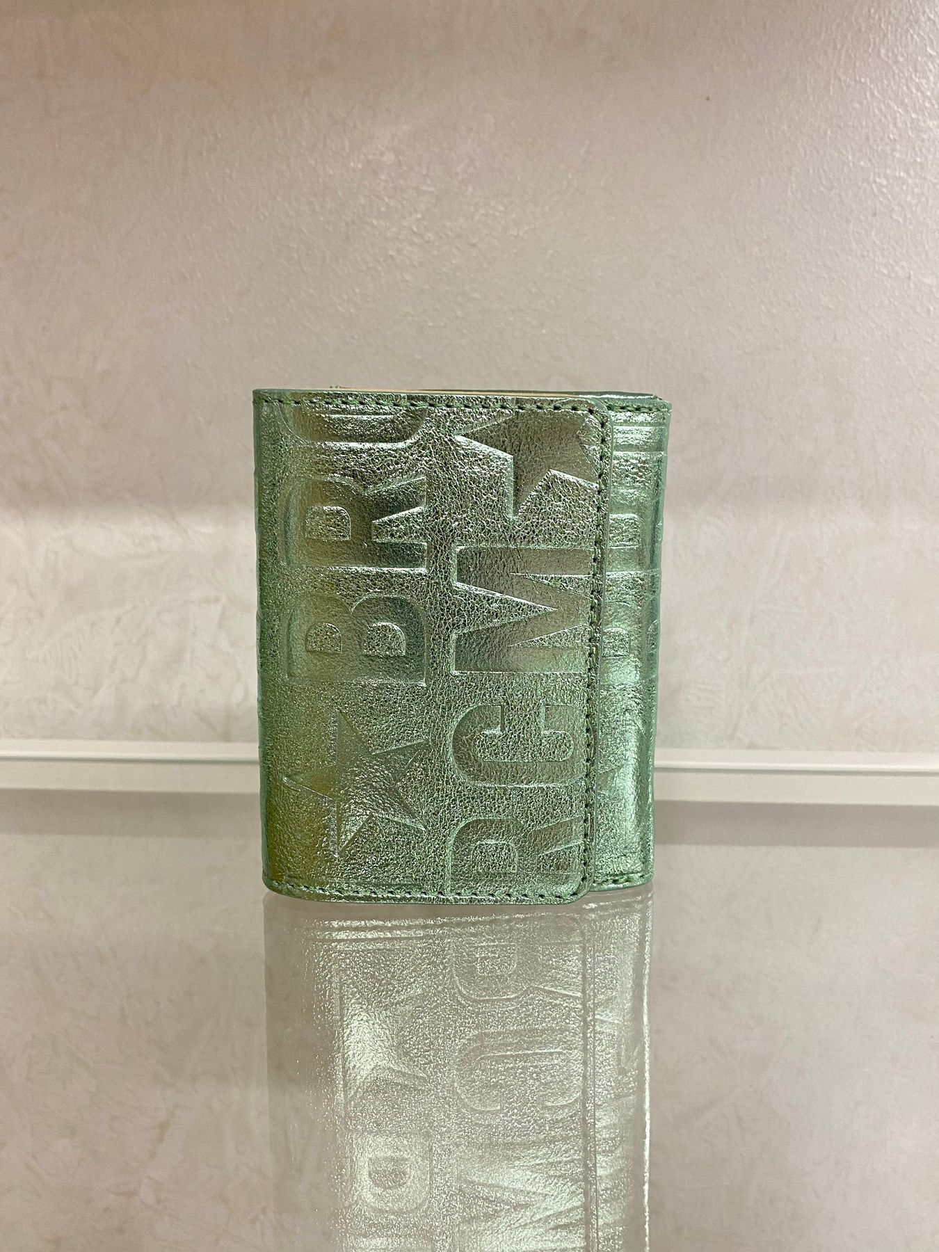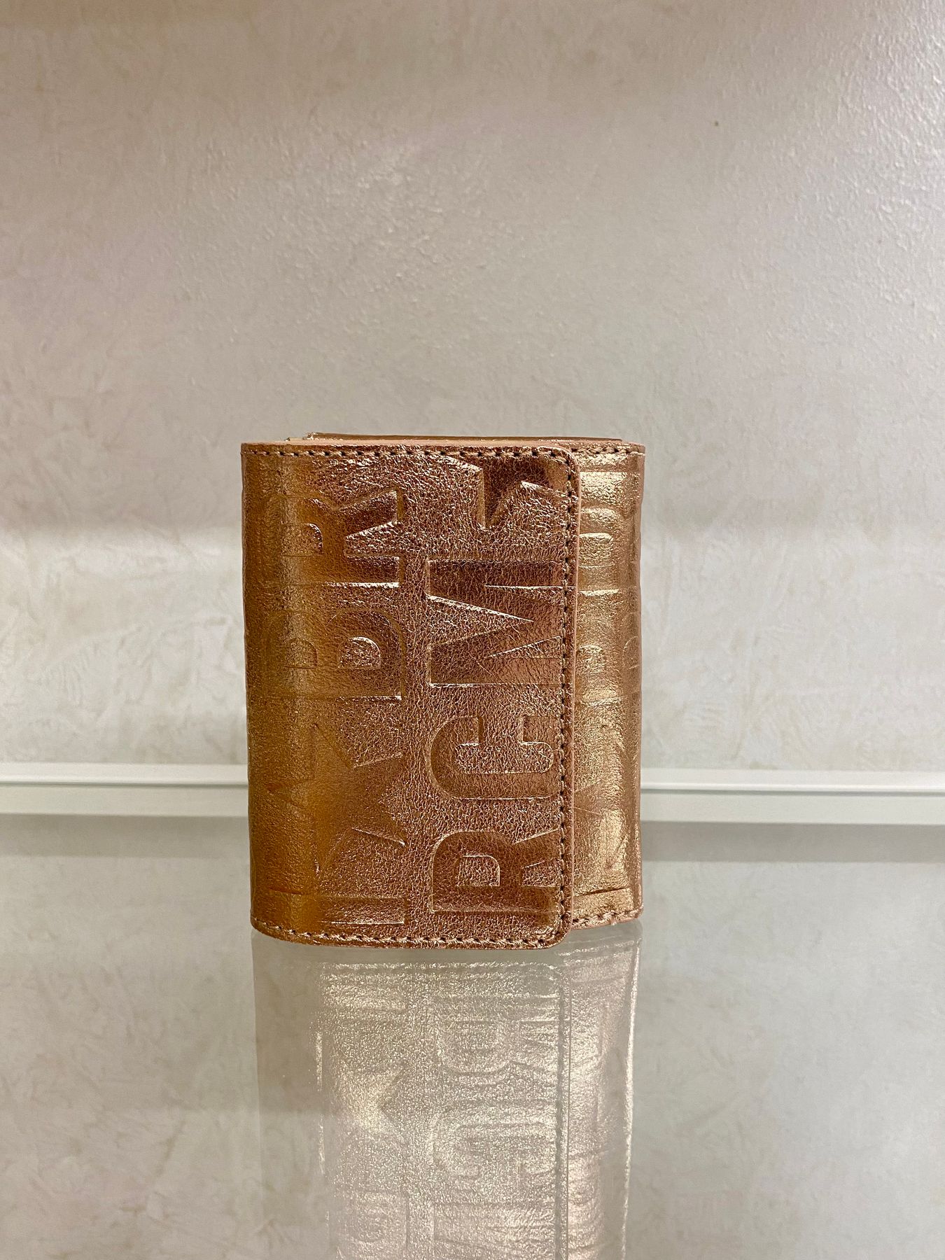 Portafoglio mini in pelle chiuso con bottone interno calamitato e logo metallico esterno. Internamente tre soffietti di cui quello centrale chiuso con cerniera per le monete mentre i laterali per le banconote (piegate) e le carte di credito negli appositi slot. Perfetto per le pochette o minibag.