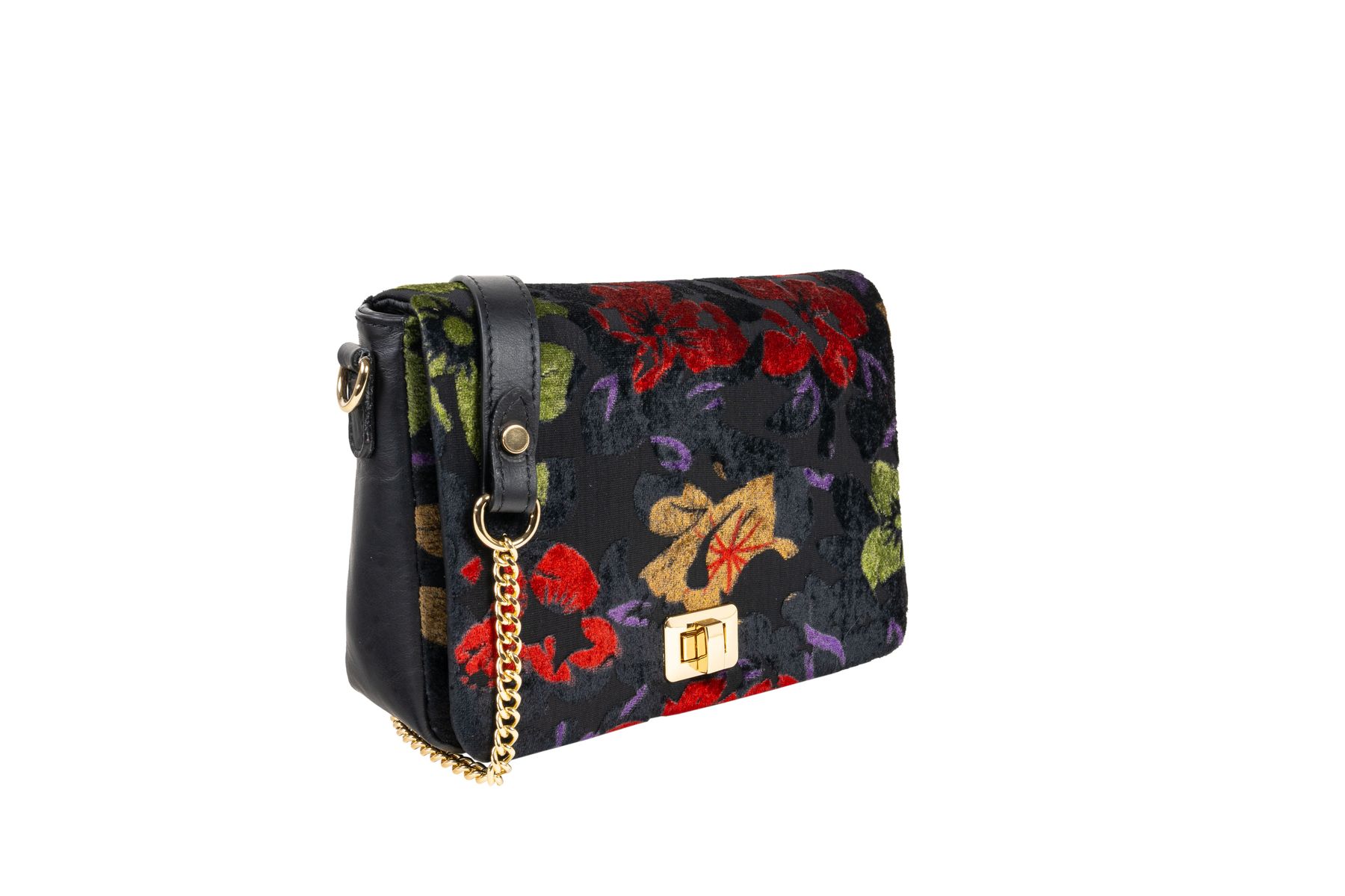 Borsa in velluto super chic e particolare, per un look unico. Chiusa da patta e perno e suddivisa in scomparti interni così da suddividere al meglio gli effetti personali. Da indossare a spalla.