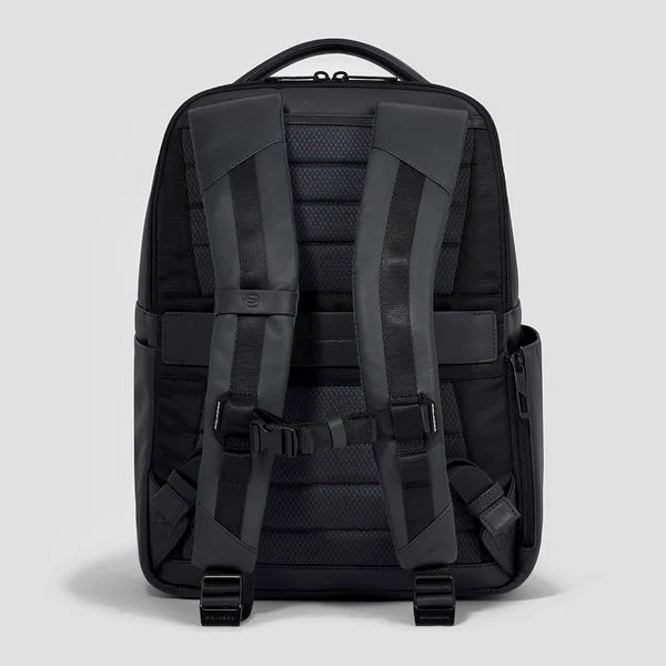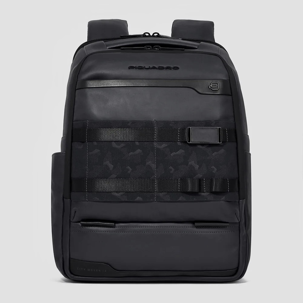 Zaino in pelle porta pc 14" con particolare frontale in tessuto mimetico che lo rende sportivo, dinamico e super trendy. Due grandi zip superiori per il pc, il tablet e tutti gli accessori lavoro; lateralmente sempre cerniere portabottiglie e ombrello.