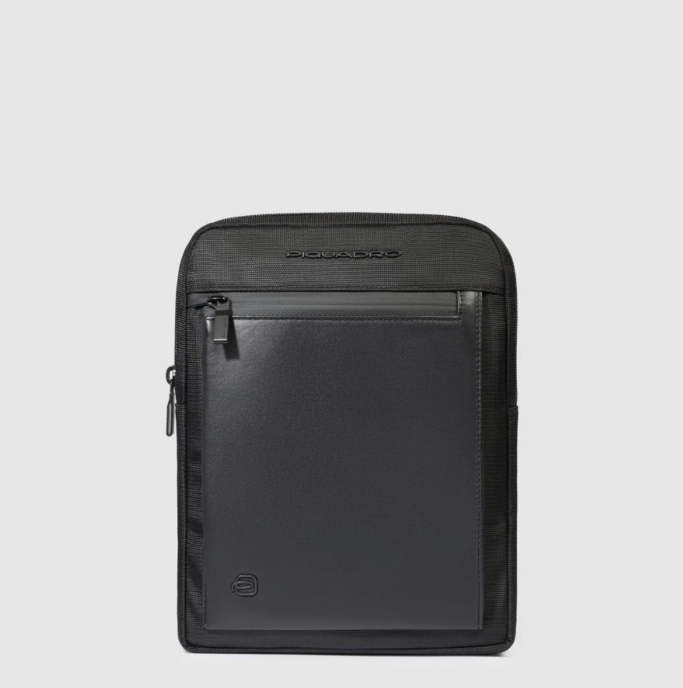 Borsello in tessuto e pelle iPad 11" chiuso da zip. Sul davanti una tasca chiusa sempre da cerniera. Tracolla in tessuto regolabile.