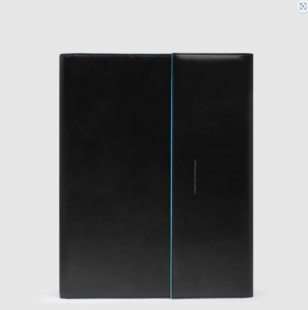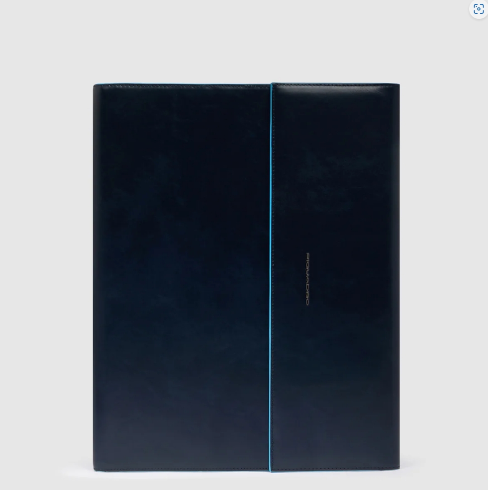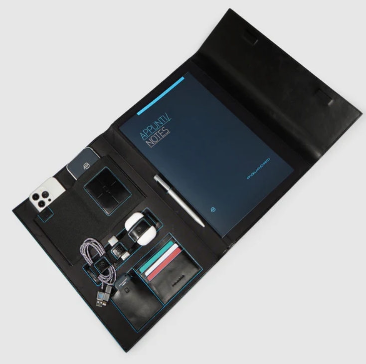 Porta blocco in pelle chiuso da patta e bottone. Internamente block notes, slot per i biglietti da visita, portapenne, filo per la carica, AirPods, smarthopne e tutti gli accessori work.