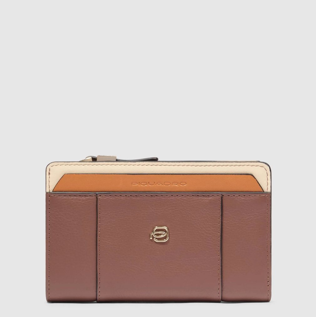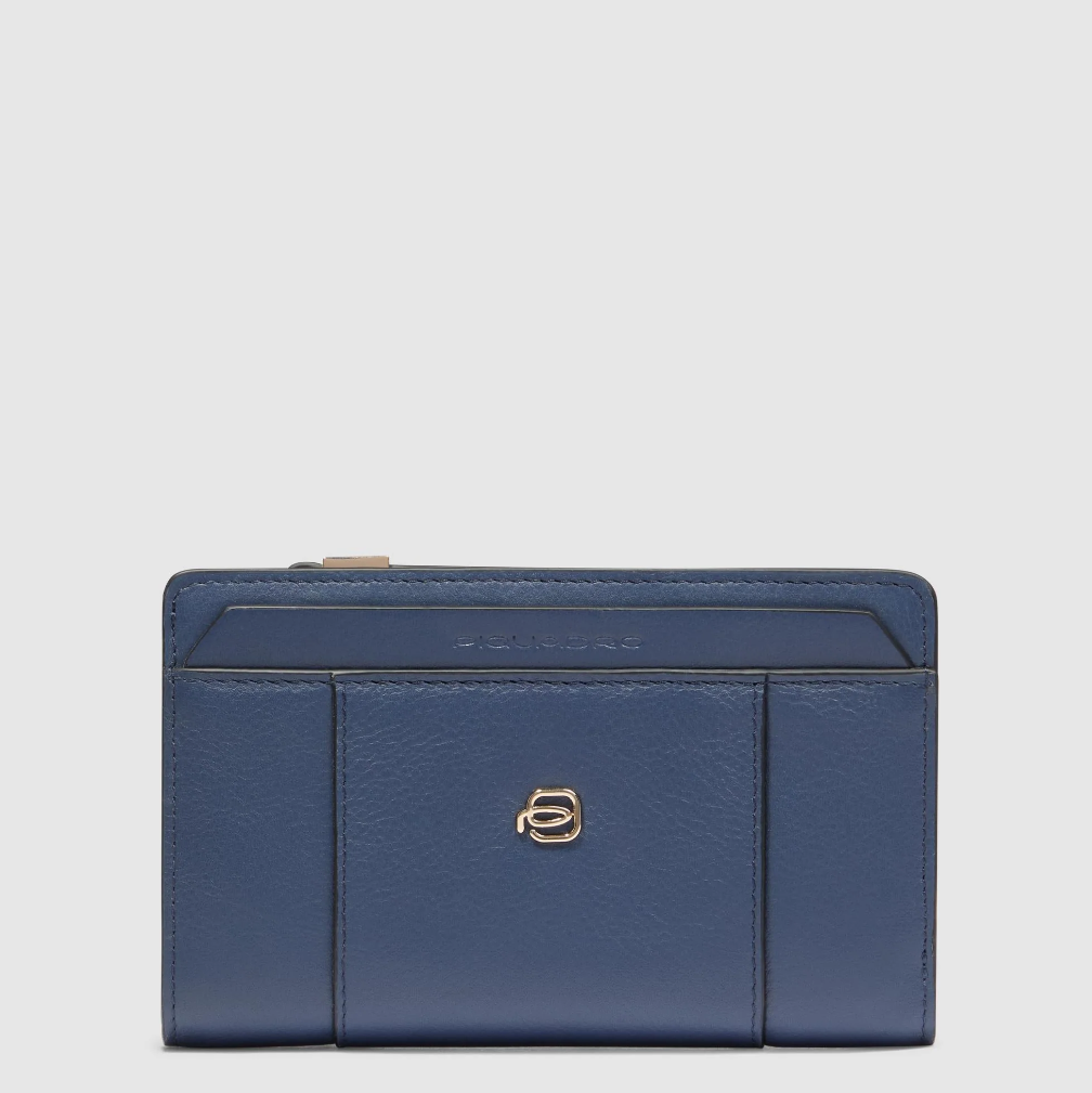 Portafoglio in pelle, di dimensioni medie così da essere compatto e capiente per entrare comodamente sia nelle minibag che nelle shopping. Doppio scomparto: uno chiuso con bottone (internamente slot per le carte di credito e soffietto per le banconote) ed uno con la cerniera per le monete.