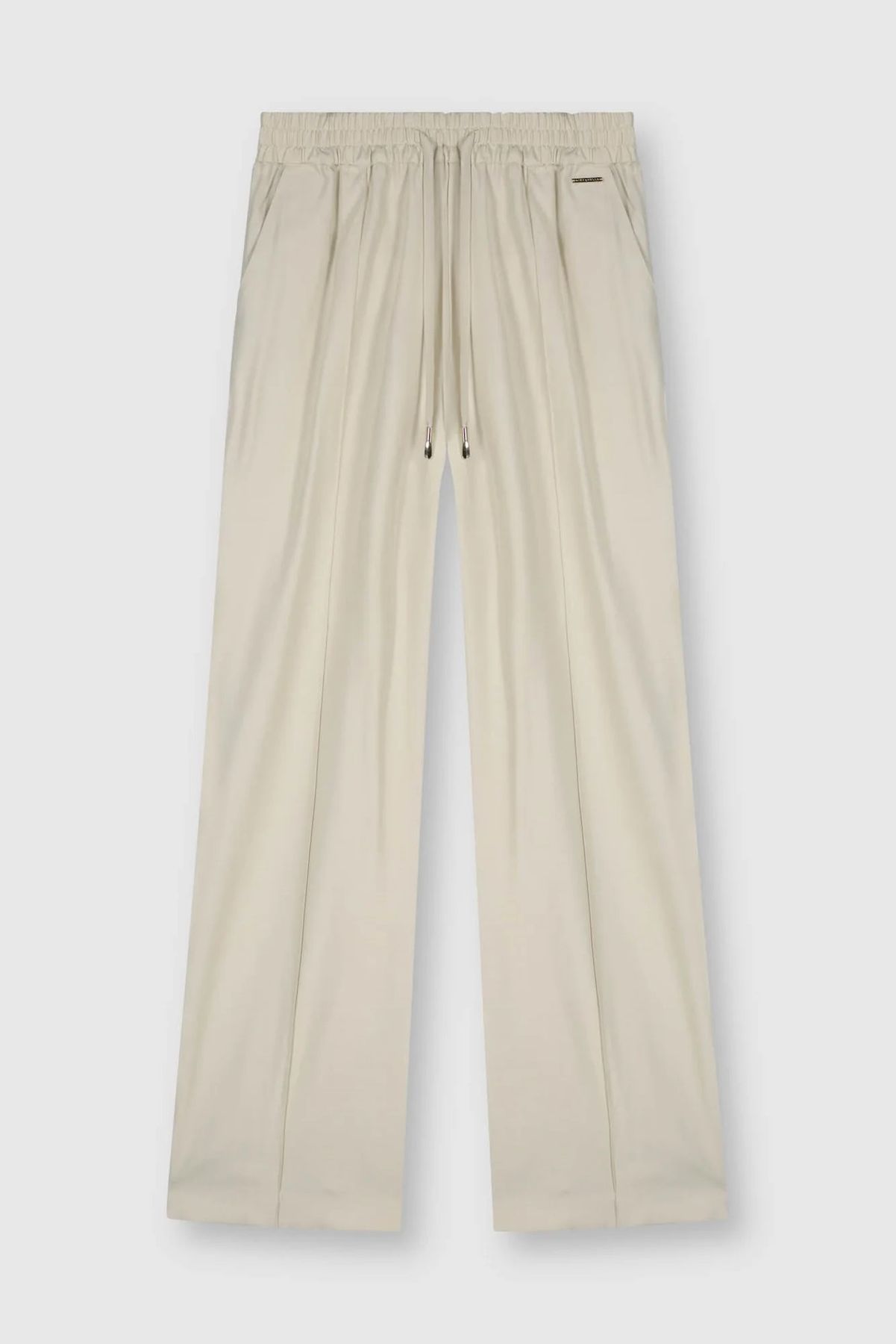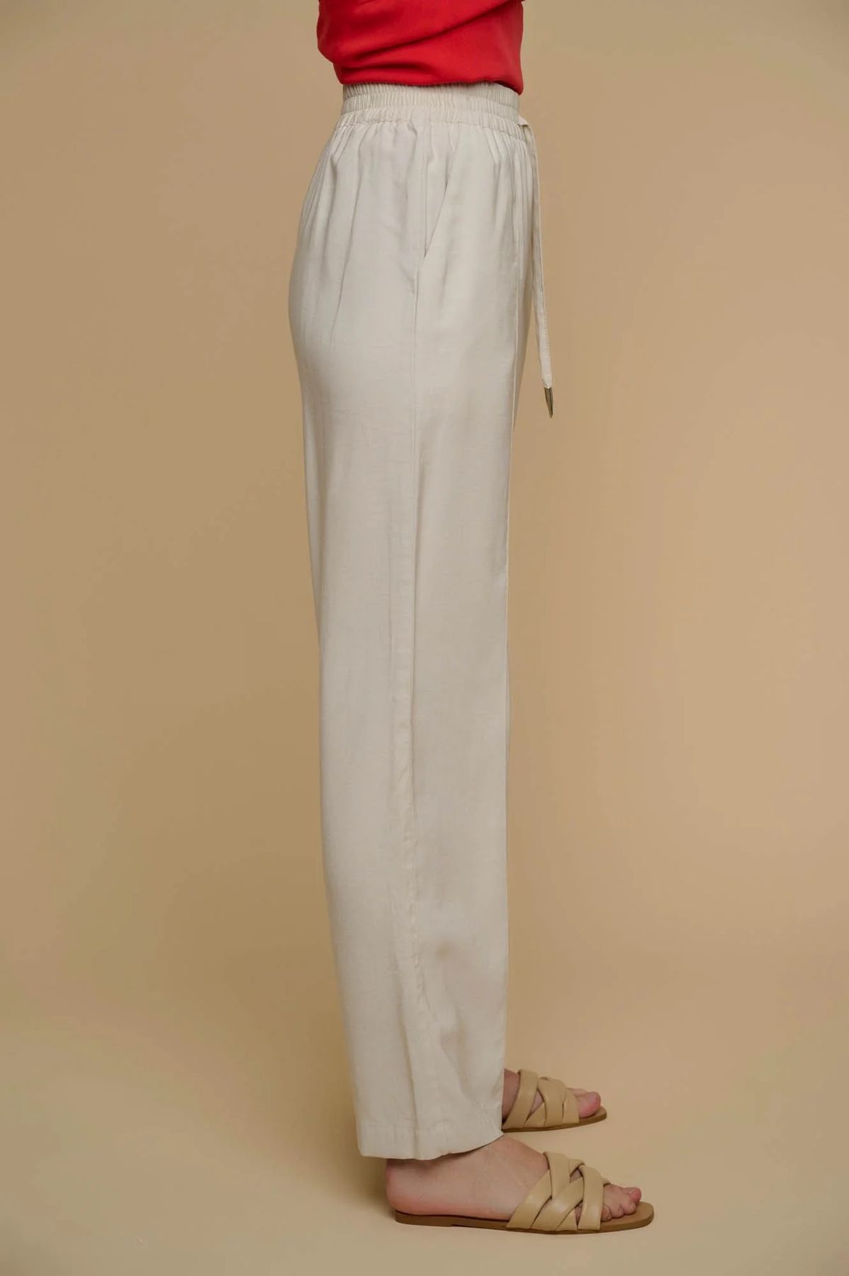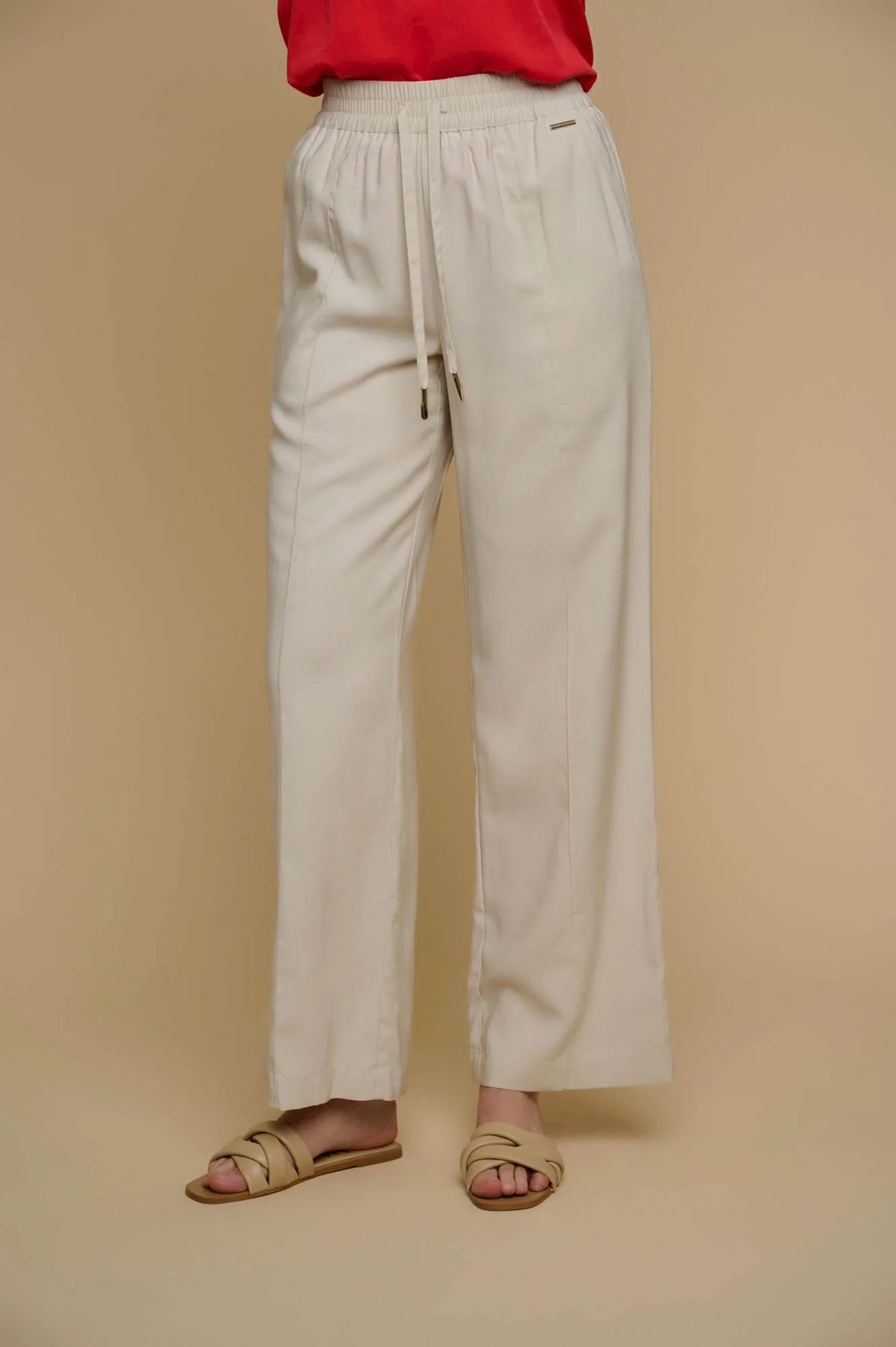 Pantaloni a gamba larga, leggeri. Caratterizzati da una vita alta con fascia elasticizzata con coulisse, due tasche laterali a fessura. Perfetto per un look estivo arioso!