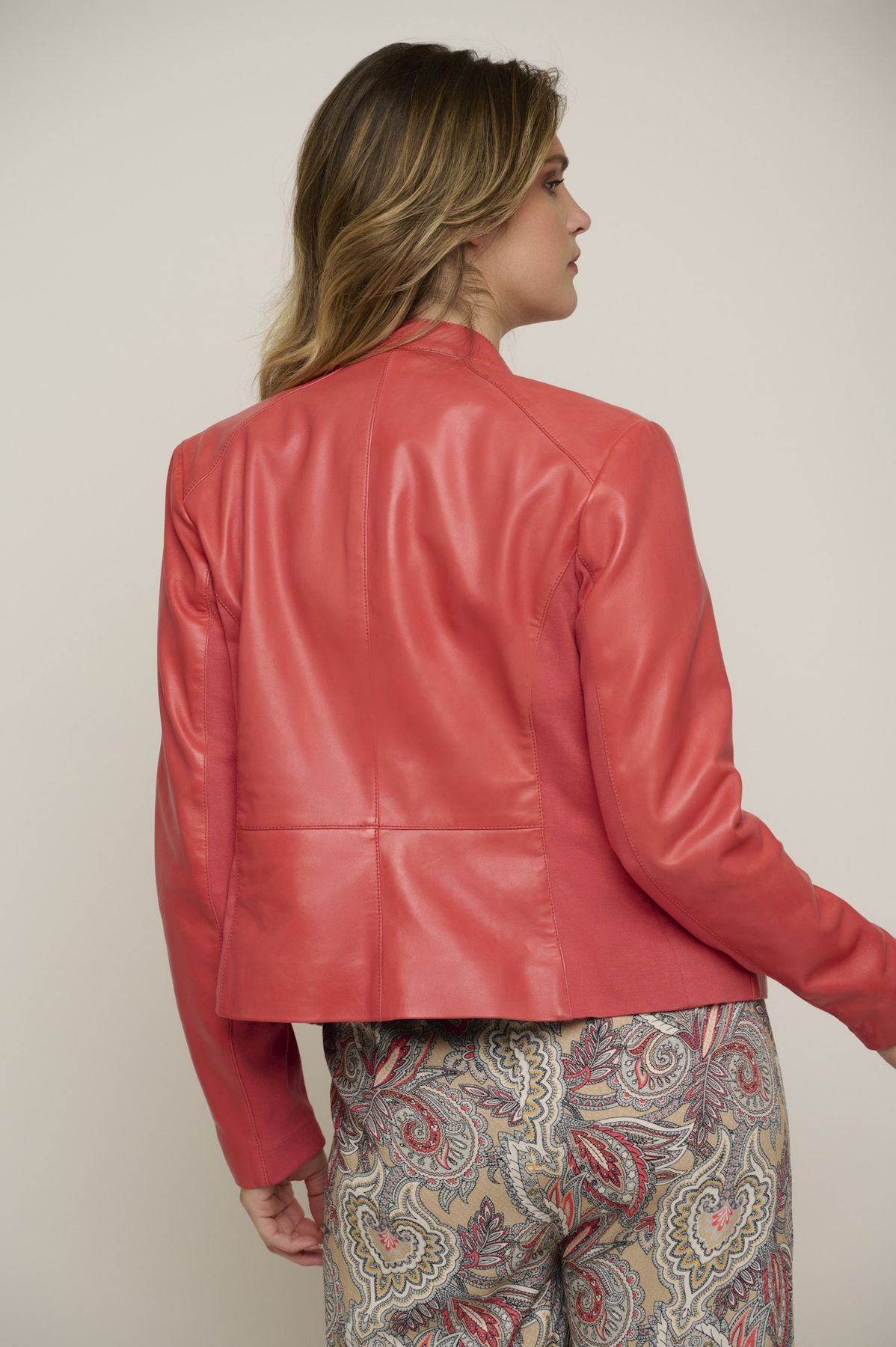Chiodo di pelle ed internamente foderato. Chiuso con la cerniera frontale e collo alla "coreana". Leggermente avvitato grazie alle cuciture sfondate sulla schiena, è perfetto sia con un jeans che con un vestitino casual.
