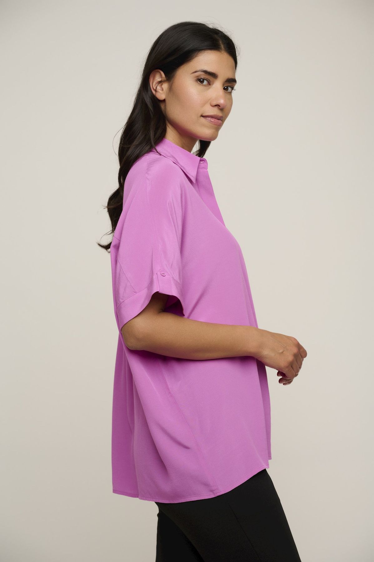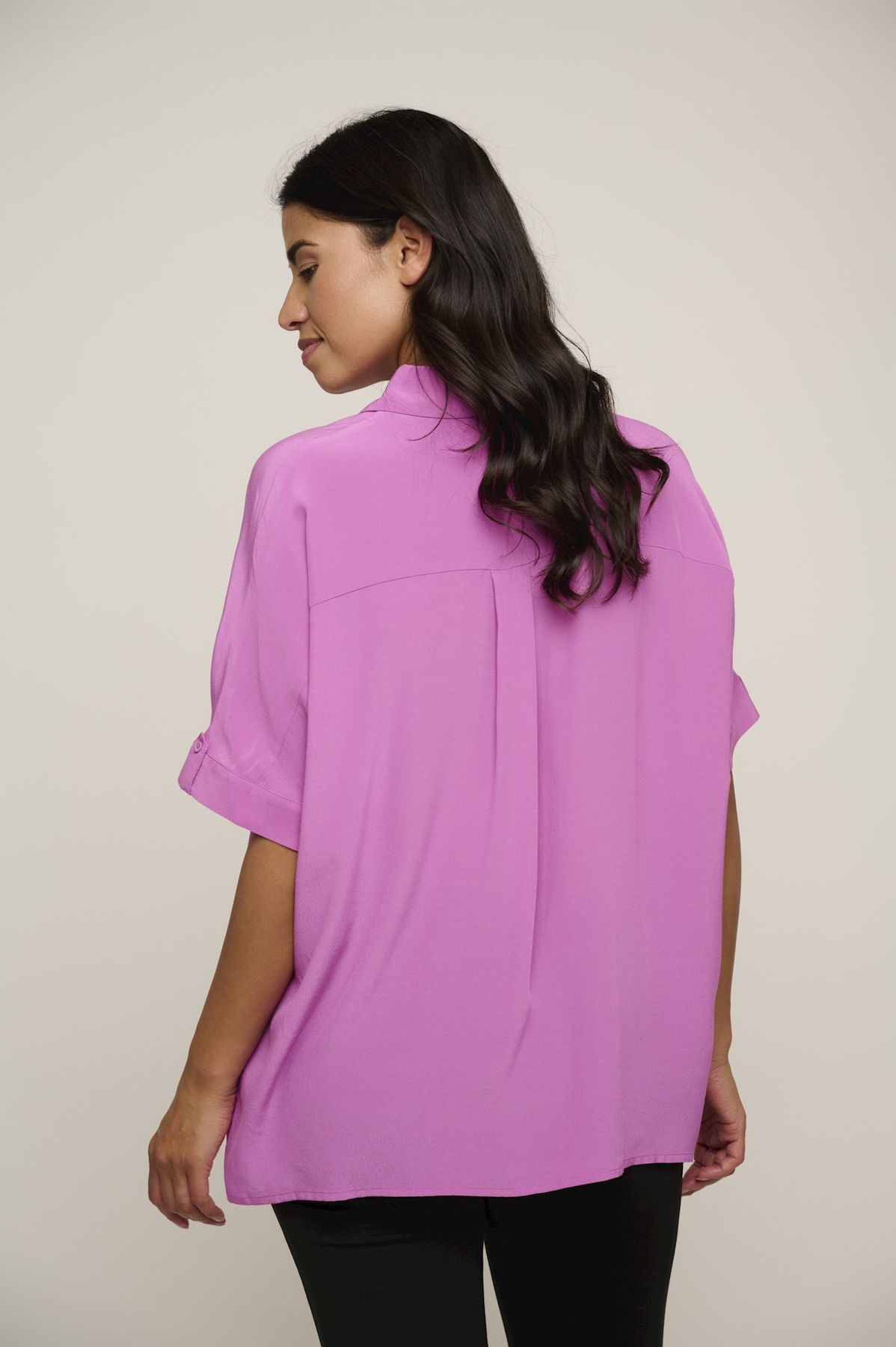 Camicia dal tipico colore primaverile, colletto e bottoni nascosti. Comoda la manica corta leggermente scesa che arriva al gomito così da coprire le rotondità e dare movimento alla silohuette. La modella è alta 180 cm ed indossa la taglia 38 (EU)