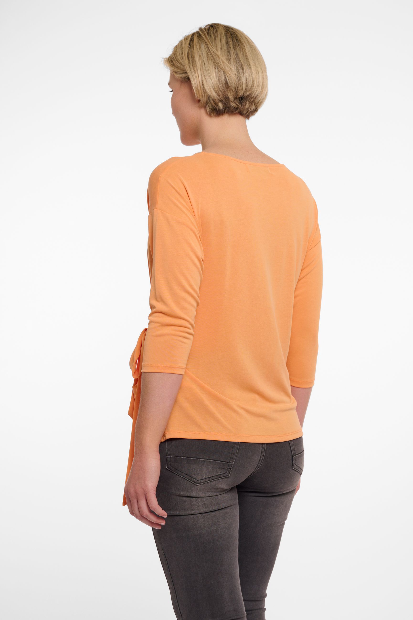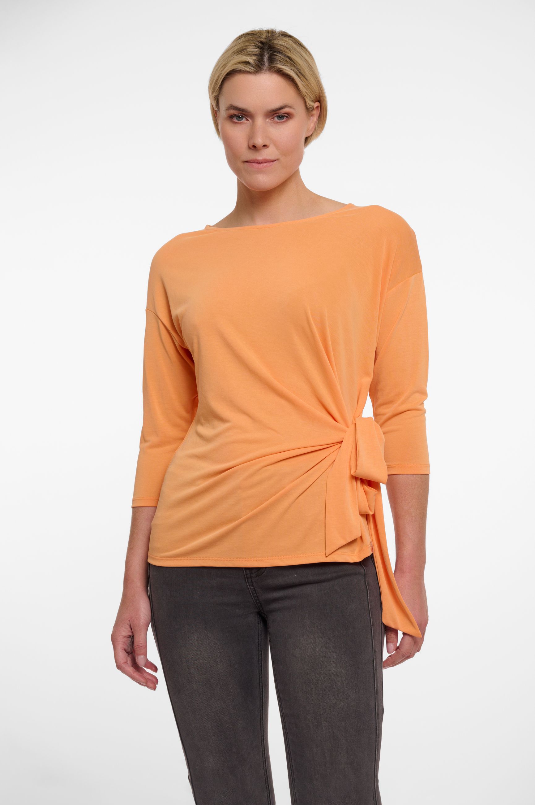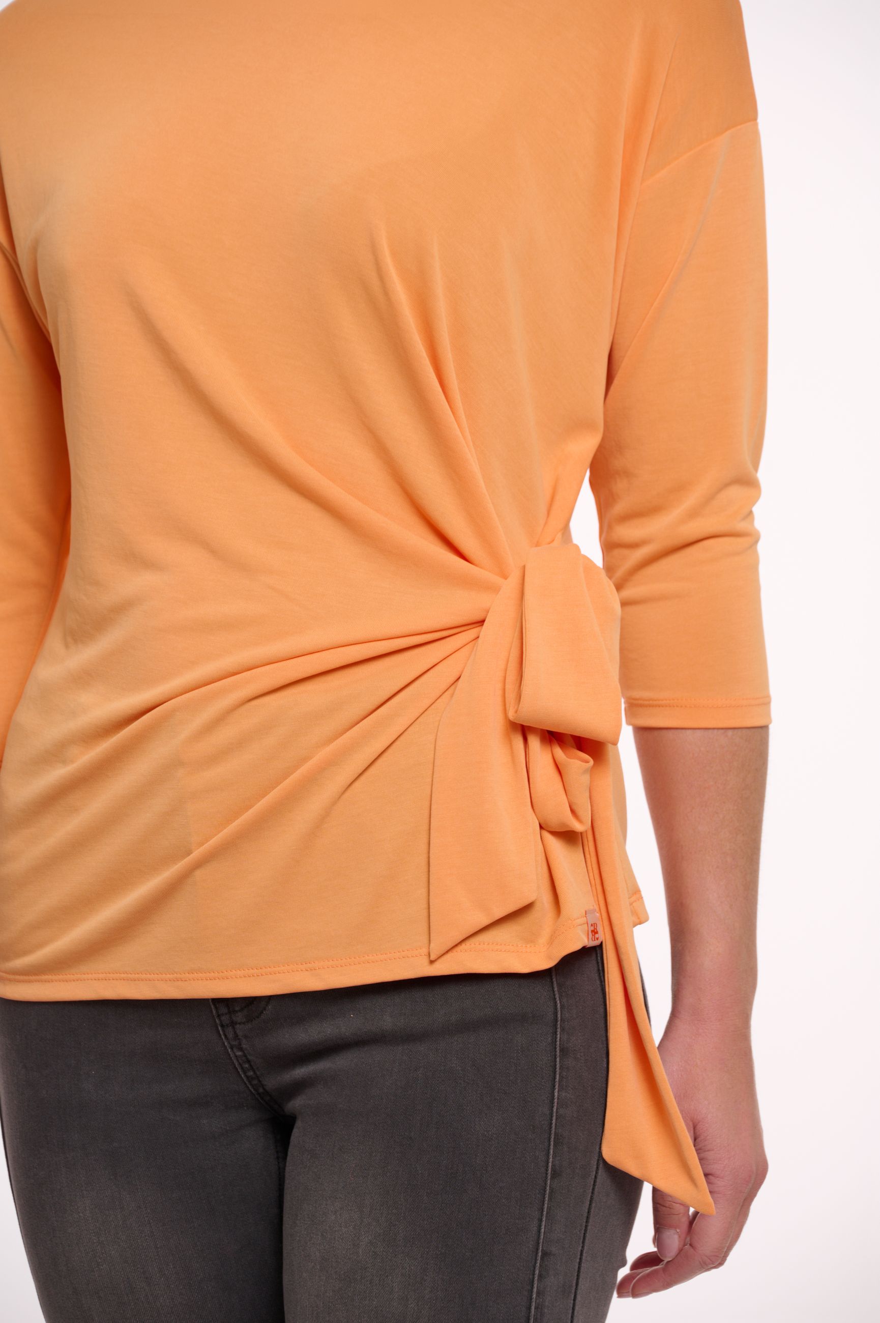 T-shirt dalla manica 3/4 in morbida maglina e con ampio girocollo. Bello e particolare il motivo del fiocco morbido sul fianco così per creare movimento e conferire all'intero look la giusta freschezza e modernità. Bella sia per outfit formali, da indossare come sotto giacca, che per quelli più casual con un denim e una sneakers.
