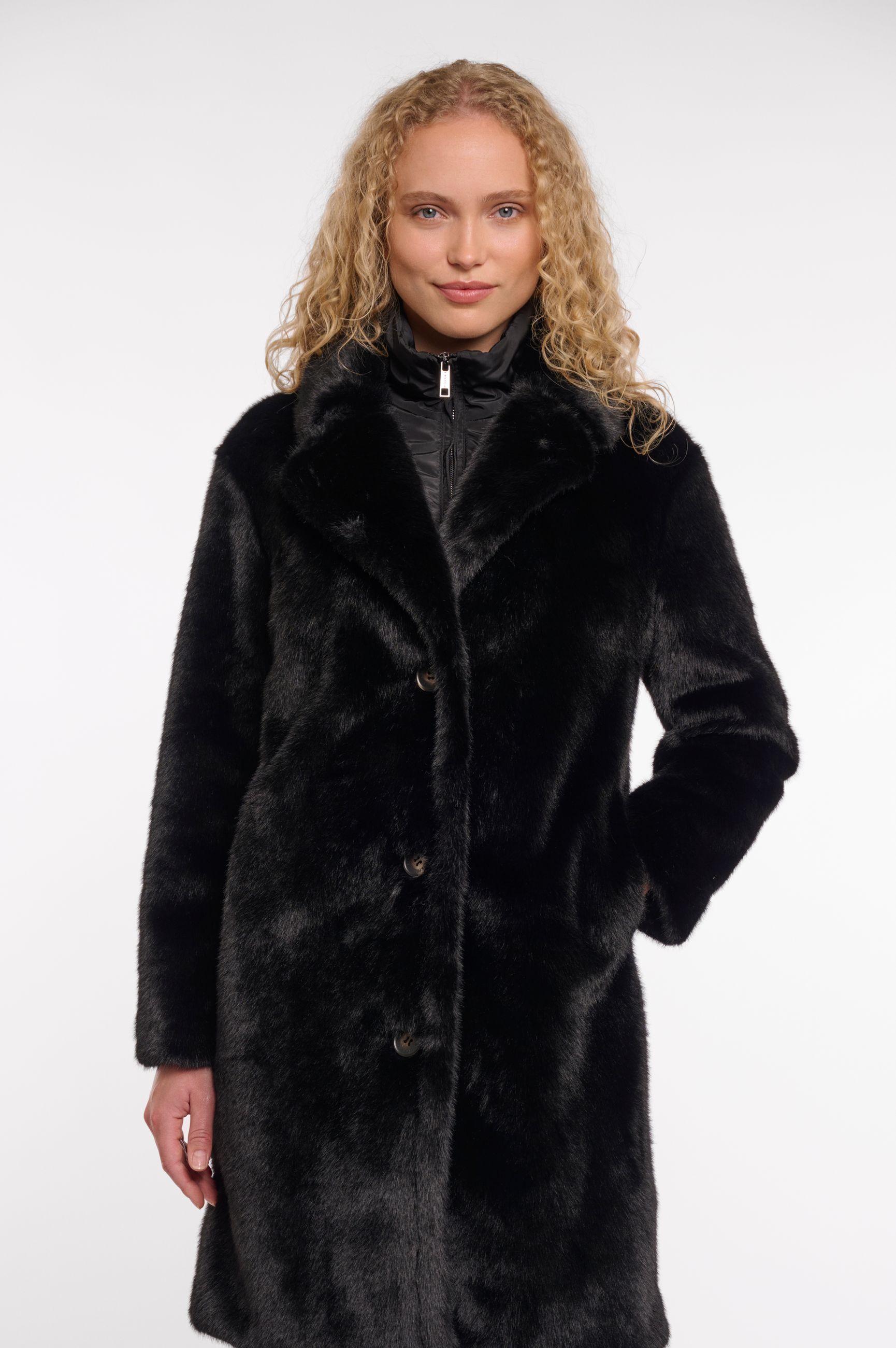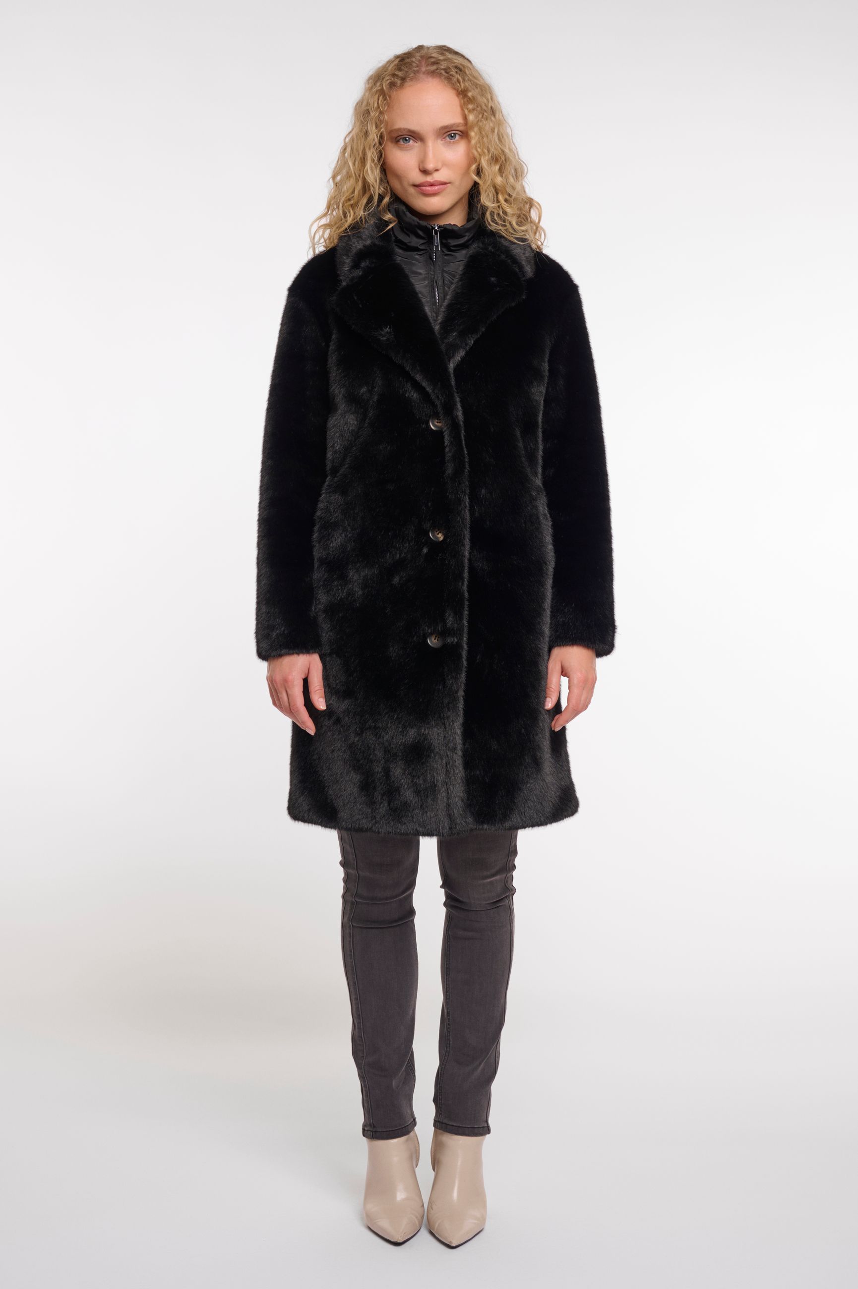 Cappotto monopetto in ecopelliccia chiuso sul davanti con bottoni, tasche all'americana felpate. La grande novità è la pettorina in morbido piumino sul davanti che chiusa con la cerniera ci consente di essere riparate dal freddo anche se lasciamo l'ecofour aperta. La si può anche sganciare del tutto.