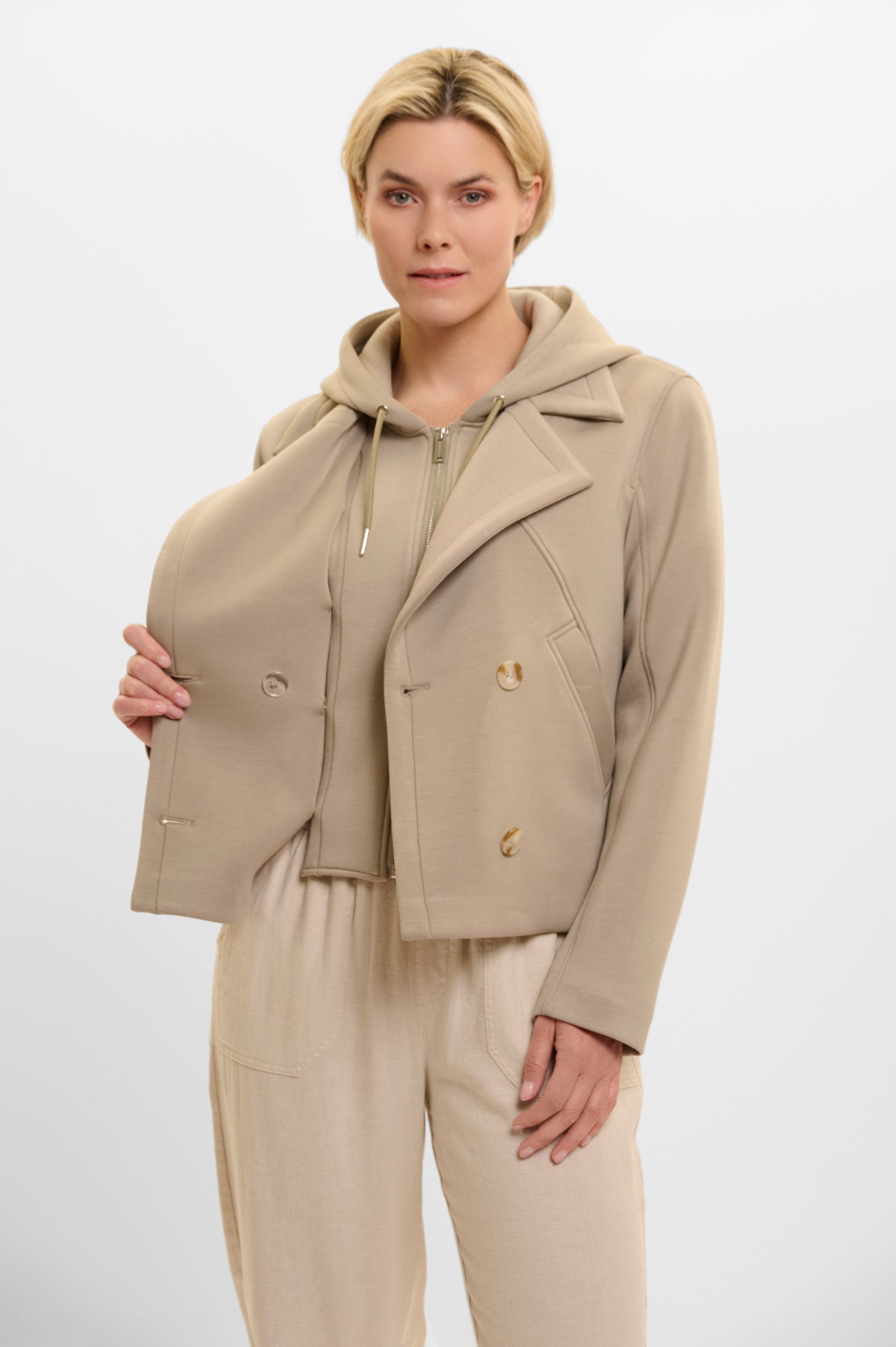 Felpa modello giacca doppiopetto chiusa internamente con cerniera. Cappuccio fisso e comode tasche laterali. Particolare e super givanile ben si adatta ad un look casual giornaliero.