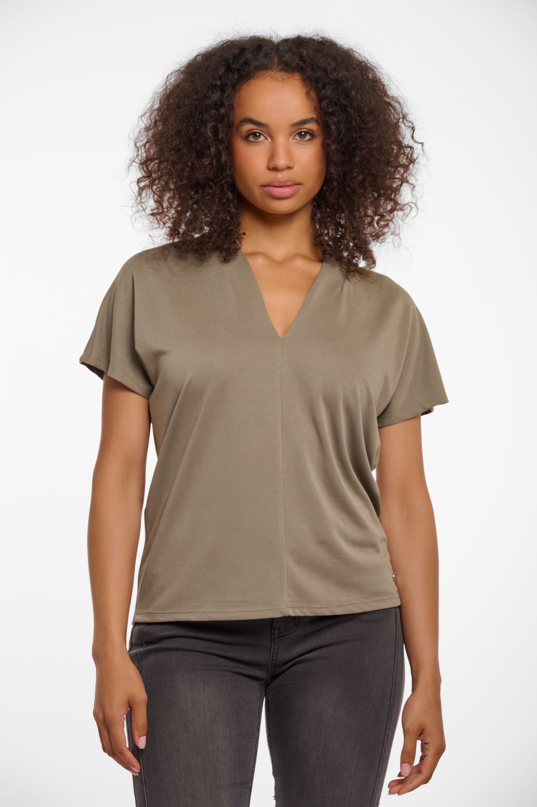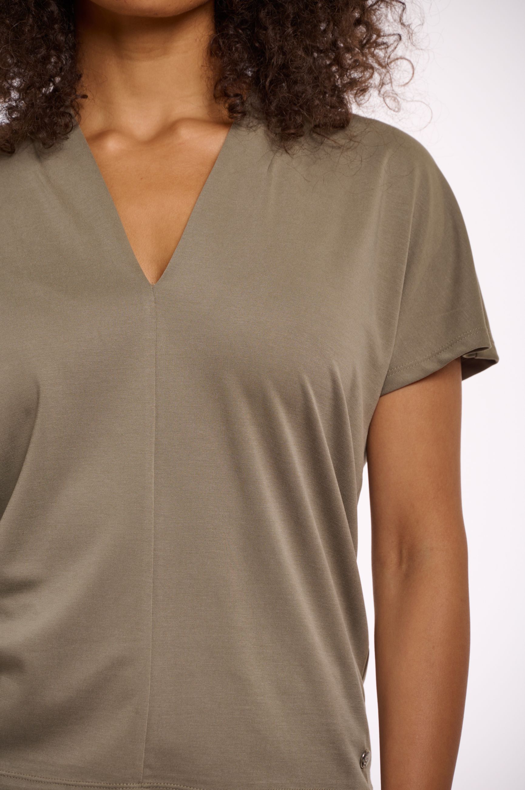 È la t-shirt base che ognuna di noi donne deve avere nel guardaroba. Si sposa perfettamente con ogni look sia casual che formale. Da indossare come capo principale nelle calde giornate estive o come sottogiacca. Morbidissima al tatto, bello e femminile lo scollo a 'V'.