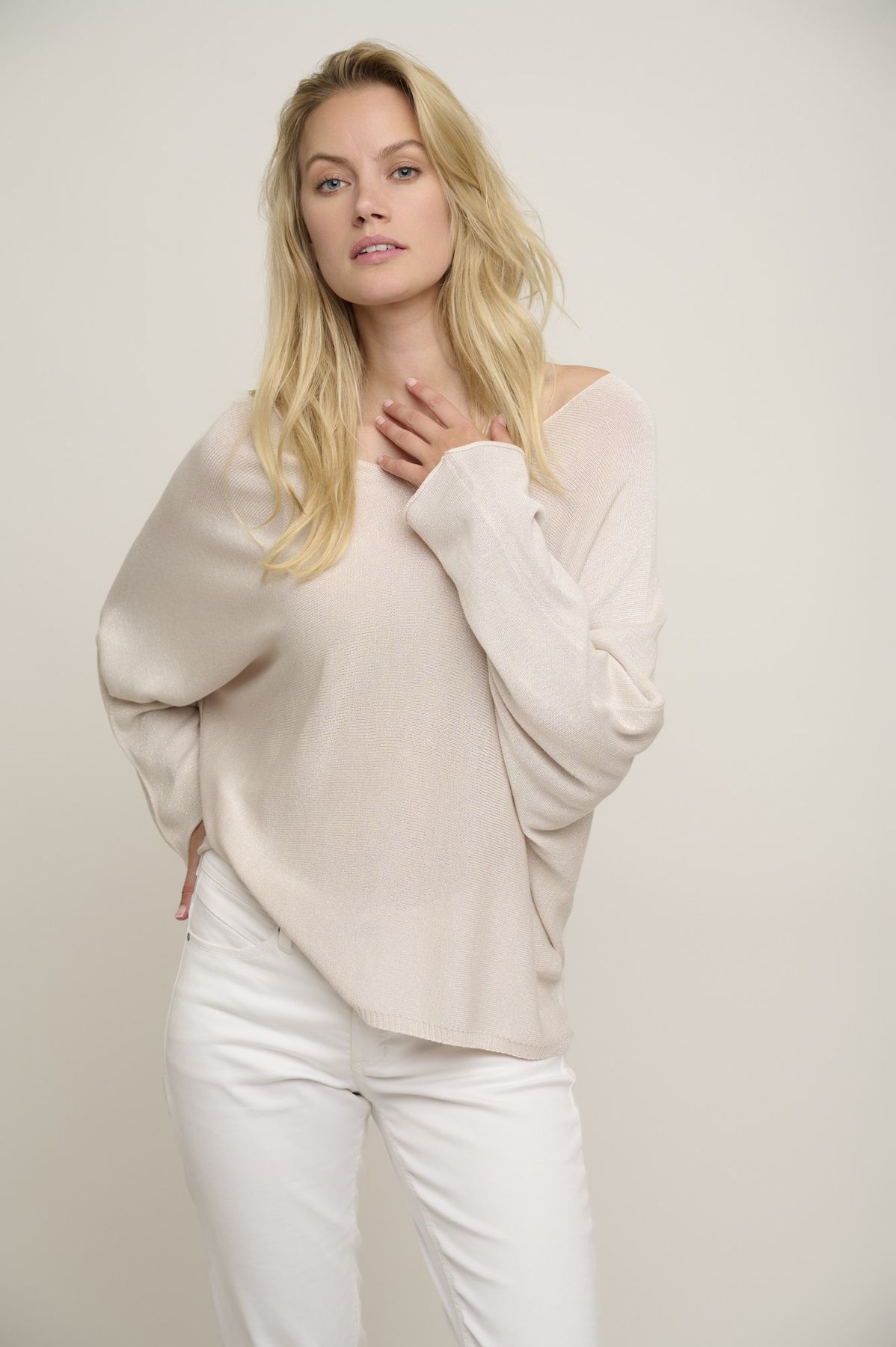Maglia girocollo con manica 3/4 leffetto morbido e sceso. Super luminosa grazie al leggero lurex che la rende adatta anche ad un outfit più elegante. Leggera da indossare anche come coprispalle.