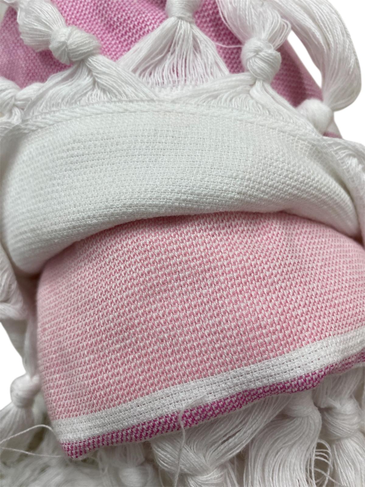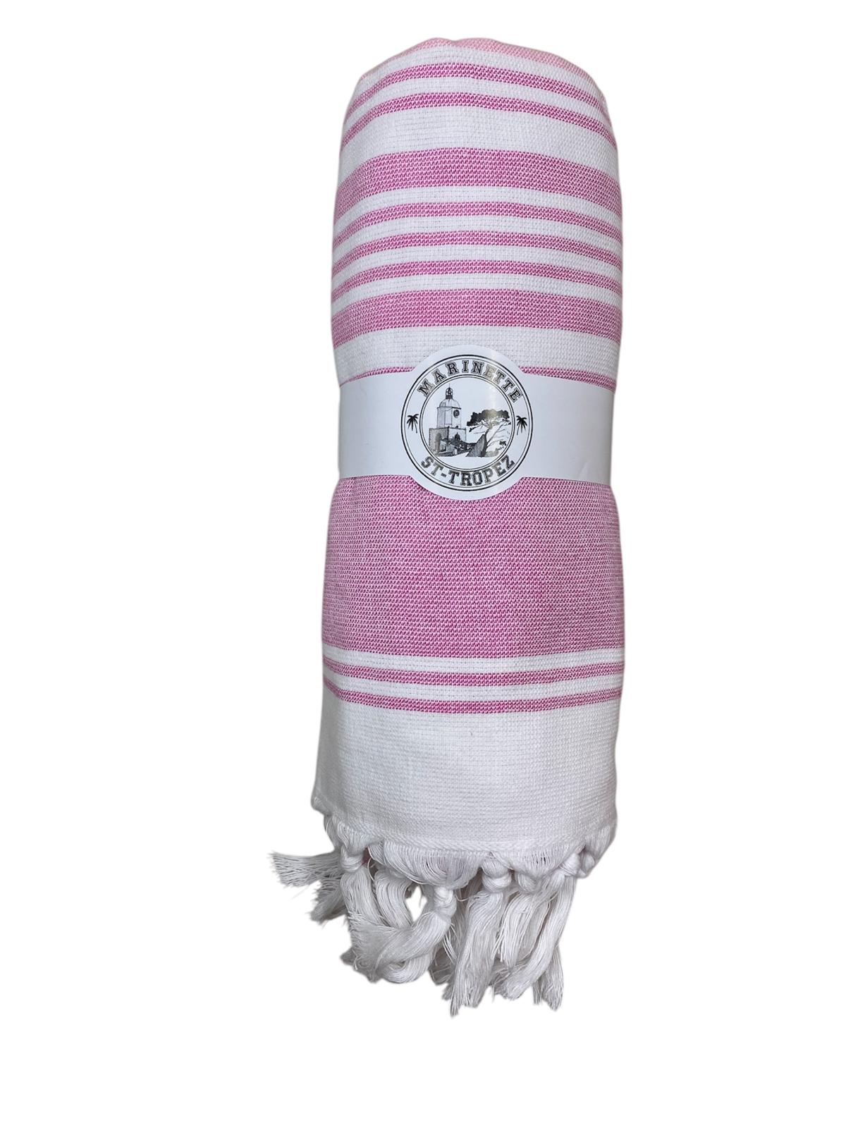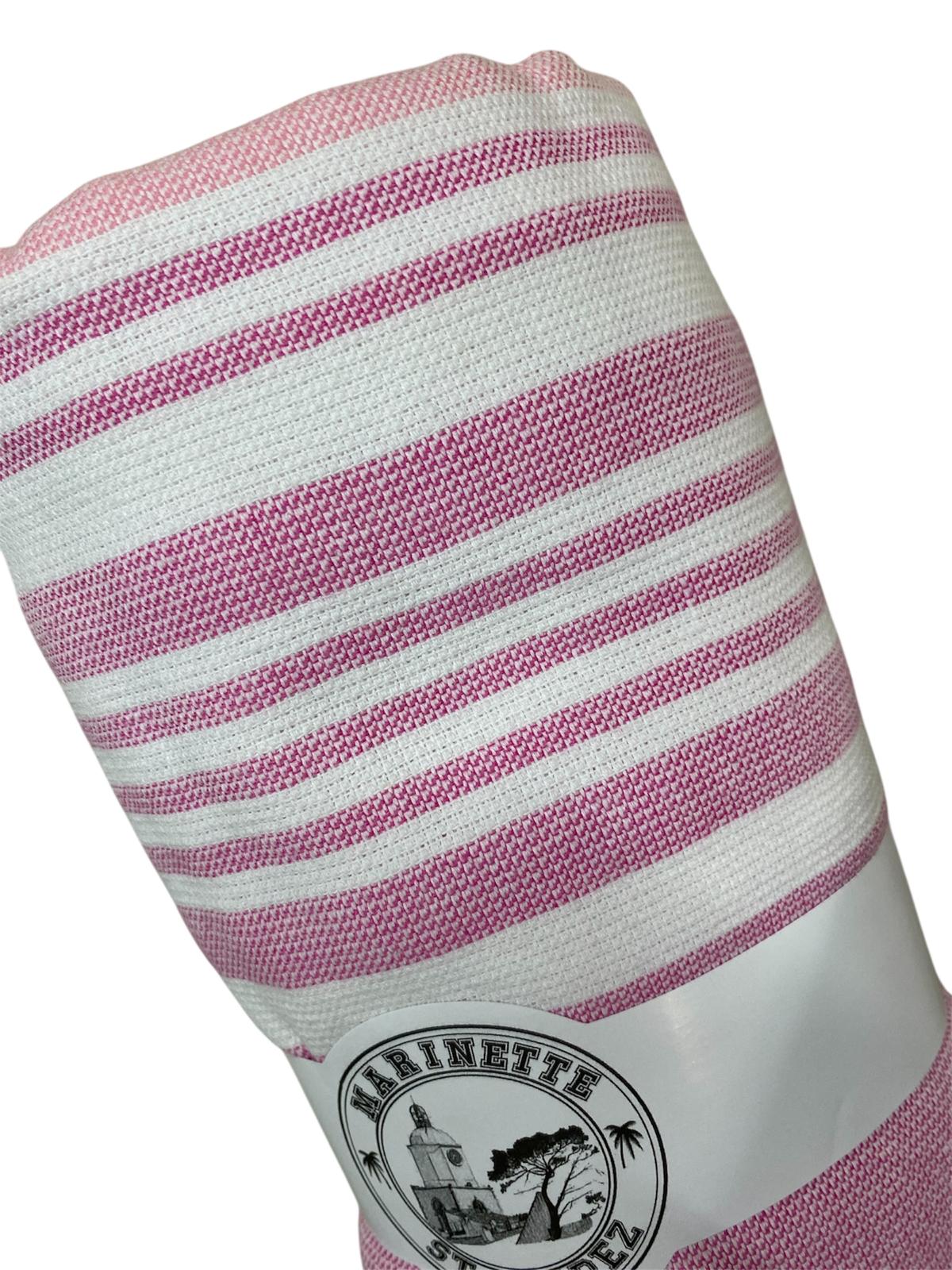 Telo mare con fantasia rigata e nappette sul bordo. Realizzato in doppio materiale: fouta di cotone 100% e microspugna, creando così un prodotto morbidissimo al tatto e dall'asciugarura veloce.