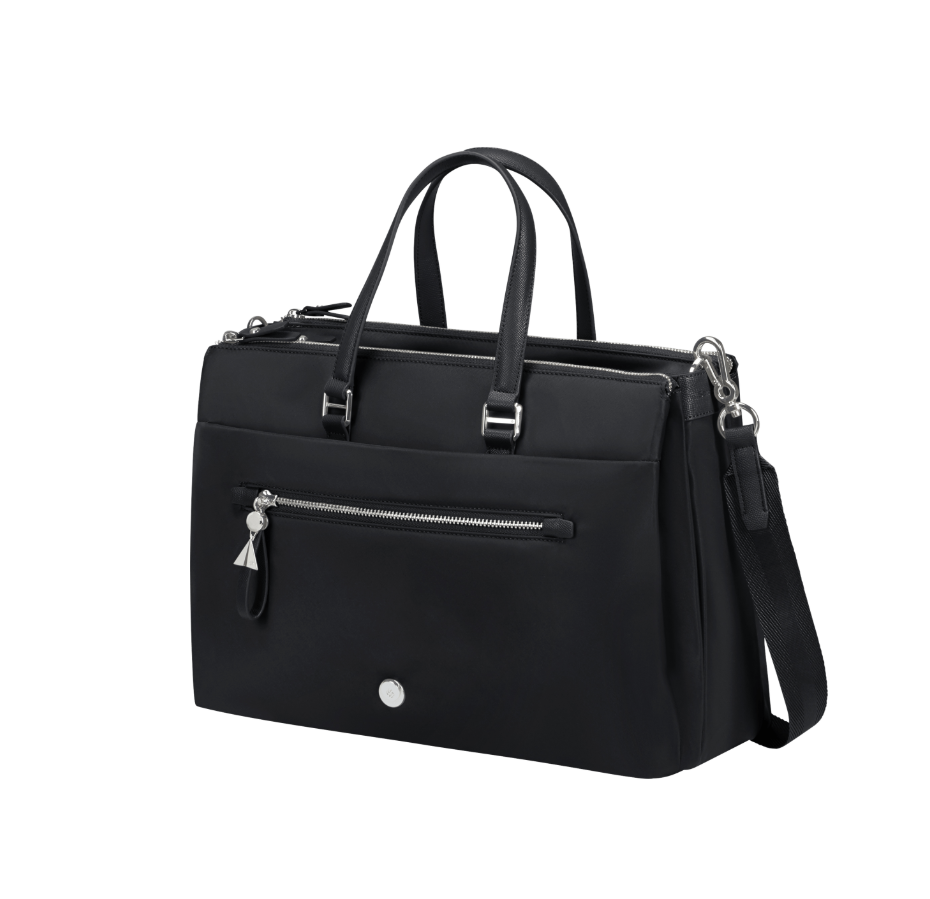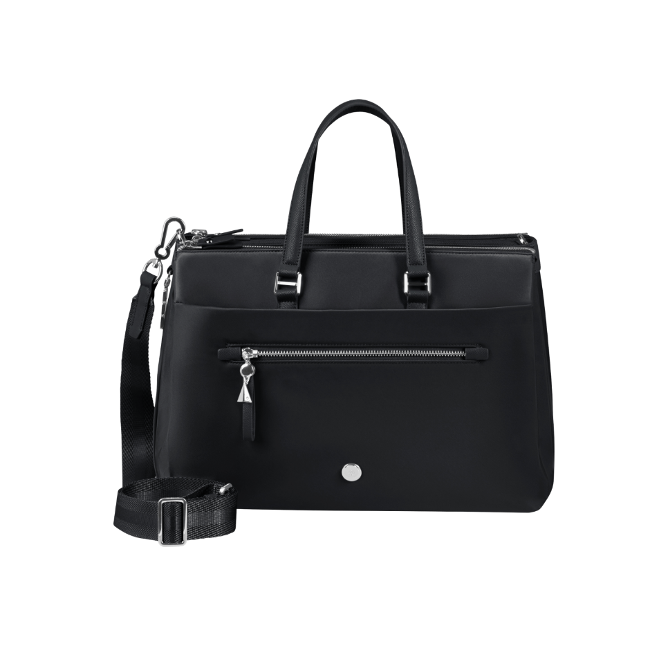Borsa ad uso cartella per il lavoro in tessuto nylon PET di ultra generazione; leggerissima ed impermeabile. Super femminile anche per il tempo libero da indossare a mano o a spalla grazie ai manici e alla tracolla regolabile. Chiusa da tre cerniere superiori che la rendono internamente suddivisa in tre scomparti ben organizzati per per il porta pc da 14.1"; numerosi taschini interni per penne, smartphone e tutti gli accessori office. Comoda mini zip sul davanti e fascia su retro per il trolley.