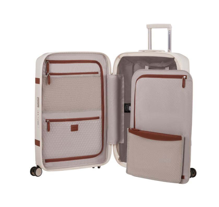 Trolley policarbonato chiuso da cerniere, taglia M 69/25 EXP. Internamente suddivisori staccabili. Traino in alluminio, doppie ruote con sistema 360°. Chiusura con combinazione TSA.
