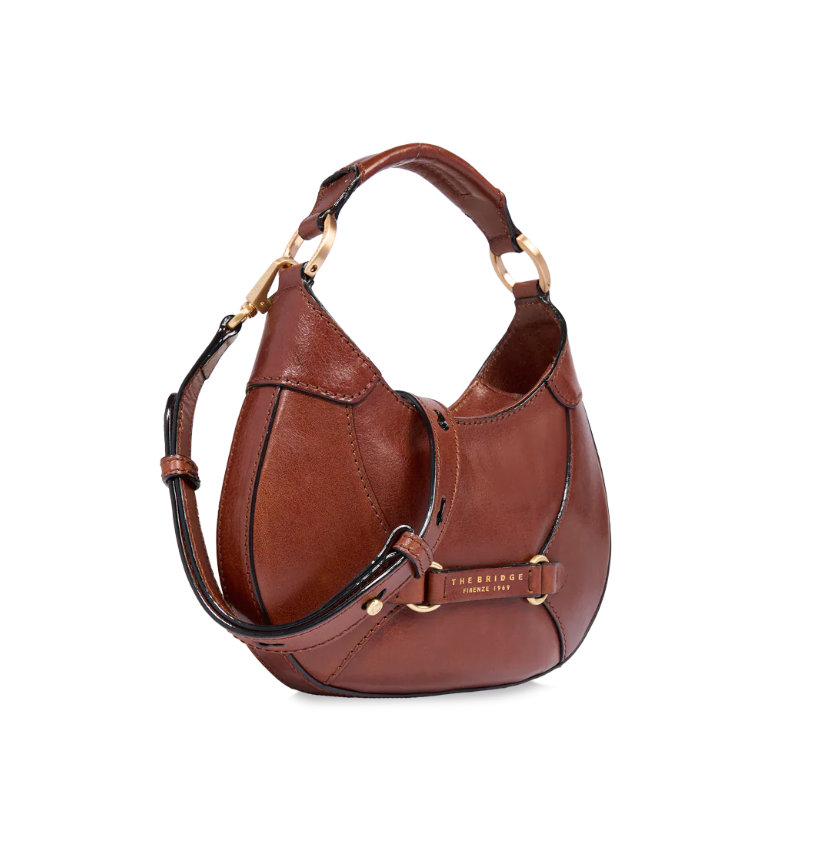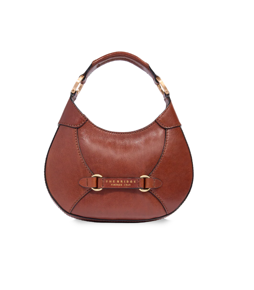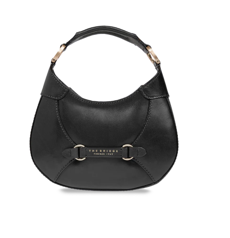 Borsa in cuoio, modello minihobo, chiusa con zip. Particolare il motivo decorativo del doppio anello sul davanti. Da indossare a mano per un look più "bon-ton" oppure con la tracolla regolabile per un look più casual e smart.