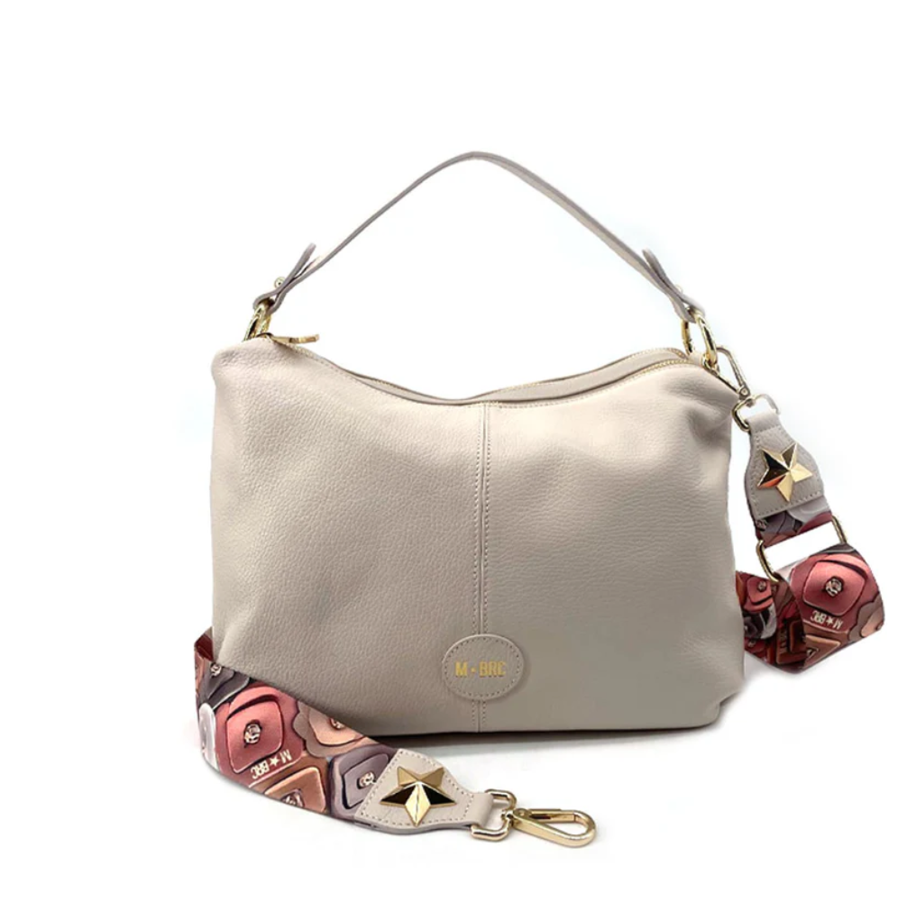 Borsa in pelle martellata, Made in Italy, modello hobo pensato per la donna che cerca un accessorio sofisticato ma estremamente pratico, capace di adattarsi a ogni momento della giornata. Chiusa con doppie cerniere superiori, ha ben tre tracolle intercambiabili: una corta da spalla e una lunga regolabile da crossover bag (entrambe in pelle), la principale in tessuto multicolor regolabile. Il carattere distintivo di questa borsa risiede nel suo gioco di contrasti e nella sua multifunzionalità. La silhouette morbida e i dettagli particolari consentono un uso giornaliero adatto ad un look casual chic.